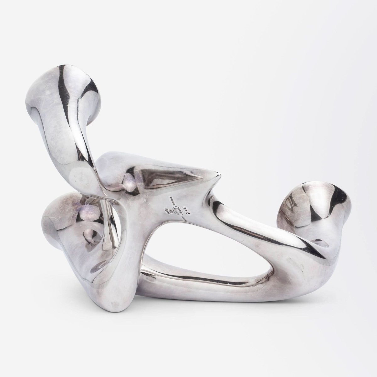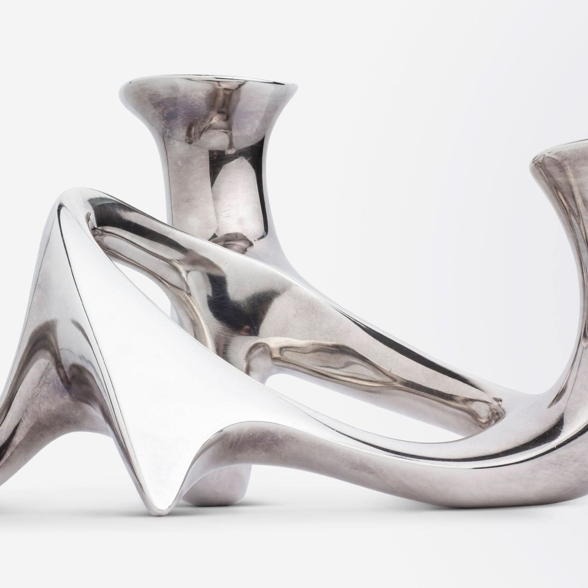 A modernist sterling silver candelabra with an organic, sculptural form designed by Henning Koppel (1918-1981) for Georg Jensen in 1946 entitled #956. This was Koppel's first hollowware design for Georg Jensen and was quite a radical departure for the company not only for its form but also for its production. Jensen, at that time, had only produced silver pieces by methods of hand hammering whereas #956 was crafted using the casting method. The candelabra features three arms over differing heights and sits atop three feet. Although not oversized, at 1226 grams it is quite a substantial piece. It is hard to date the piece because Jensen hallmarks changed very little after 1945, however, the previous owner of this piece had a small sticker on the bottom with '1962' written on it, inclining us to believe it was manufactured in the 1960s.