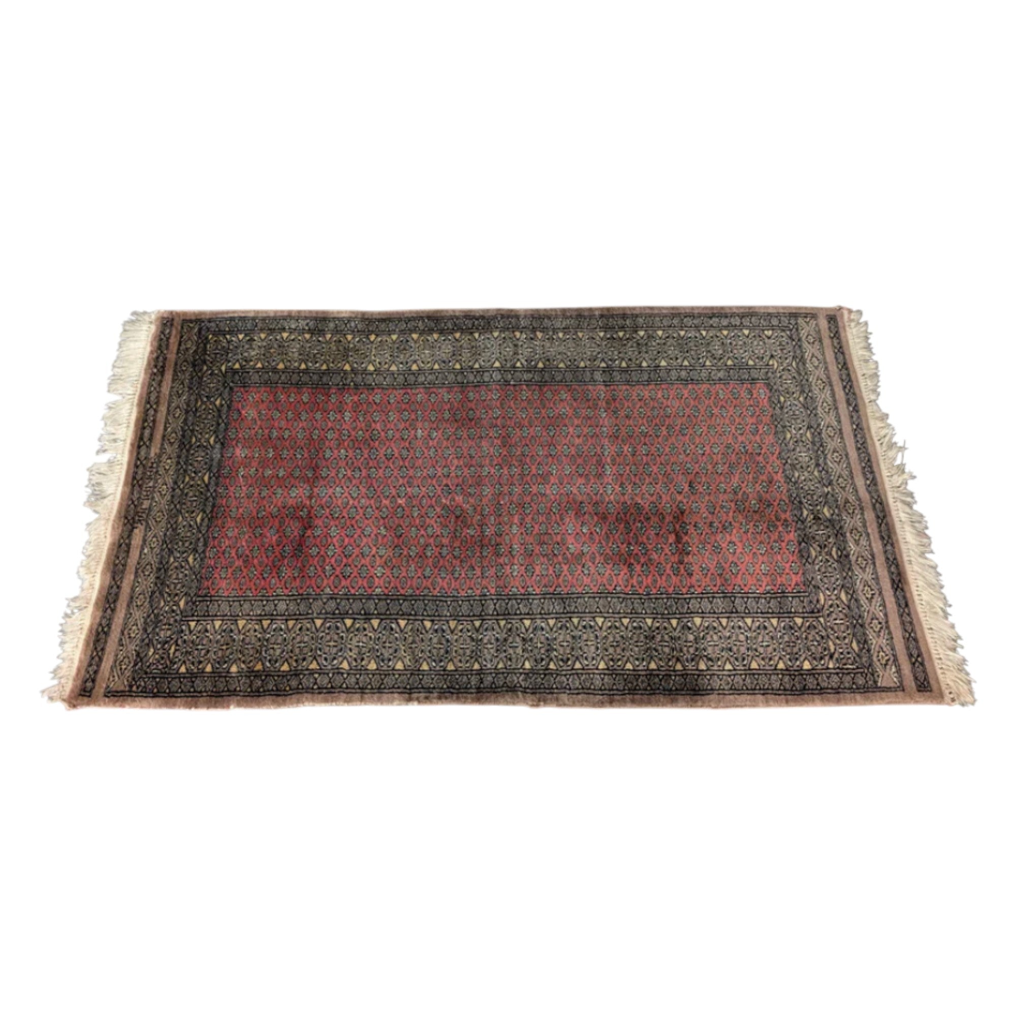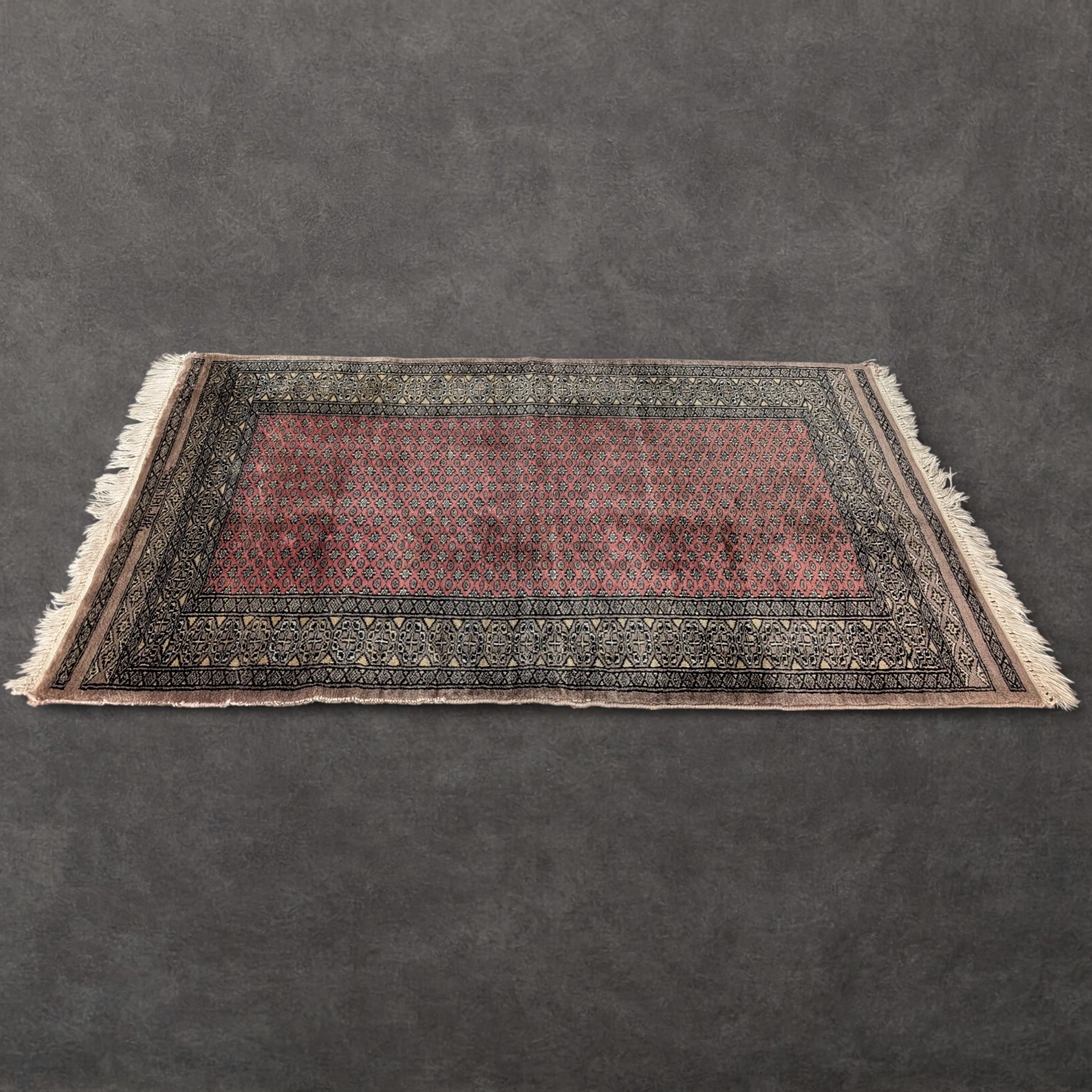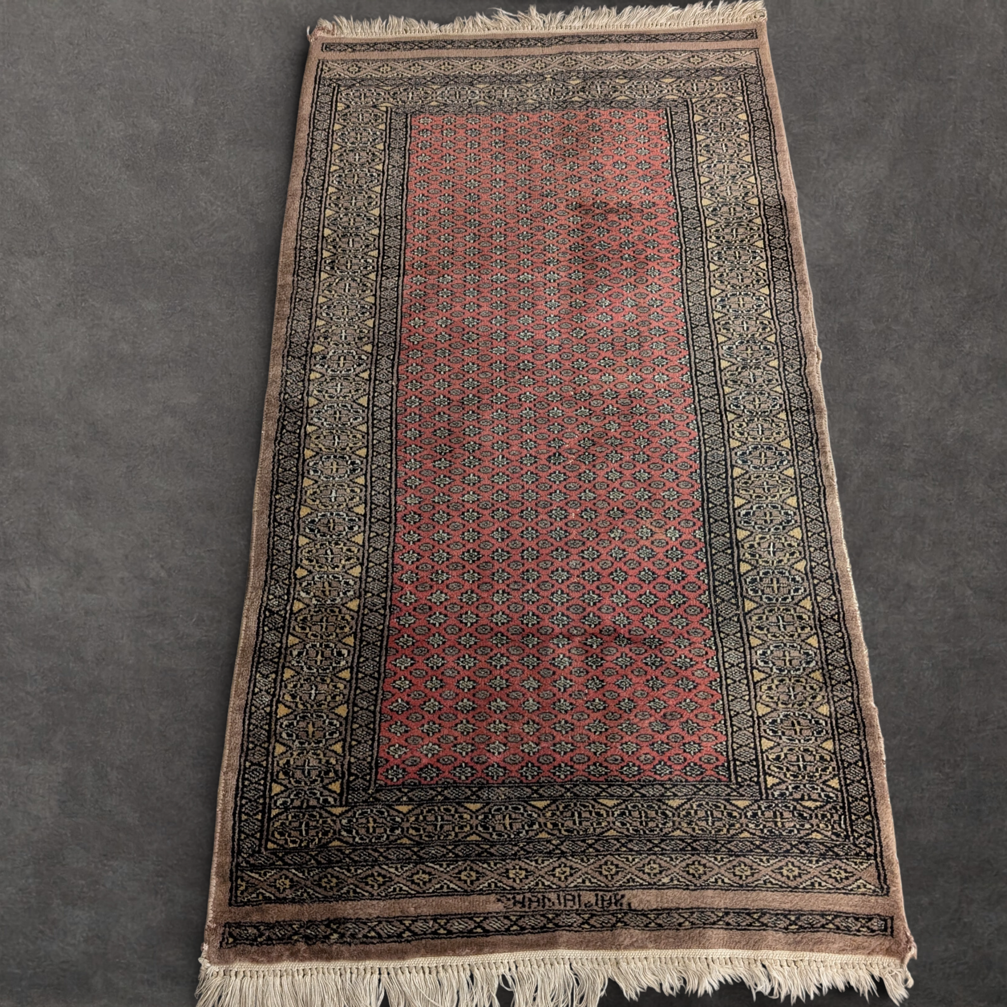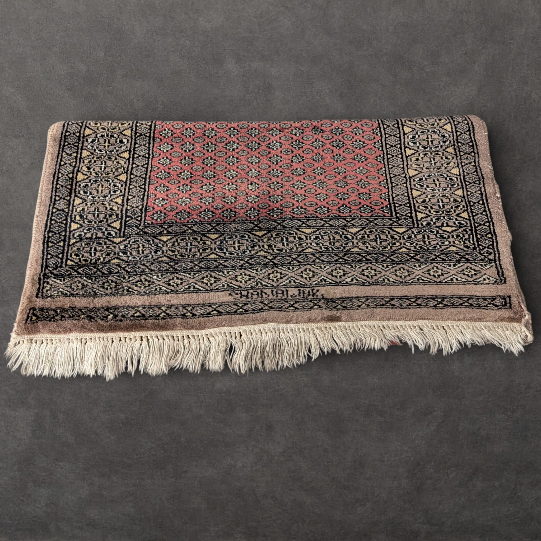 Handwoven in Afghanistan for individual devotional use, this prayer rug follows a traditional Bokhara-influenced layout, with a disciplined central field framed by dense geometric borders. The fine wool carries a soft, slightly silky hand feel associated with northern Afghan weaving, consistent with traditional dye practices. A woven script motif appears at one end, inspired by Arabic calligraphic forms and used symbolically rather than as literal text. Modest in scale and exacting in detail, it holds cultural purpose while translating seamlessly into contemporary interiors as a grounded textile object.