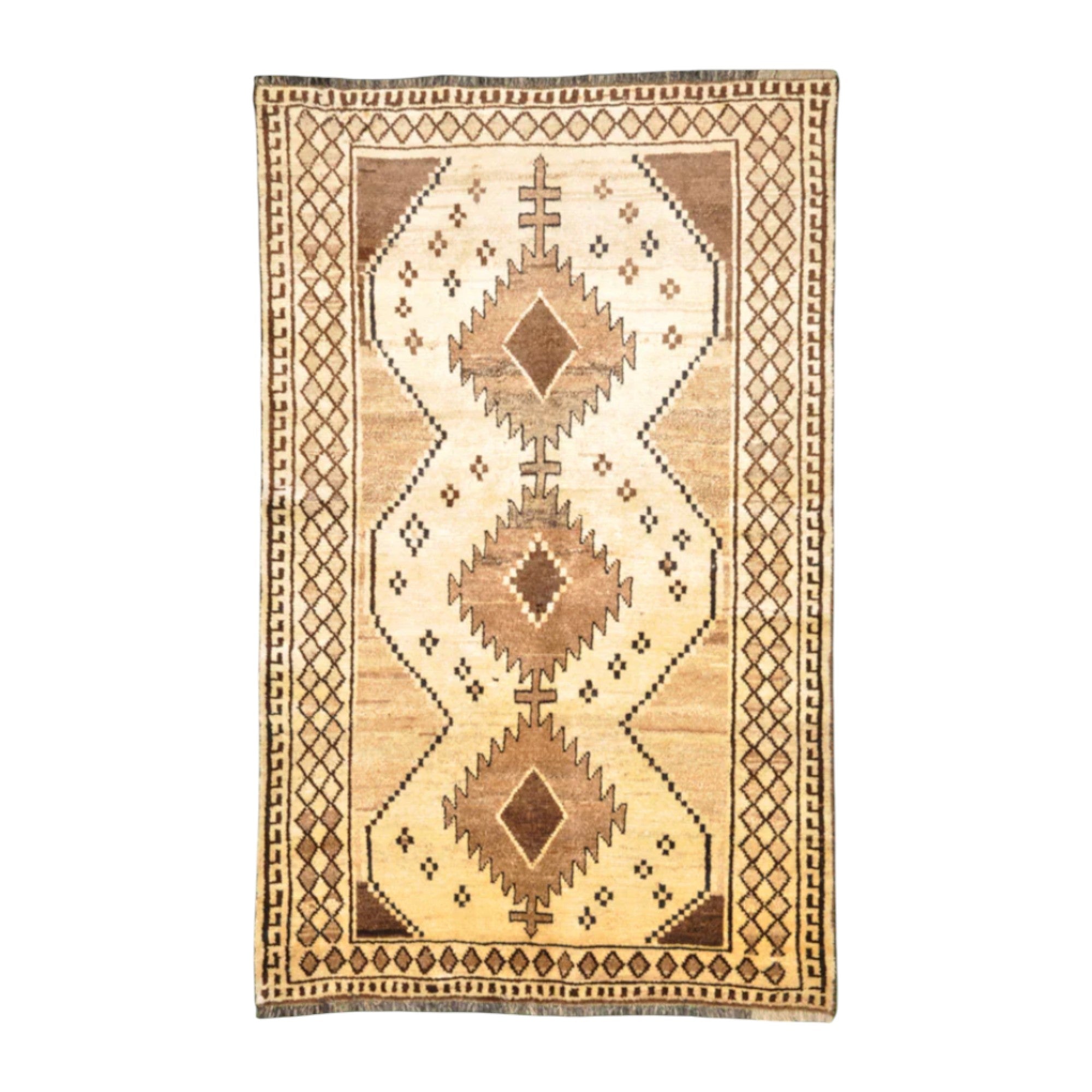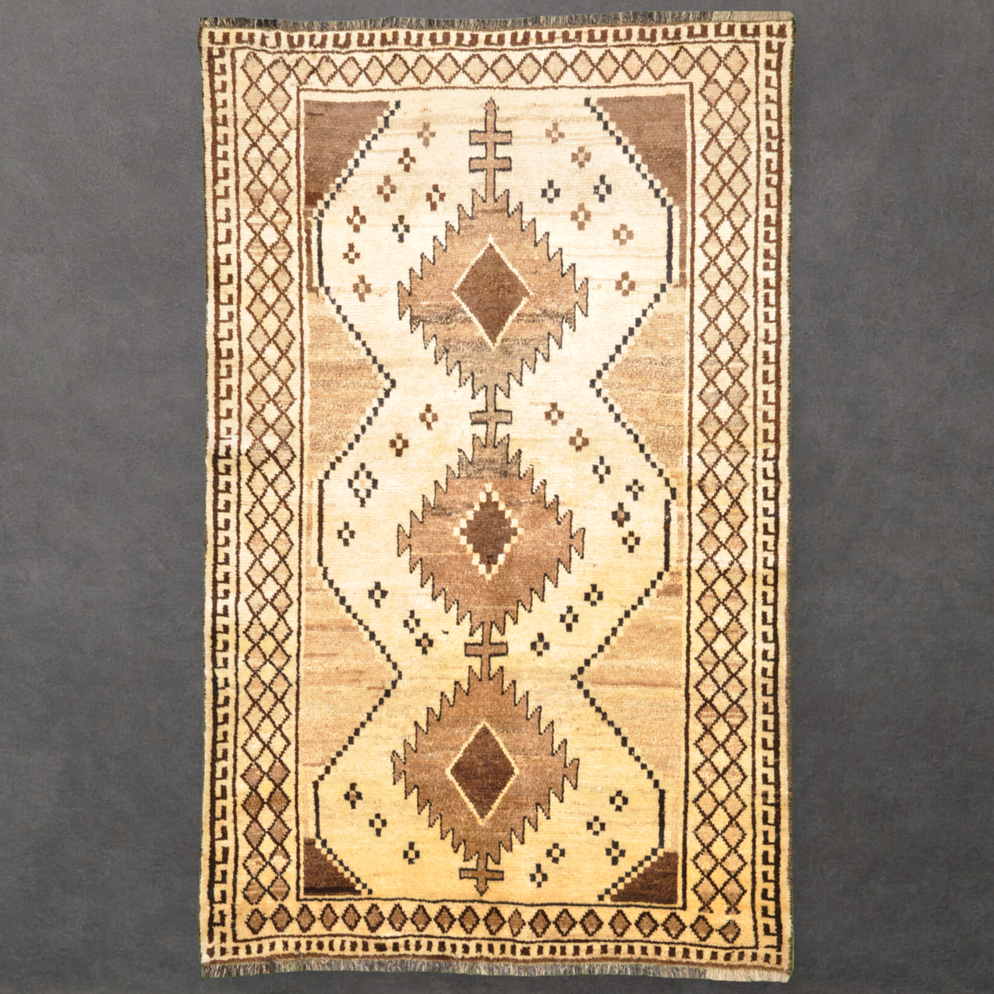 Woven by nomadic communities in Persia during the mid twentieth century, this Gabbeh rug reflects a tradition of handspun wool, hand dyed fibres, and intuitive geometric composition. The field is organised around bold lozenge medallions and stepped forms, framed by a tightly worked border that anchors the composition without ornamental excess. Gabbeh rugs were produced for domestic use rather than export, prioritising durability, warmth, and symbolic patterning over refinement. The natural palette of sand, camel, and umber tones gives the surface a grounded, settled presence that reads comfortably in both architectural and lived in interiors.