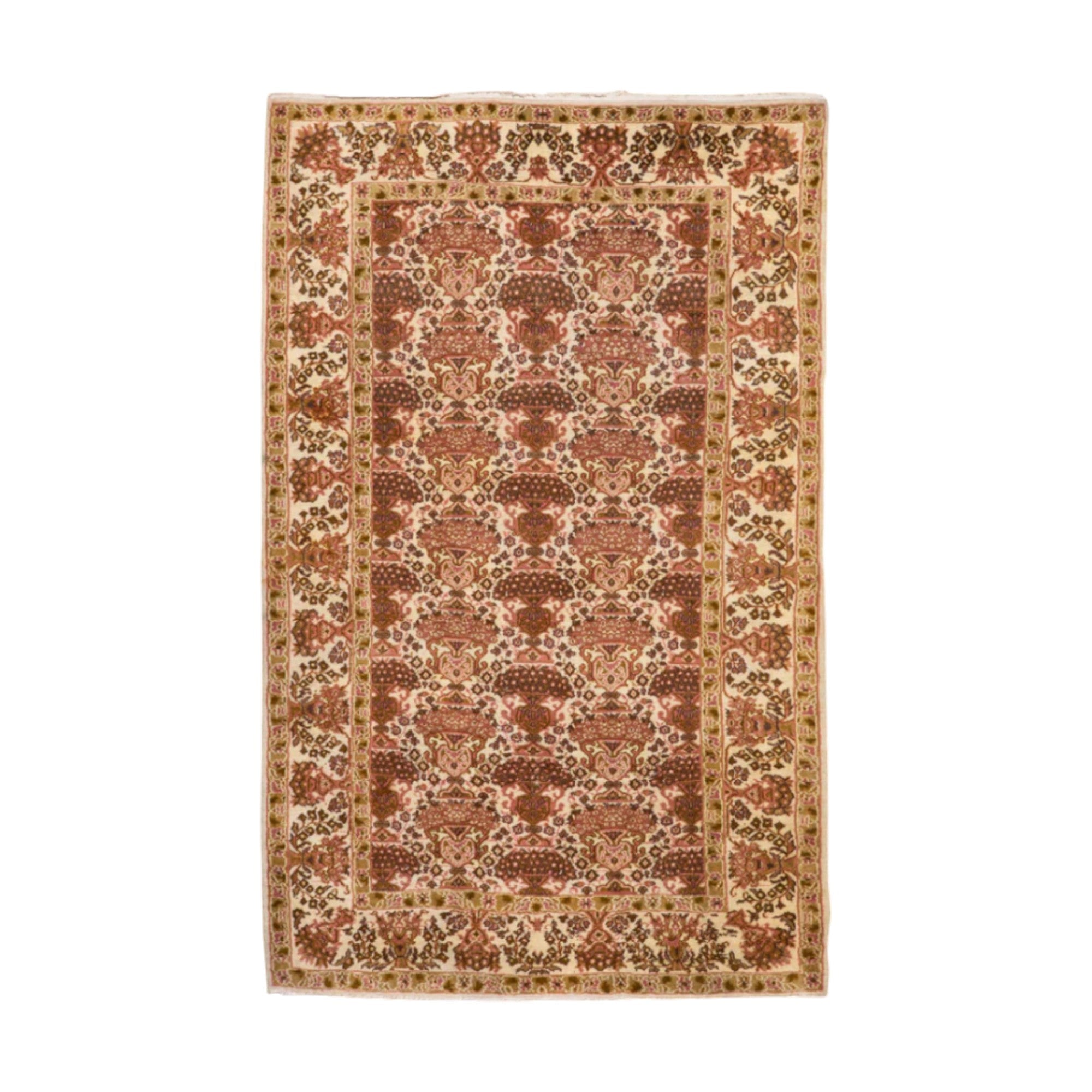 Woven in Kerman, Iran circa 1970, this rug is produced in handspun wool using traditional handweaving techniques associated with the region’s long established carpet workshops. The repeating boteh and floral motifs sit within a balanced field and border composition, reflecting Kerman’s emphasis on rhythm, density, and decorative clarity rather than narrative scenes. The palette moves through warm reds, muted rose, olive, and soft ivory, allowing the pattern to register with depth rather than contrast. It brings structure, warmth, and visual continuity to a space, grounding furniture arrangements without overpowering them.