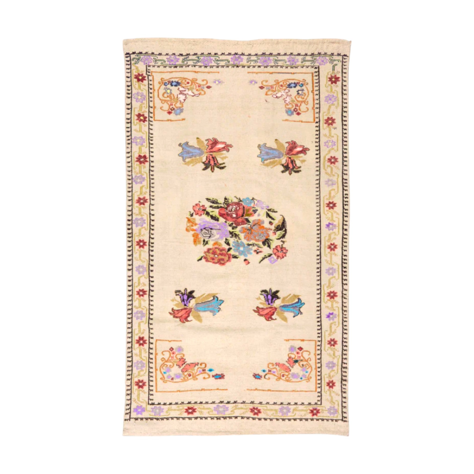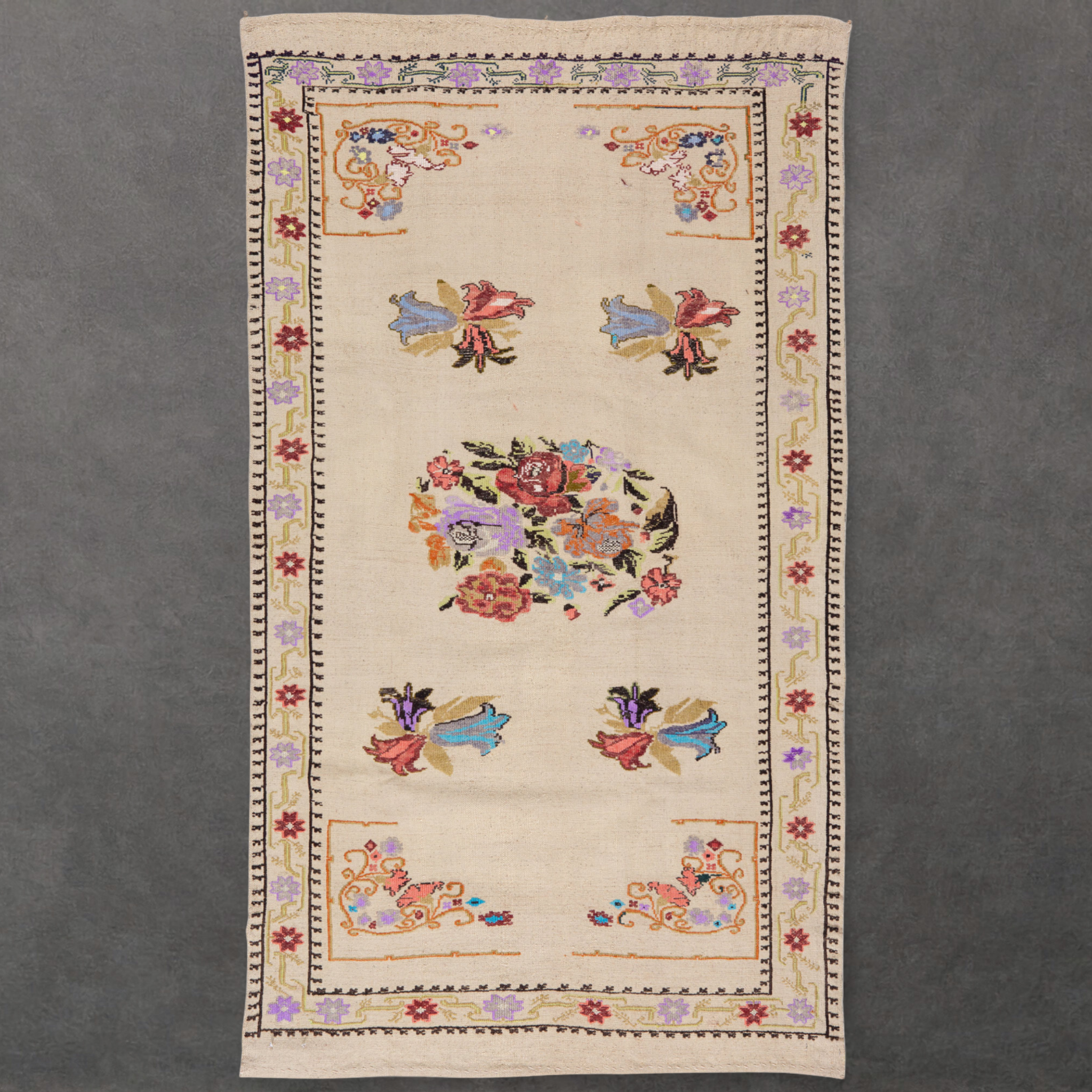 Handwoven in Turkey circa 1980, this kilim rug is worked in handspun wool with embroidered floral motifs arranged across a restrained, symmetrical field. The composition reflects regional decorative traditions, combining flatwoven structure with needlework detailing that adds surface articulation without disrupting the underlying weave. The palette remains softly balanced, allowing the embroidery to read as ornament rather than excess. It brings pattern, history, and quiet visual rhythm into a space without dominating it.