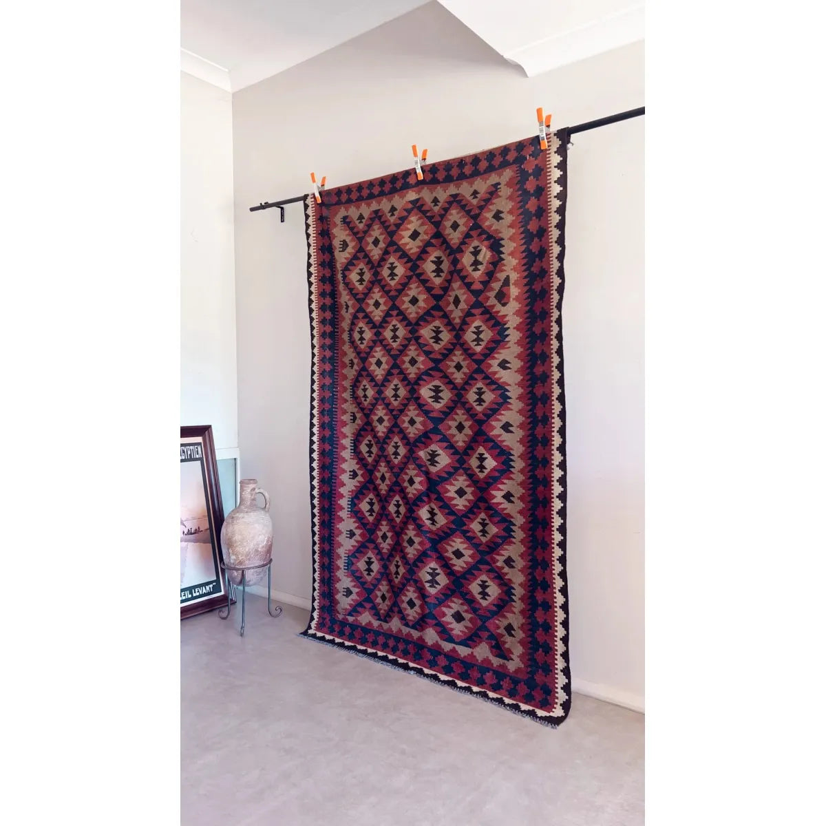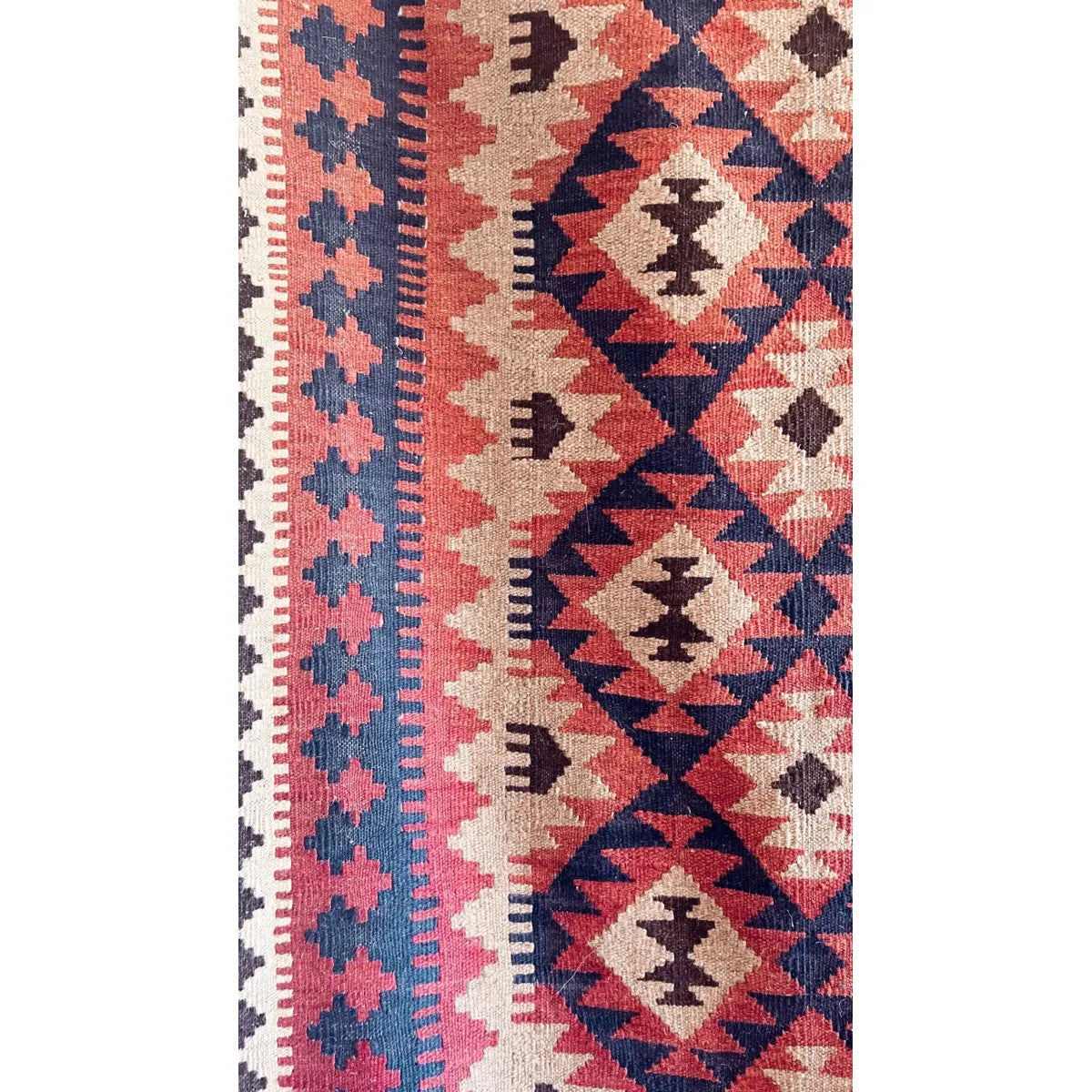 A mid-century Maimana Kilim rug featuring stepped diamonds and hooked motifs in indigo, madder red, and camel. The slit-weave technique gives sharp, rhythmic geometry.