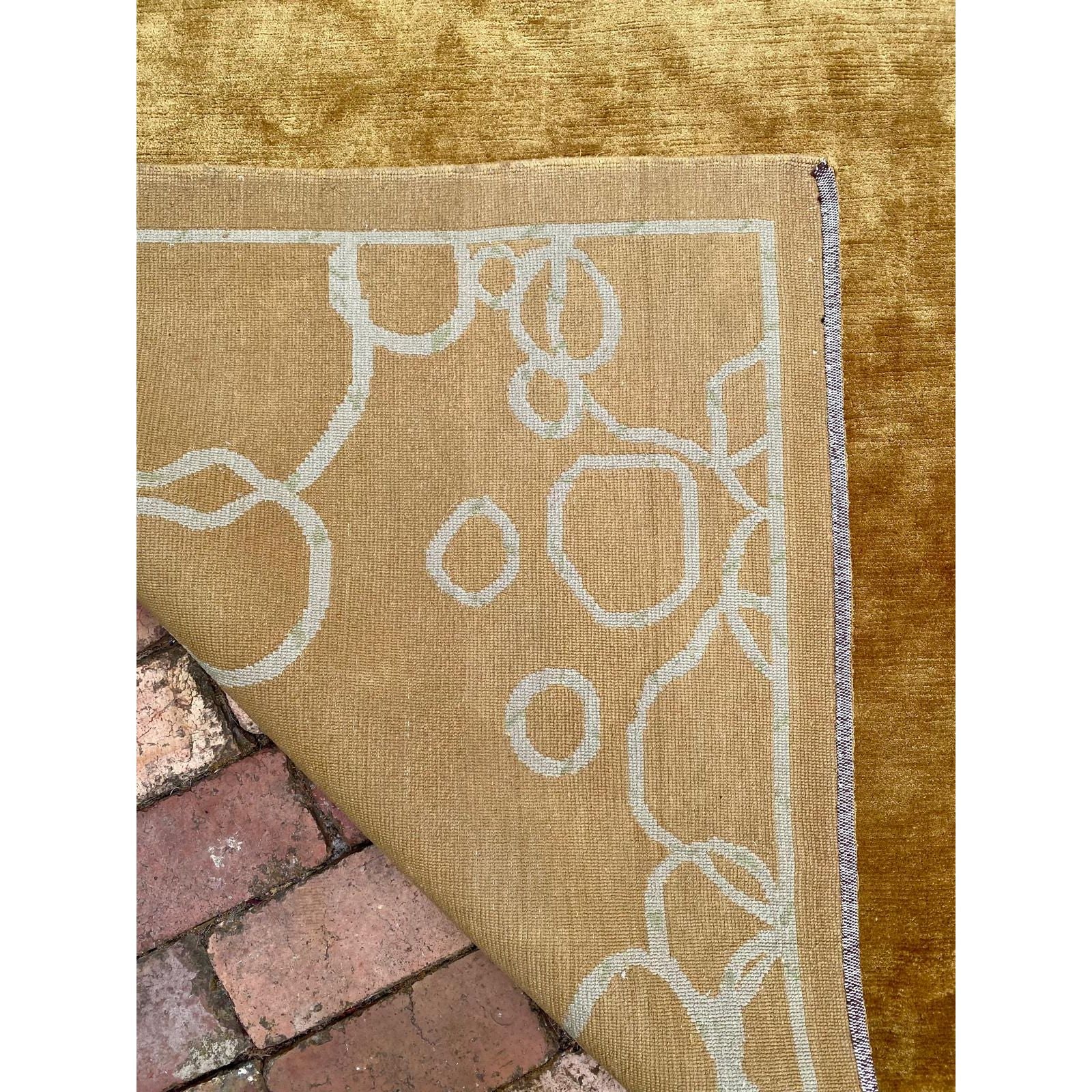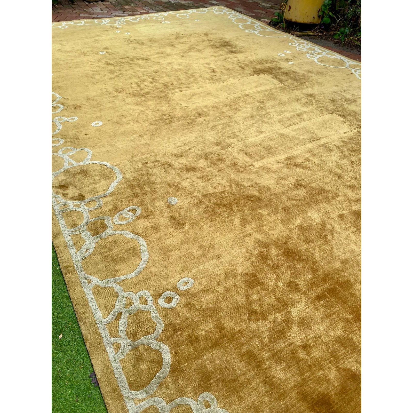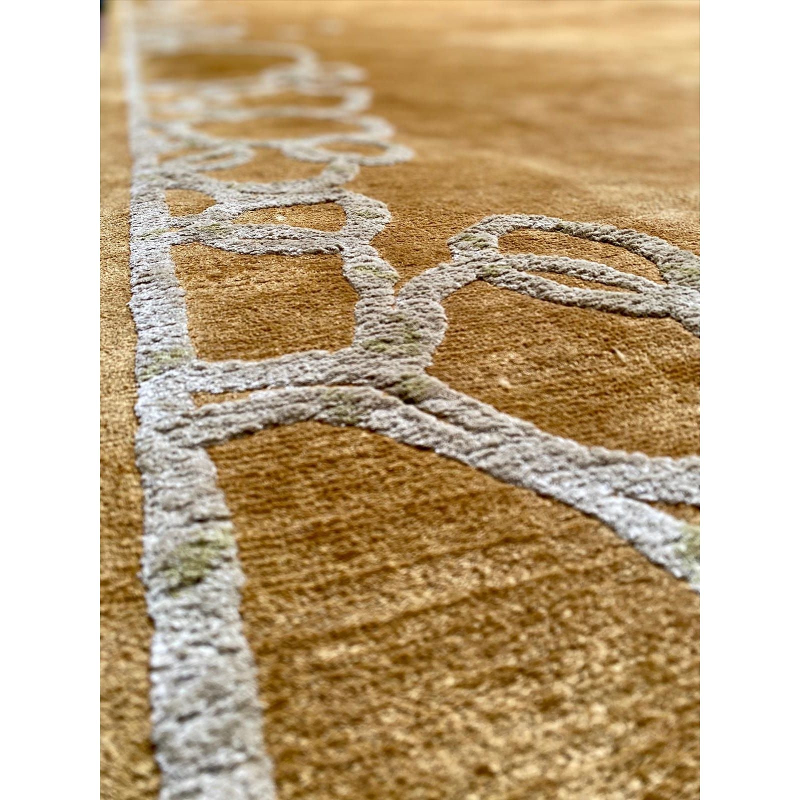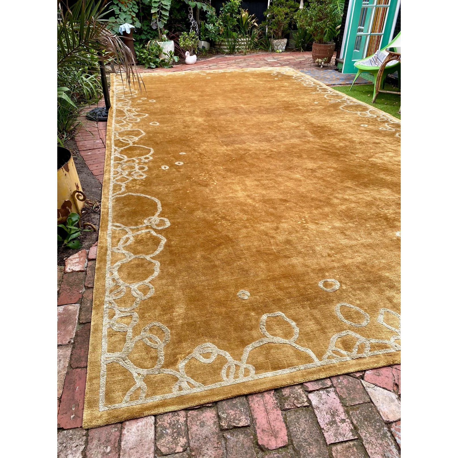 A truly breathtaking statement piece, this huge golden silk rug by bespoke designers Behruz was hand-made in Nepal for a Melbourne penthouse, where scale and luxury were paramount.Woven entirely in silk, the rug has an unmistakable luminous, liquid sheen—its golden tones shifting beautifully with the light throughout the day. The craftsmanship is exceptional, with a velvety softness underfoot that feels as indulgent as it looks. At an impressive 6 metres x 3.1 metres, it was designed to anchor a vast architectural space, effortlessly balancing grandeur with warmth.This is not just a rug, but a work of art—bespoke, rare, and undeniably opulent. A testament to Behruz’s mastery of traditional techniques combined with contemporary design, and to Nepal’s long-standing heritage of world-class handwoven textiles.Excellent condition, with only a few flat spots where surface items sat.