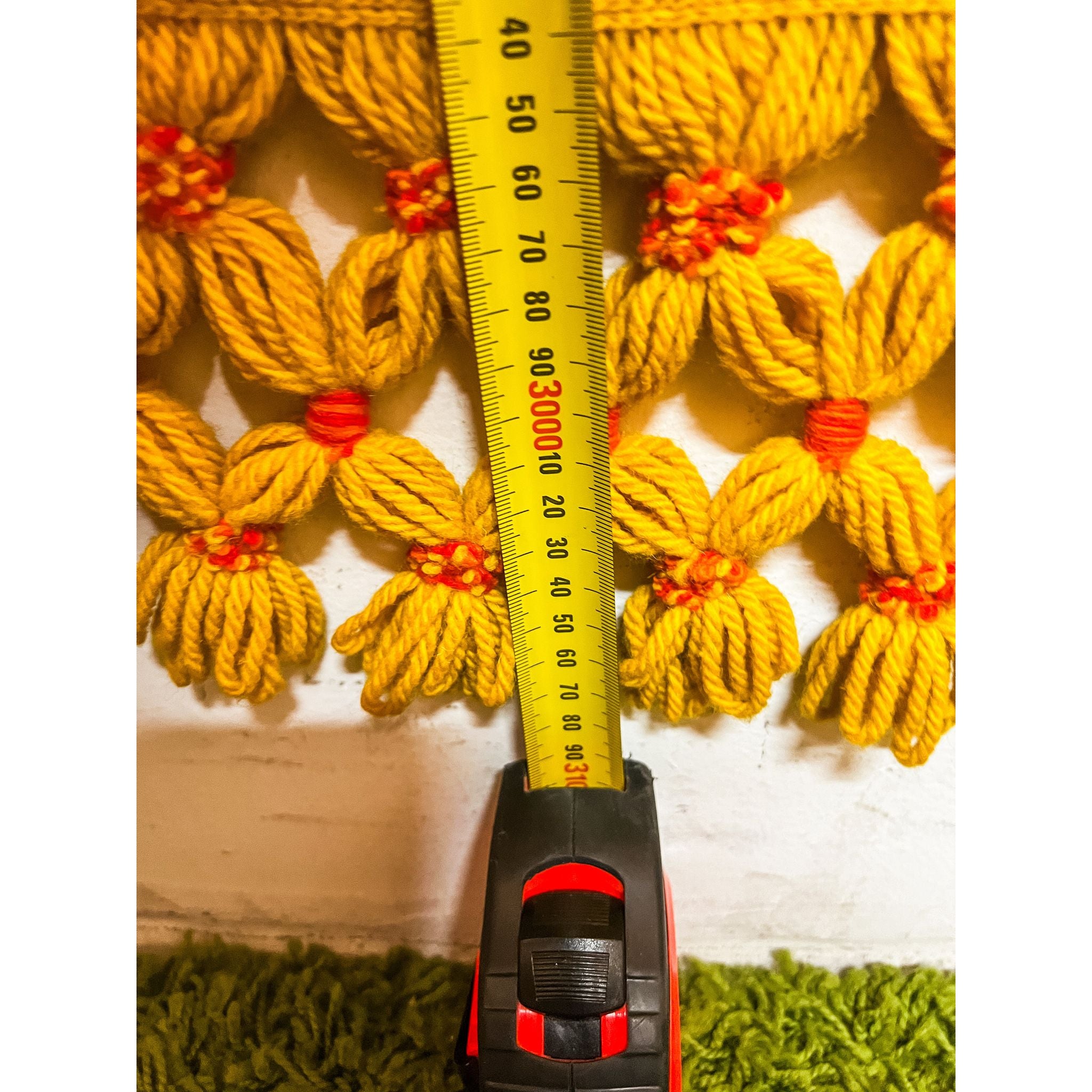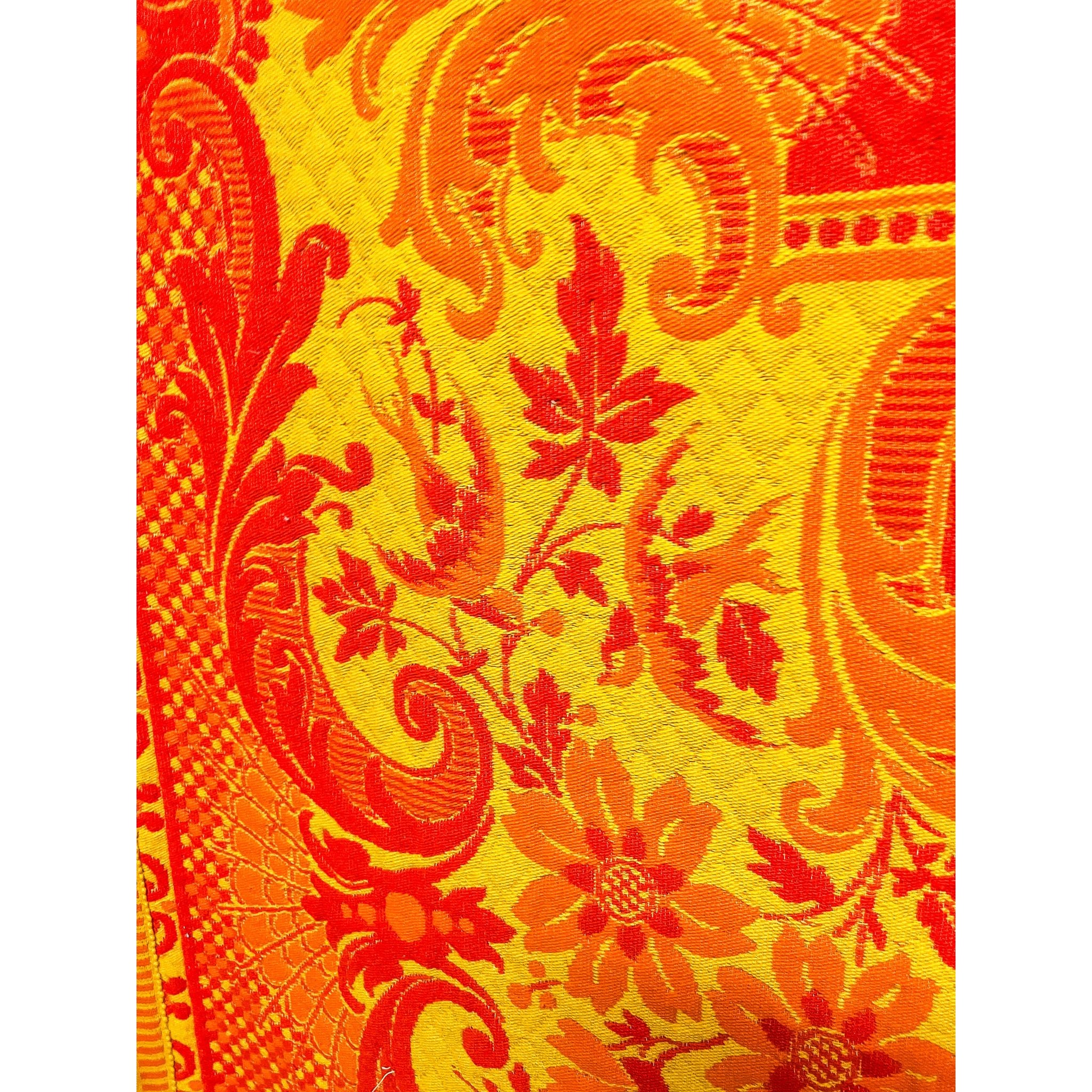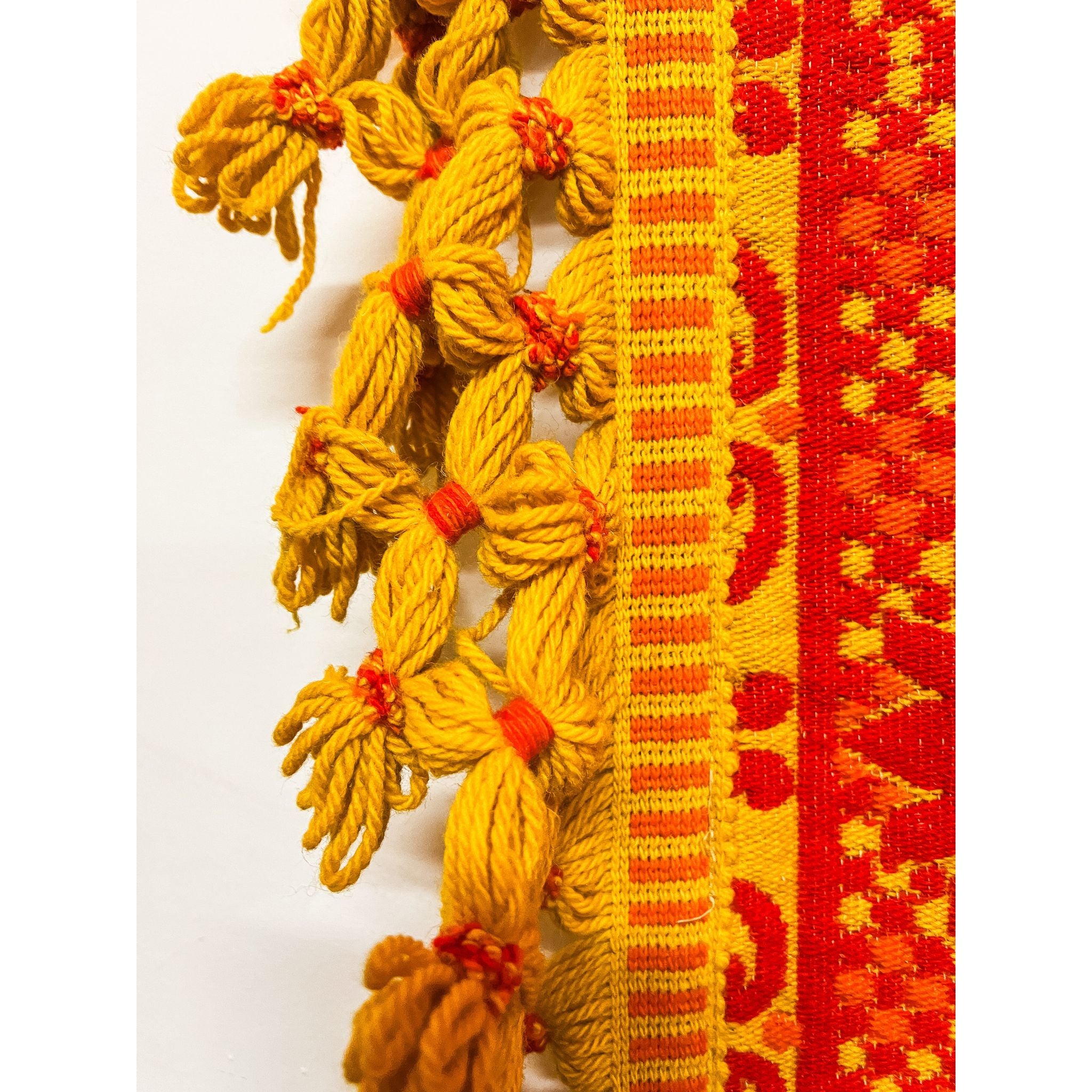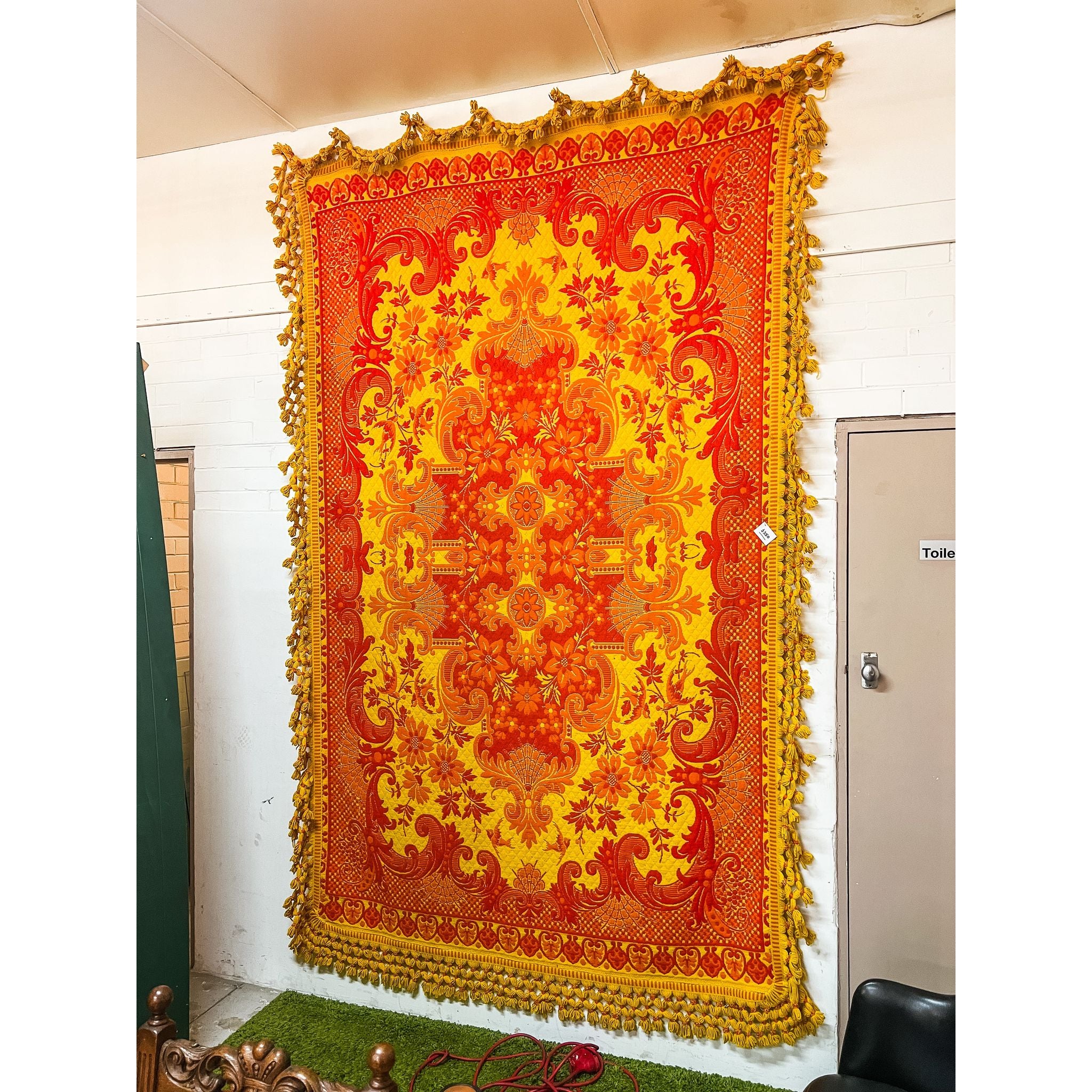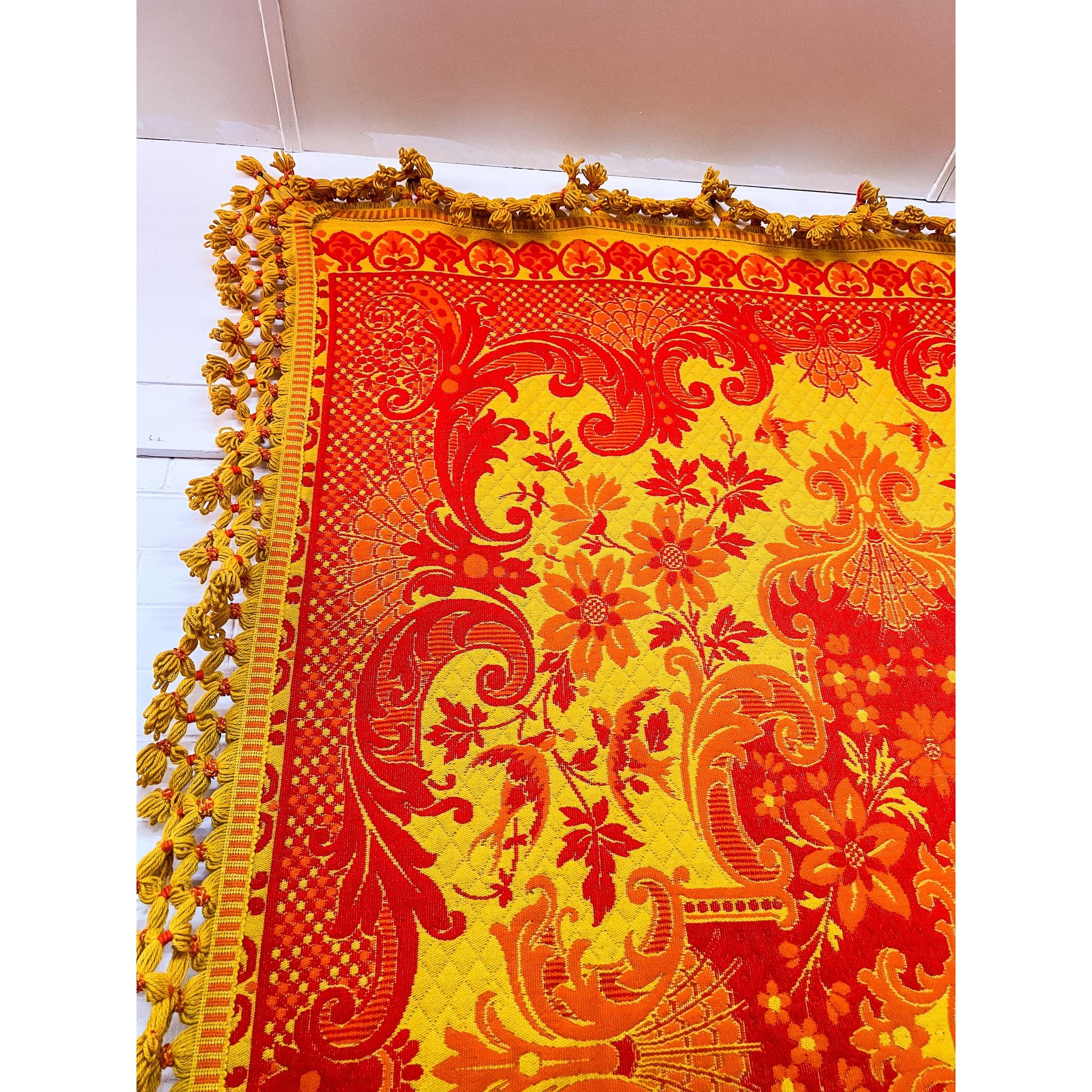 A bold and eye-catching large vintage wool rug featuring an intricate orange and yellow pattern with ornate floral and scrolling motifs. Finished with a decorative tassel fringe border, this piece has a strong retro and bohemian feel, making it a standout statement for any space.