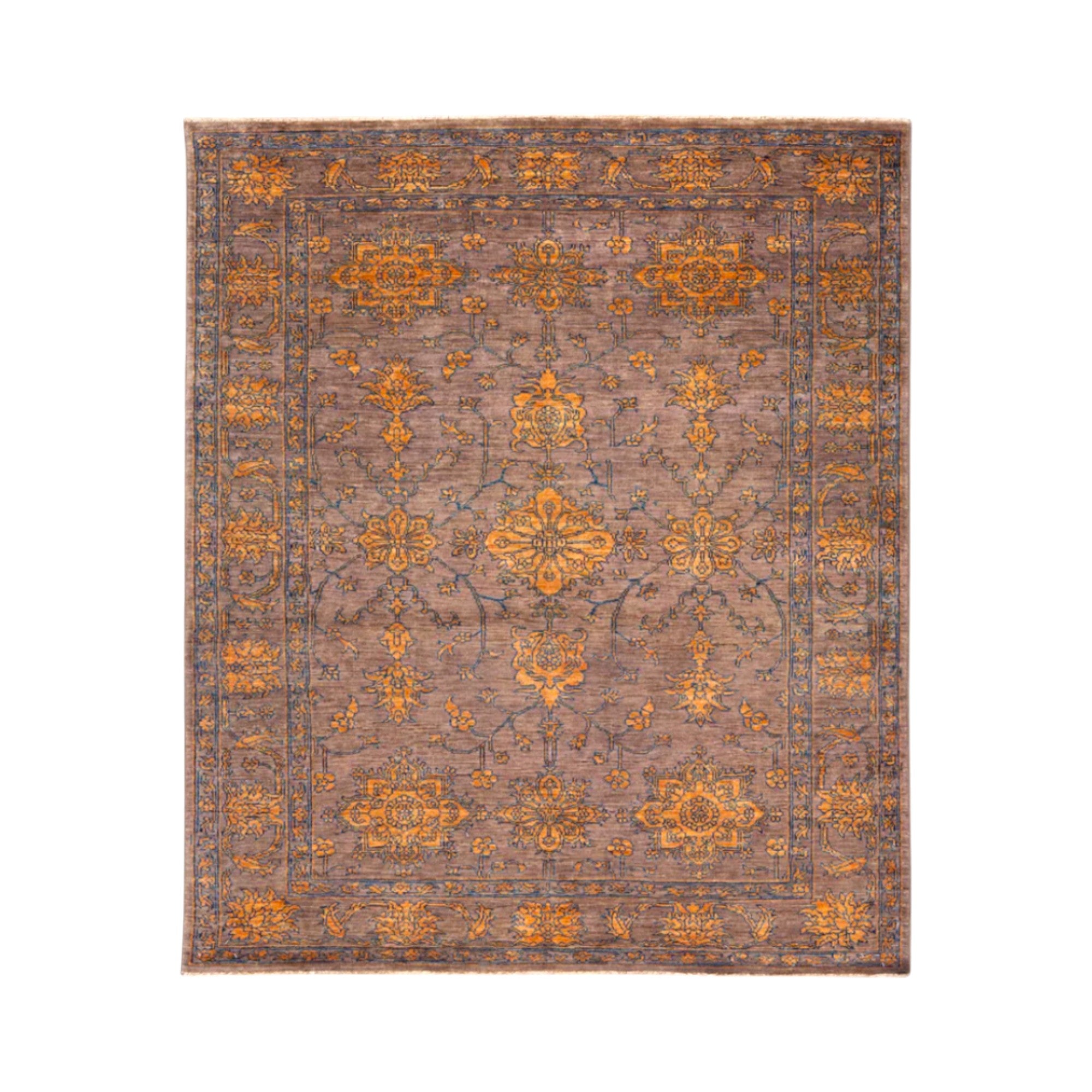 Woven in Bamyan using handspun Ghazni wool, this rug is defined by a dense ornamental field structured around symmetrical floral medallions and articulated borders. A warm mineral ground sits beneath saturated saffron, indigo, and umber motifs, creating a layered surface with strong internal rhythm. The composition balances formality and movement, with repeating elements softened by hand variation and tonal drift across the field. It carries visual weight and decorative presence, suited to spaces where pattern is intended to lead rather than recede.