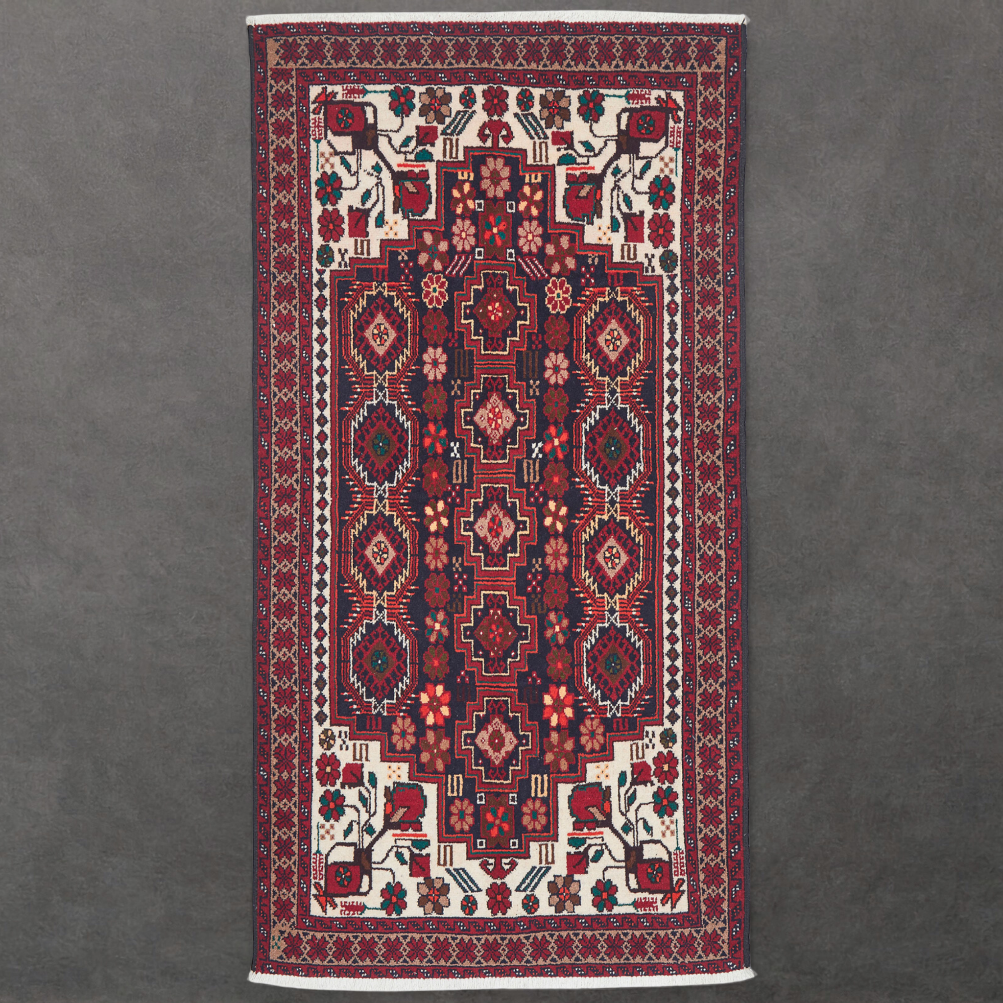 Woven by Beluch makers in eastern Persia, this rug is structured around a strong vertical axis of stepped medallions framed by tightly packed guard borders. A deep madder red ground dominates the field, offset by midnight blue, ivory, and walnut brown motifs that sharpen the geometry and heighten contrast. The pattern language is assertive and rhythmic, with angular forms and repeated symbols creating a sense of movement along the length of the rug. It carries visual intensity and cultural clarity, well suited to narrow spaces where scale and direction matter.