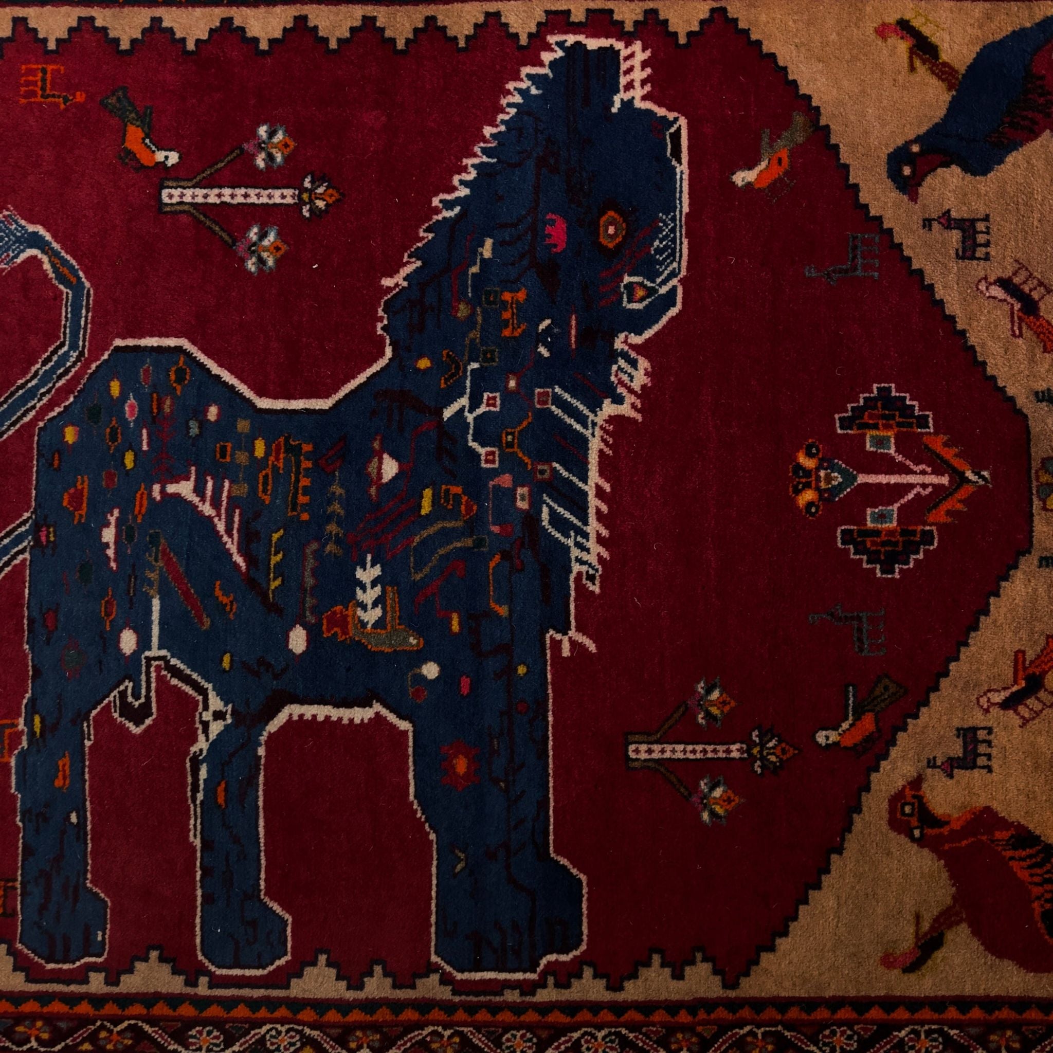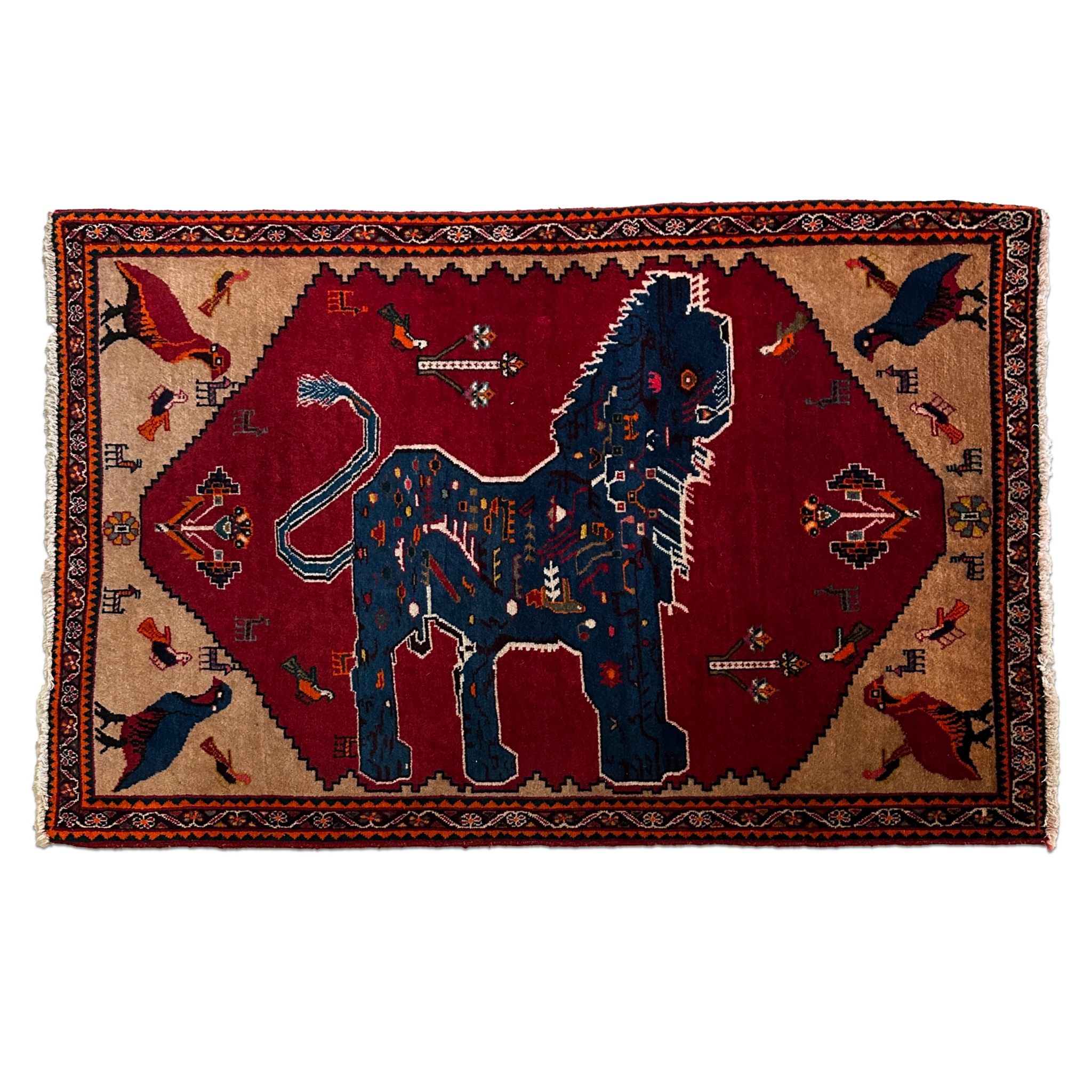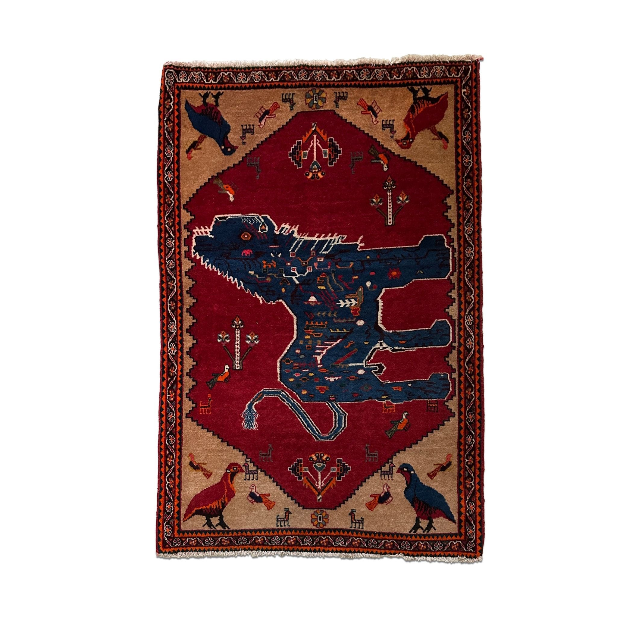 A striking piece of Persian tribal storytelling, this Vintage Qashqai Lion Rug features a powerful indigo lion set against a rich, saturated red field, framed by sandy-gold corners filled with playful birds and charming folk motifs. Qashqai rugs are celebrated for their free-spirited, symbolic designs that often include animals, birds, geometric forms and “everyday life” icons that are woven as personal, expressive works rather than perfectly repeated patterns.