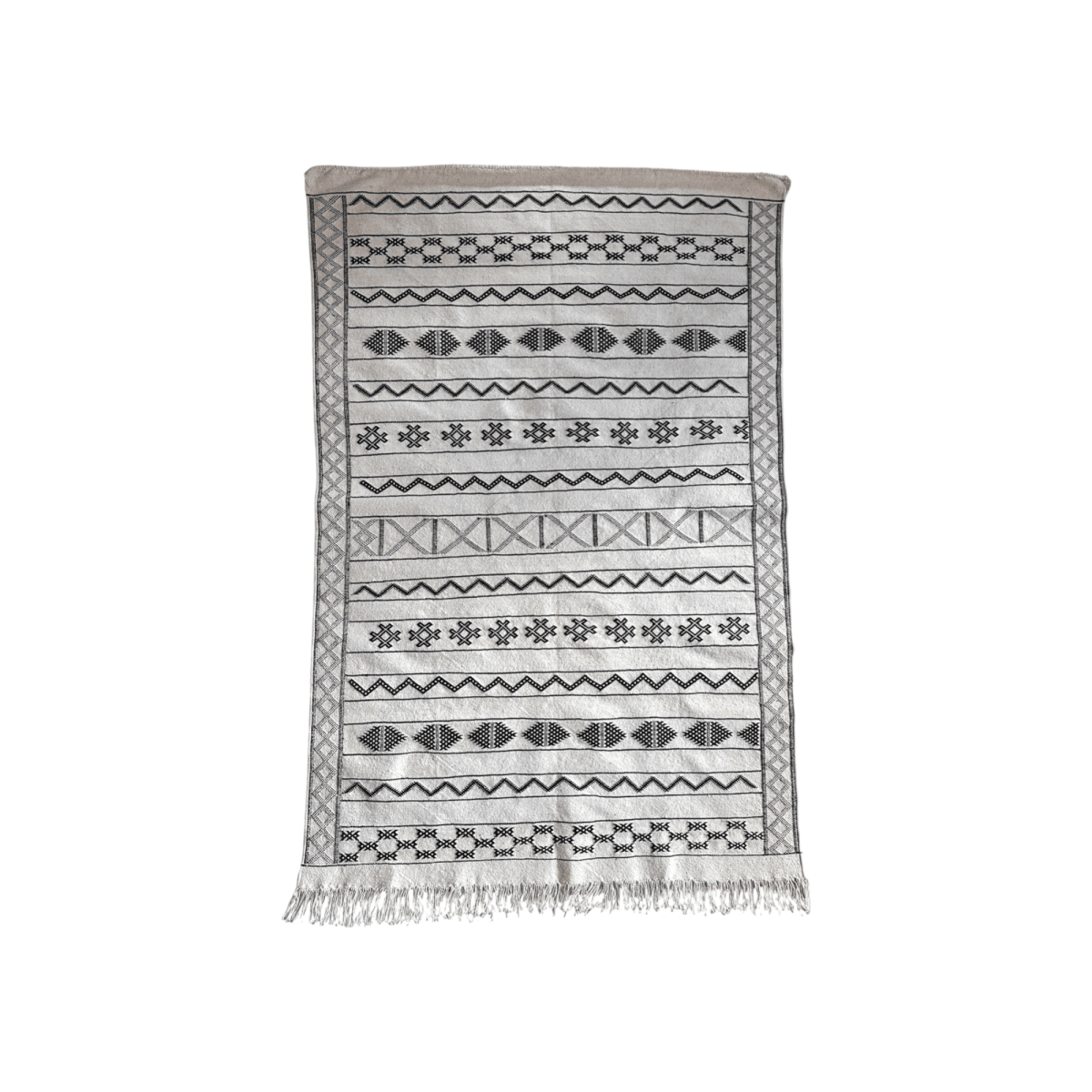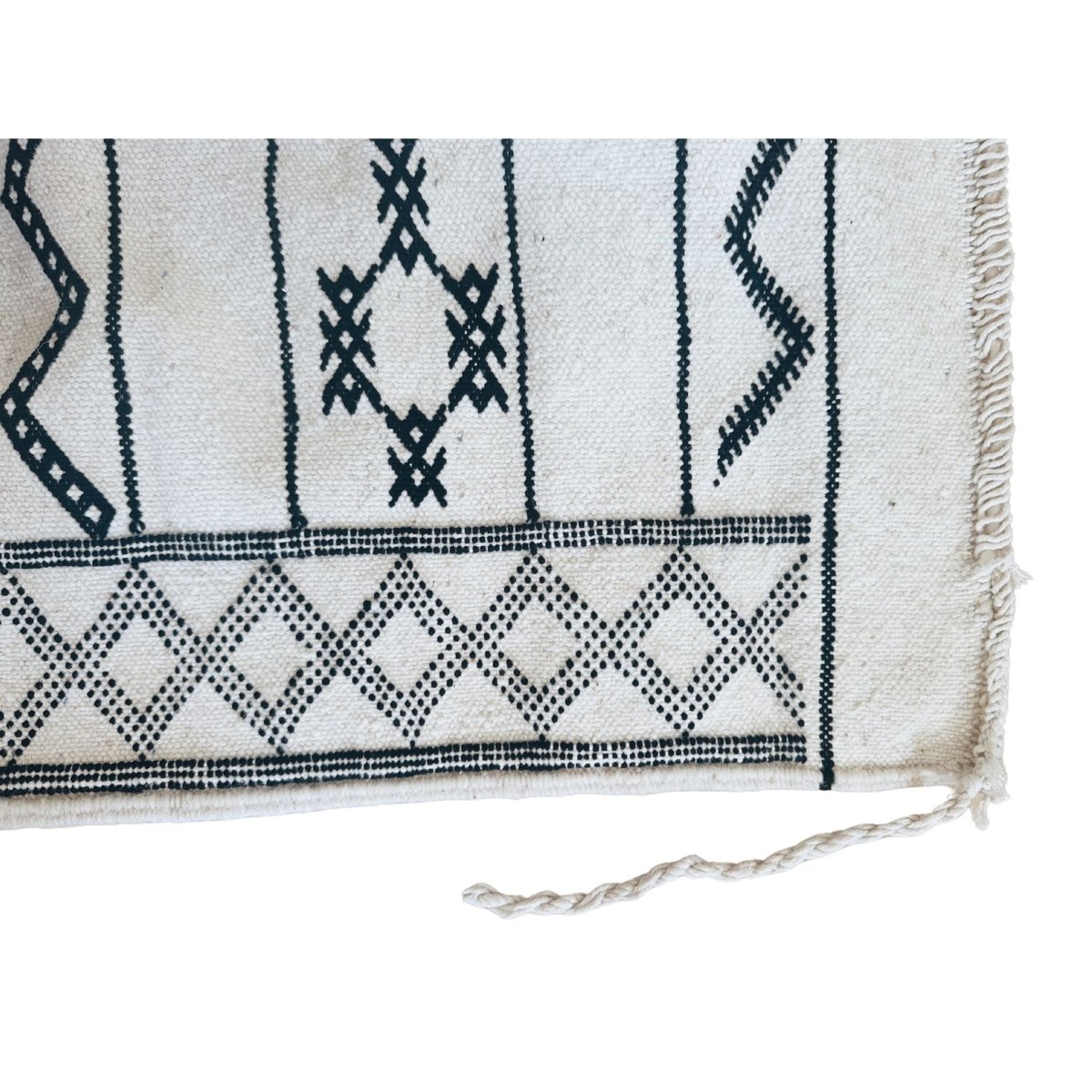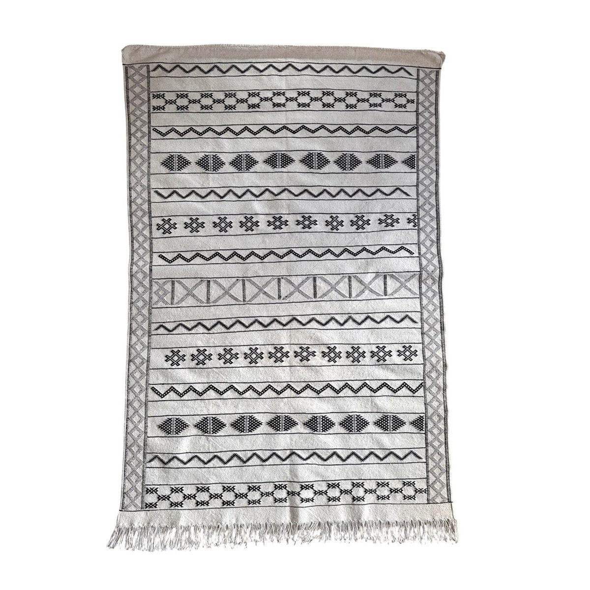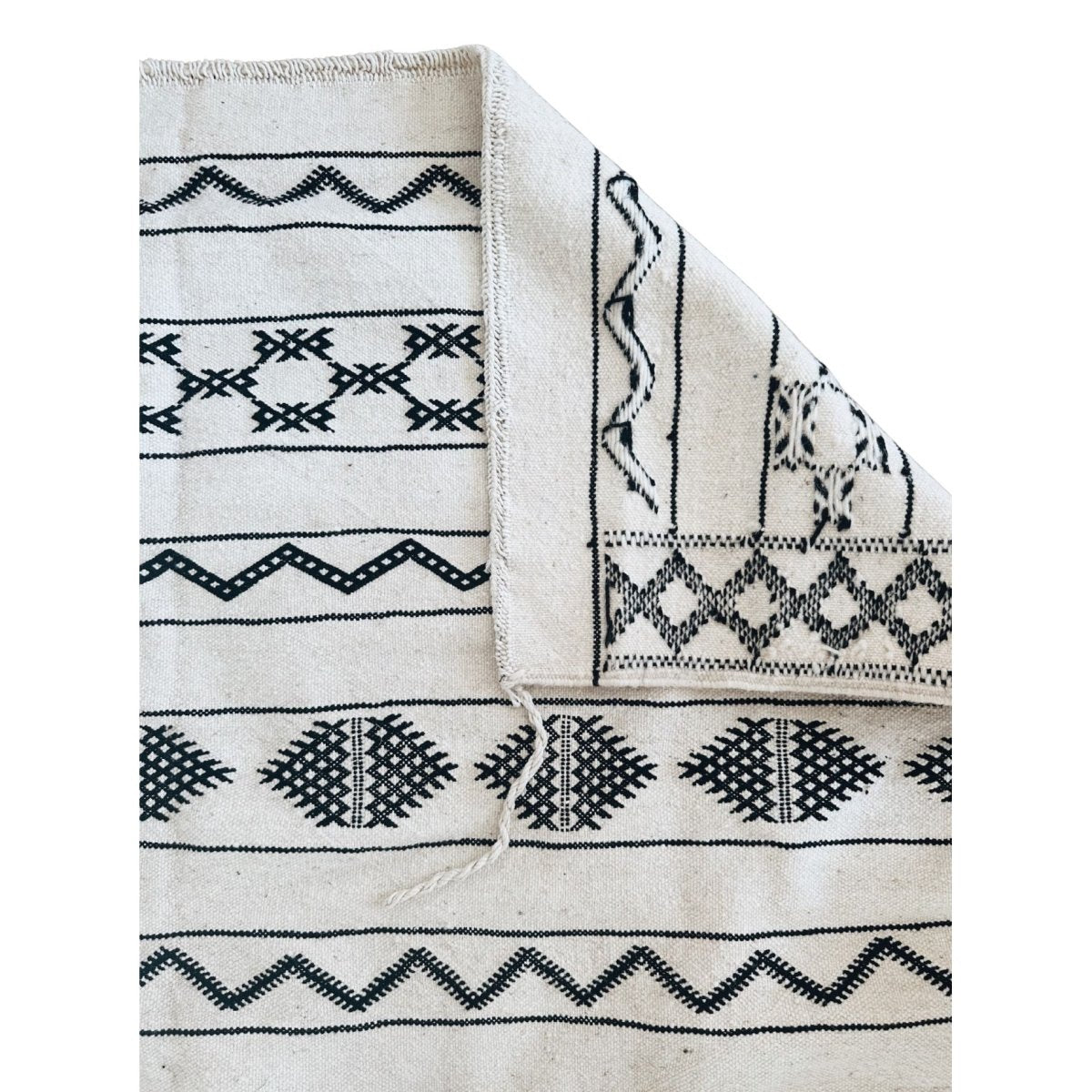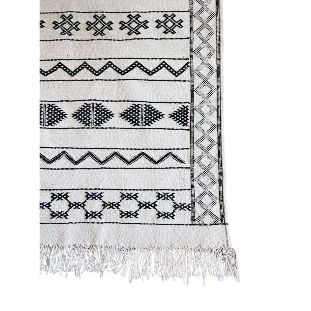 Handwoven by artisans in Morocco, this authentic flat weave Kilim rug features a timeless black and white pattern, bringing contrast and texture into a space.