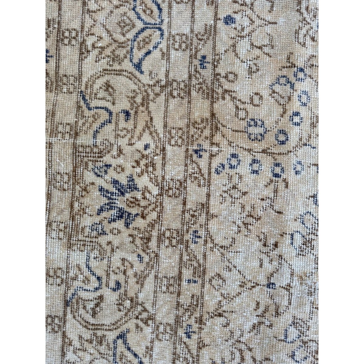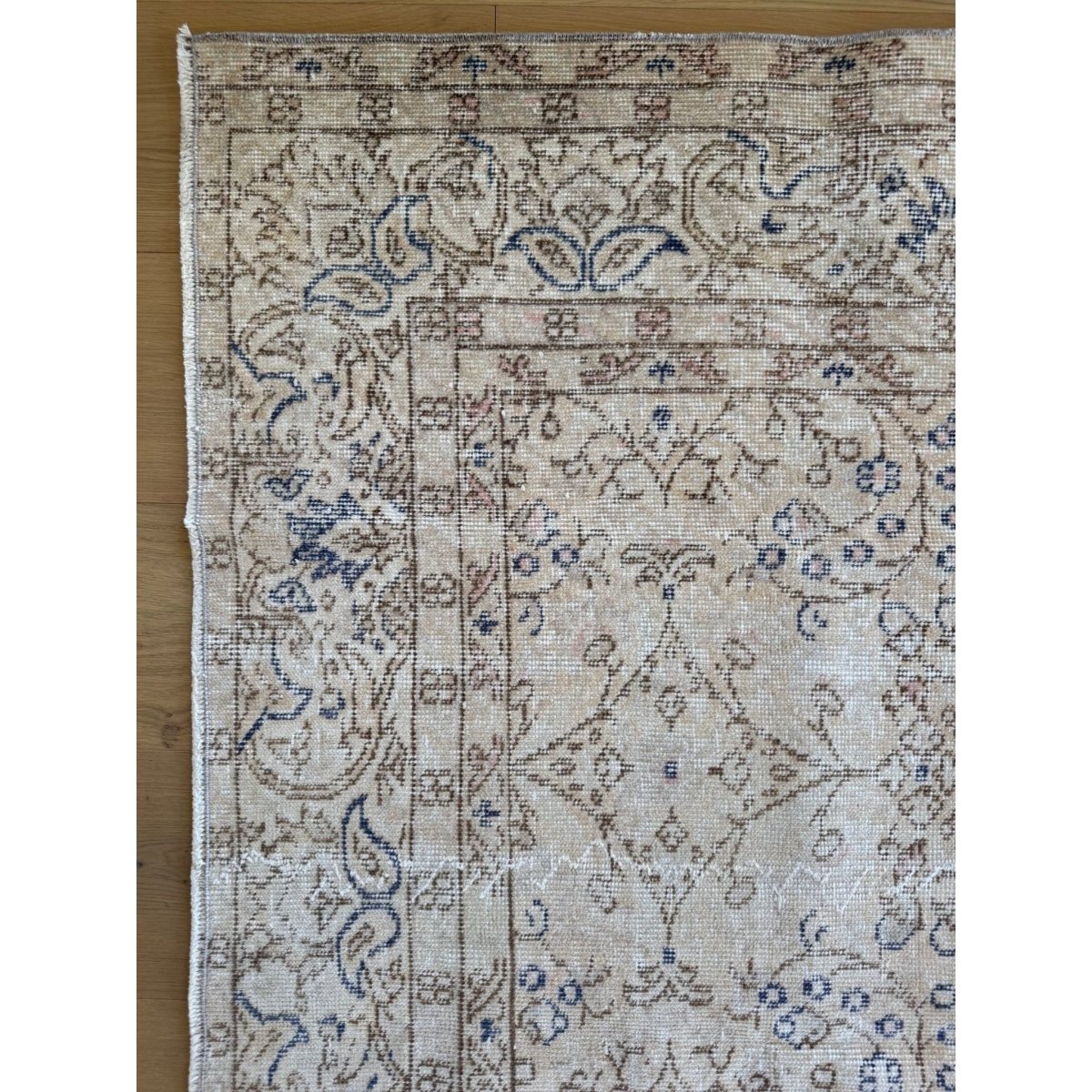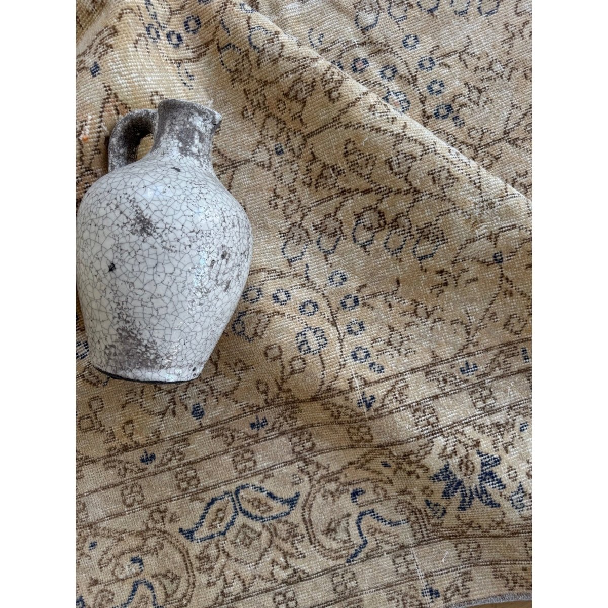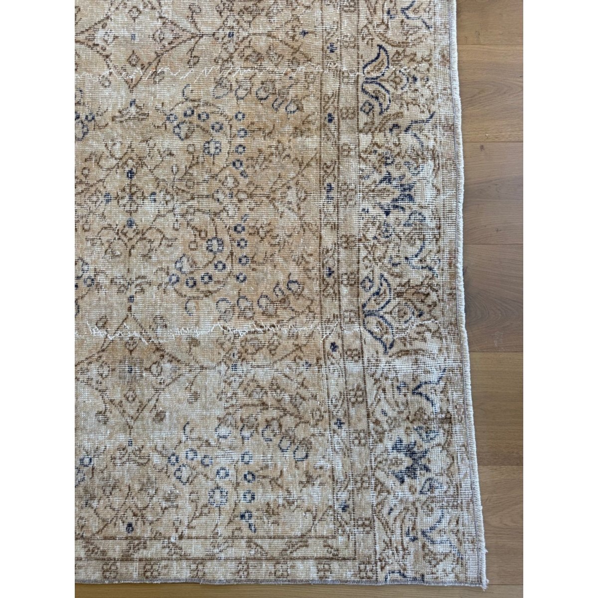 Colour Palette: sunbaked clay, toasted wheat, soft fawn, denim blue, sandy almond. Material: 100% wool Weave: Hand Knotted Origin: Türkiye Age: Approx. 70 Years Old