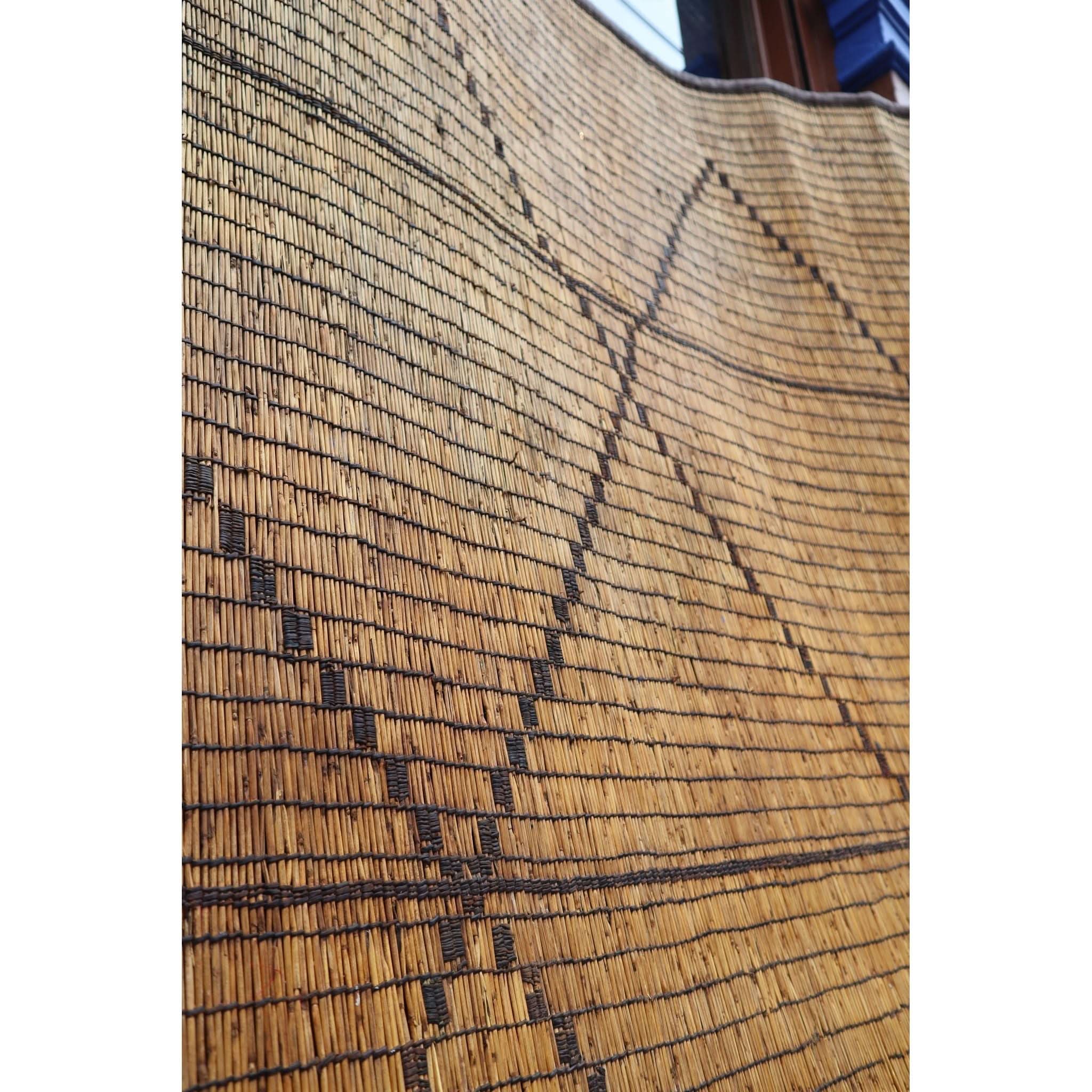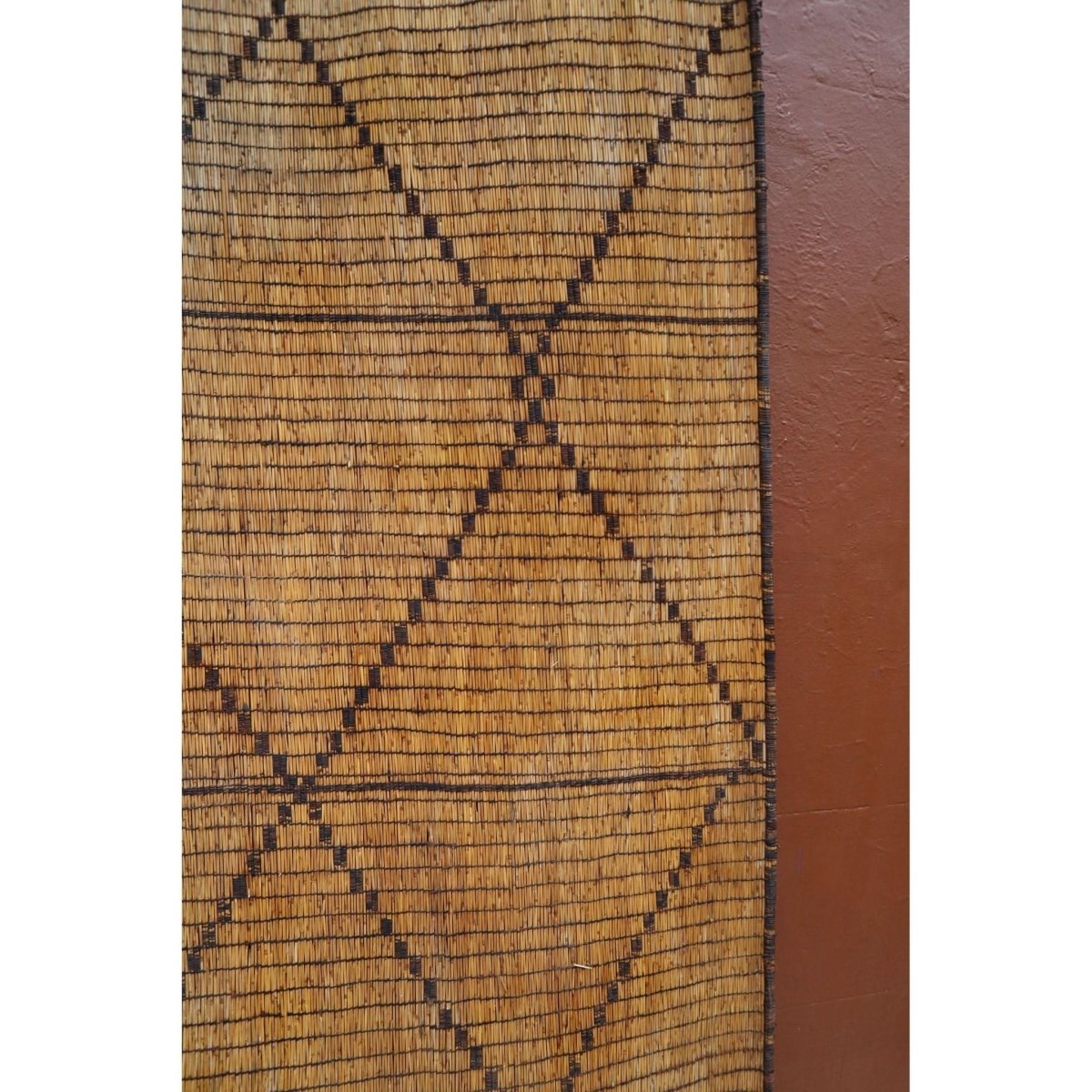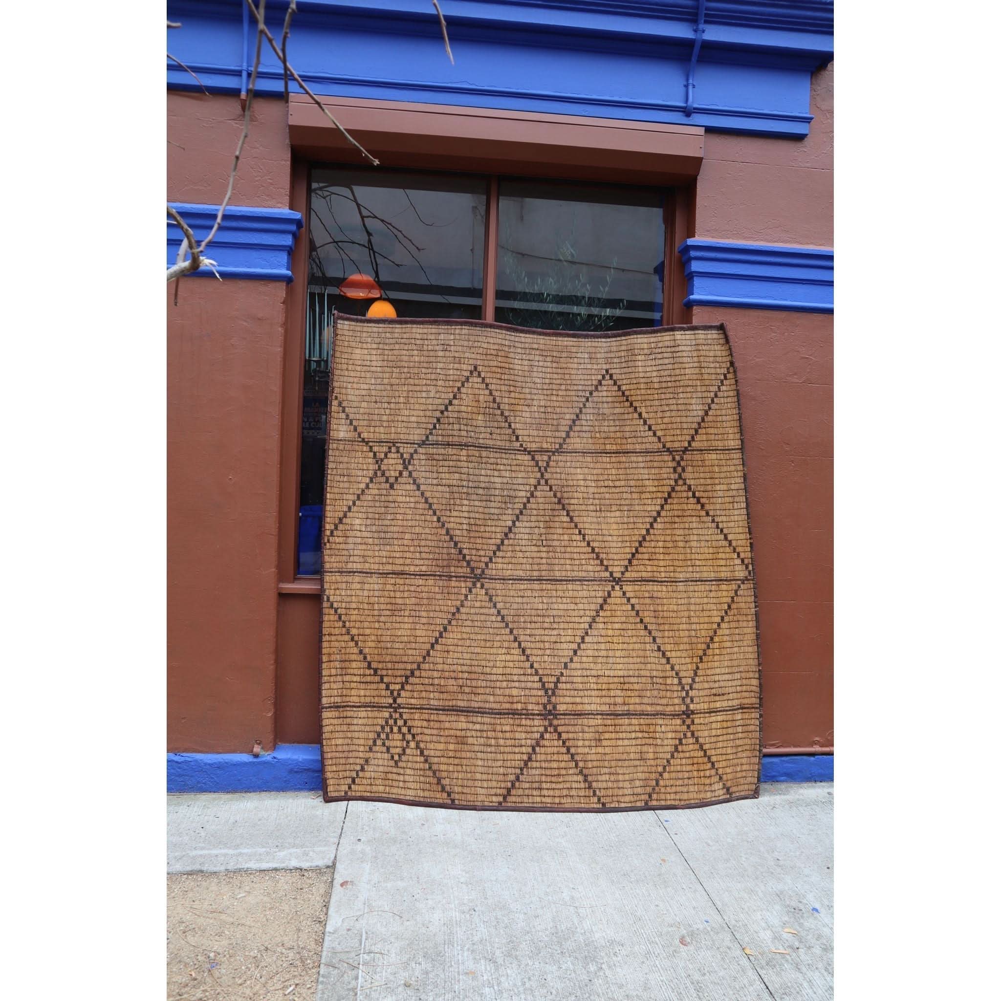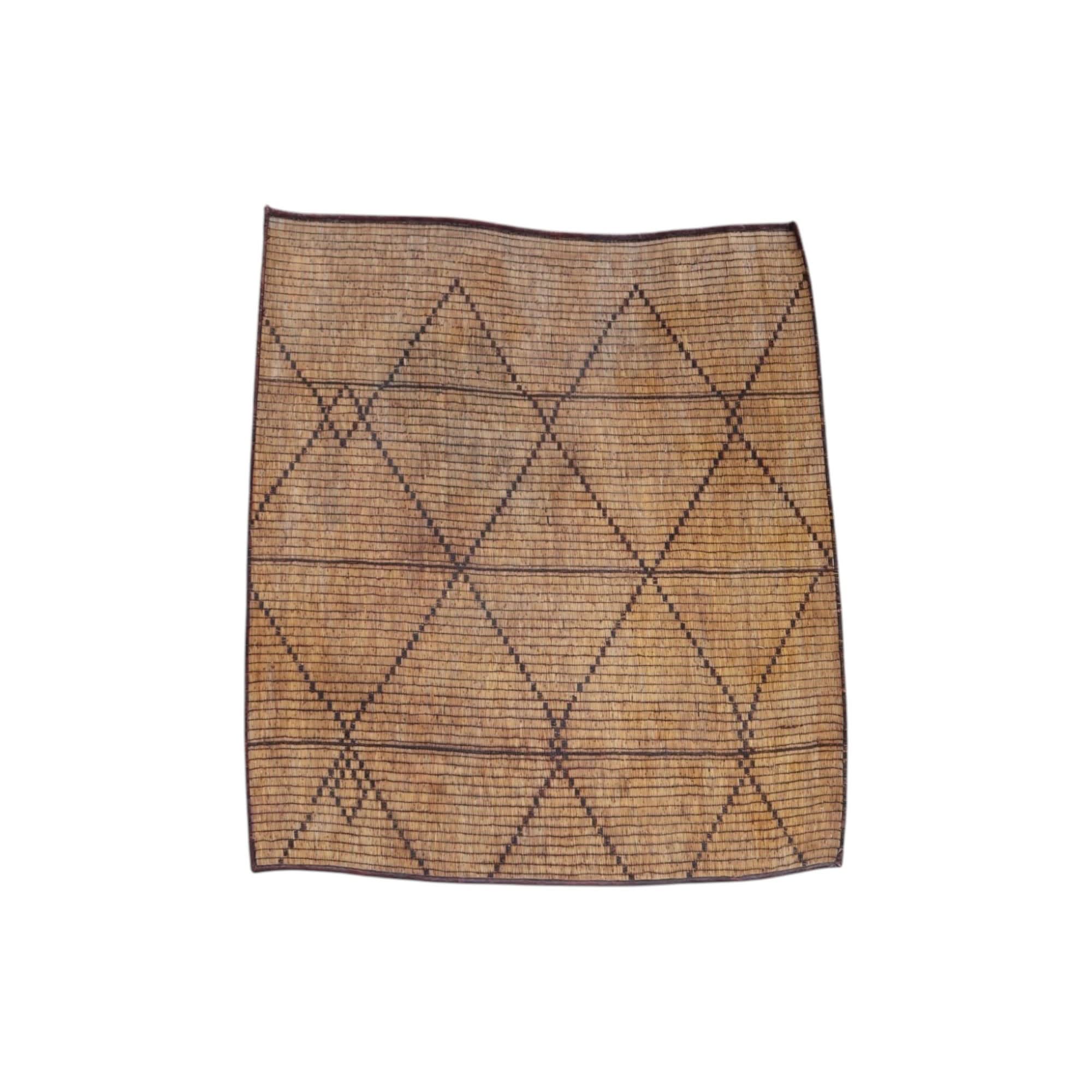 Made by the Tuareg tribe in Morocco. These are Berber people with a traditional nomadic pastoral lifestyle. The rugs are made from reed palm and camel or goat leather which is interwoven to give the patterns in the rugs.
