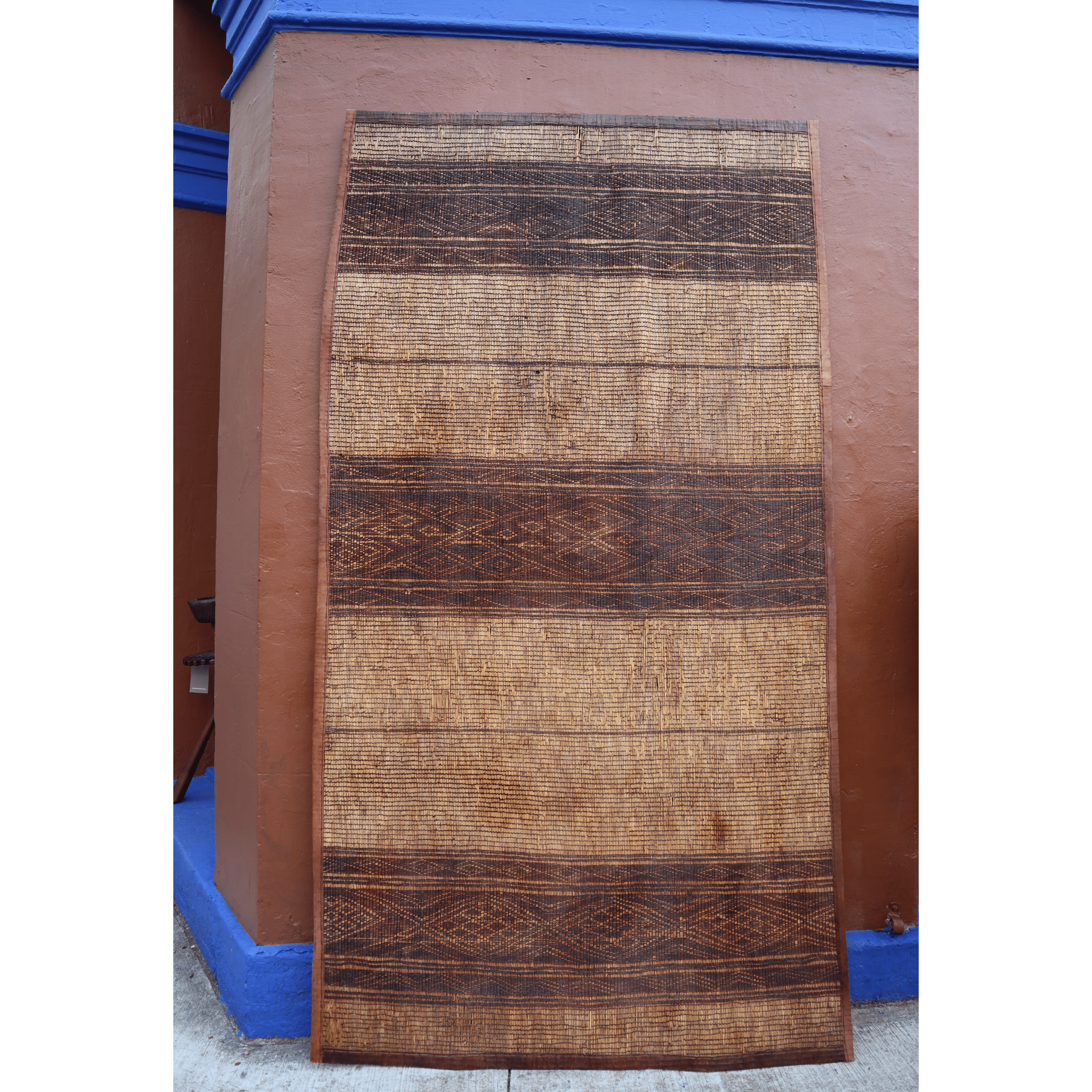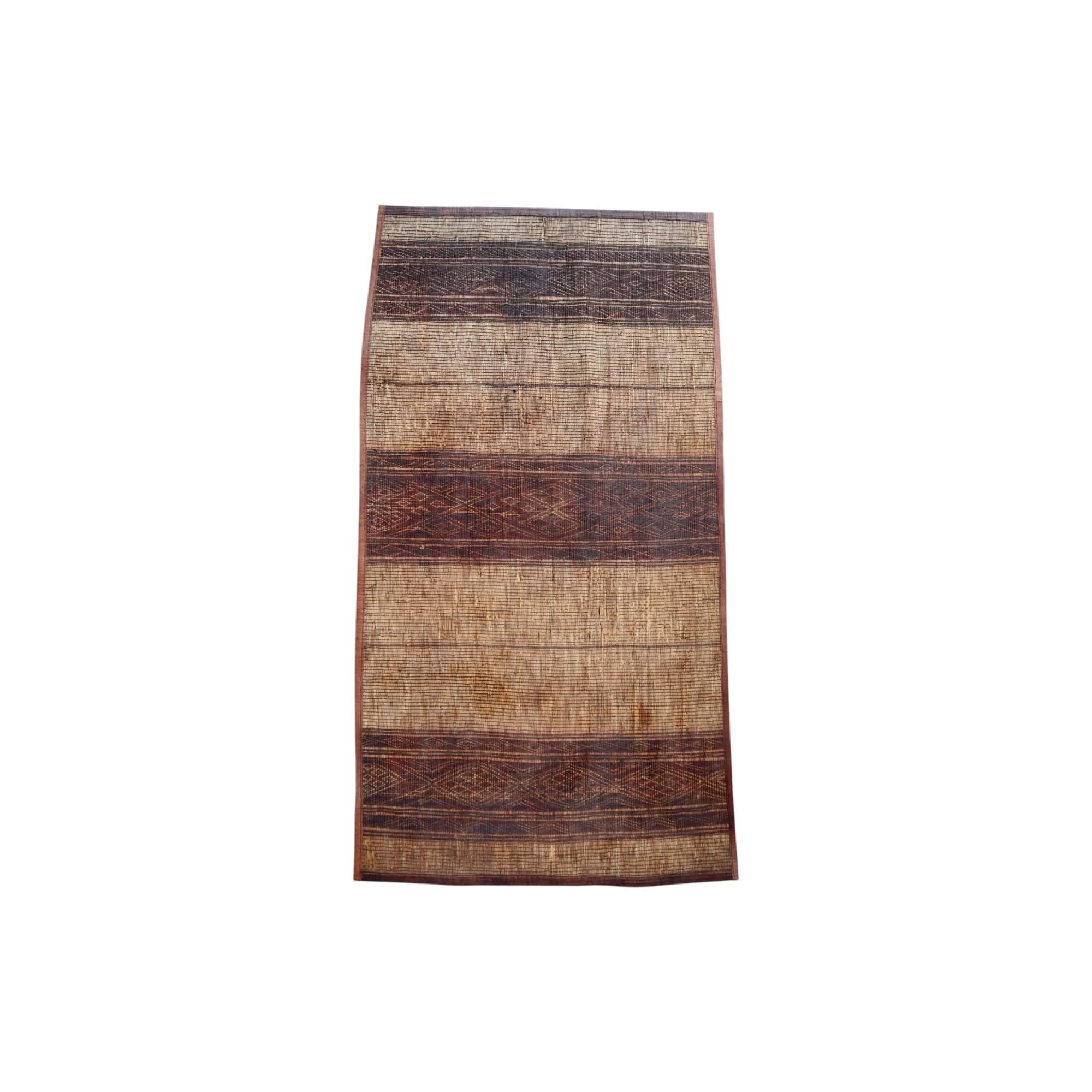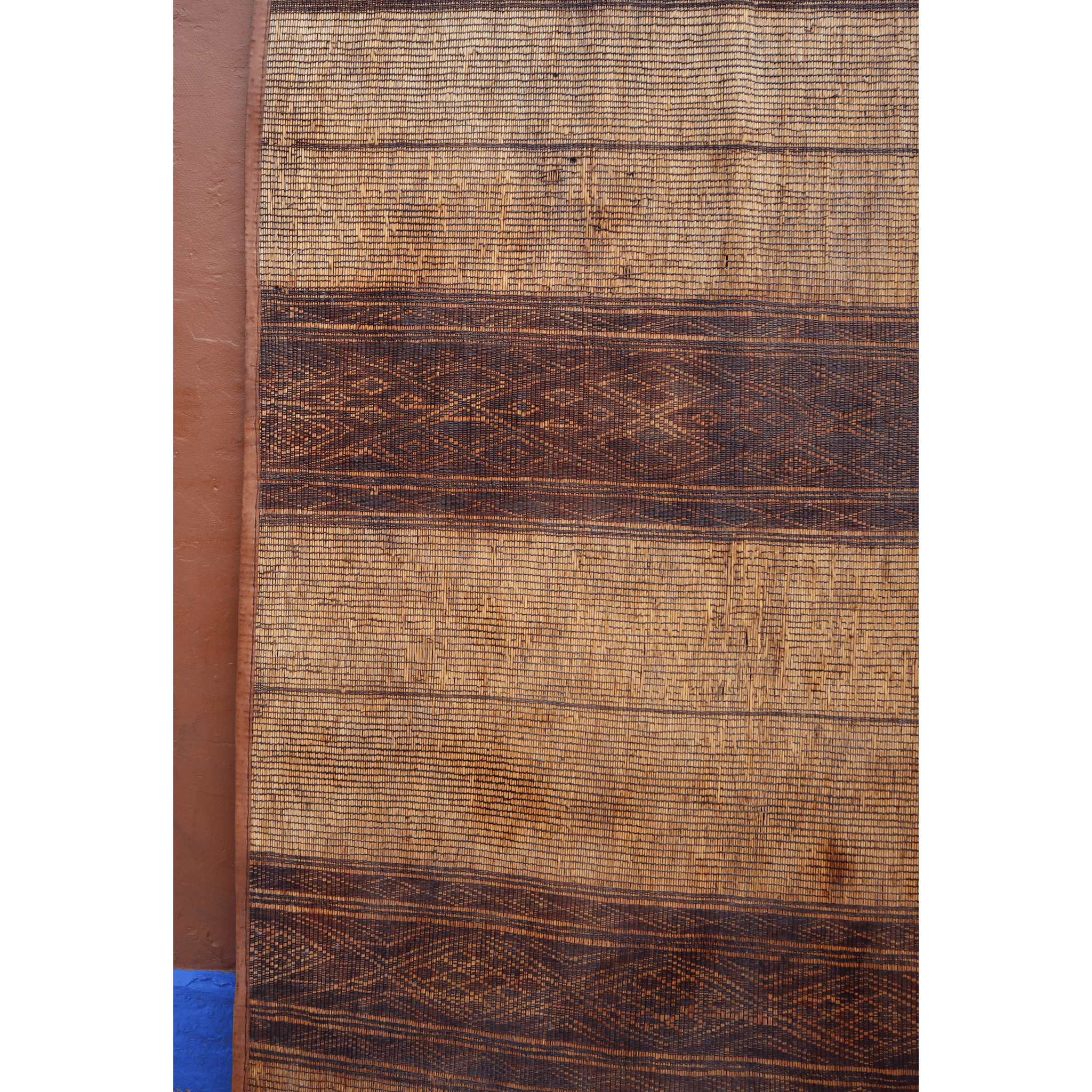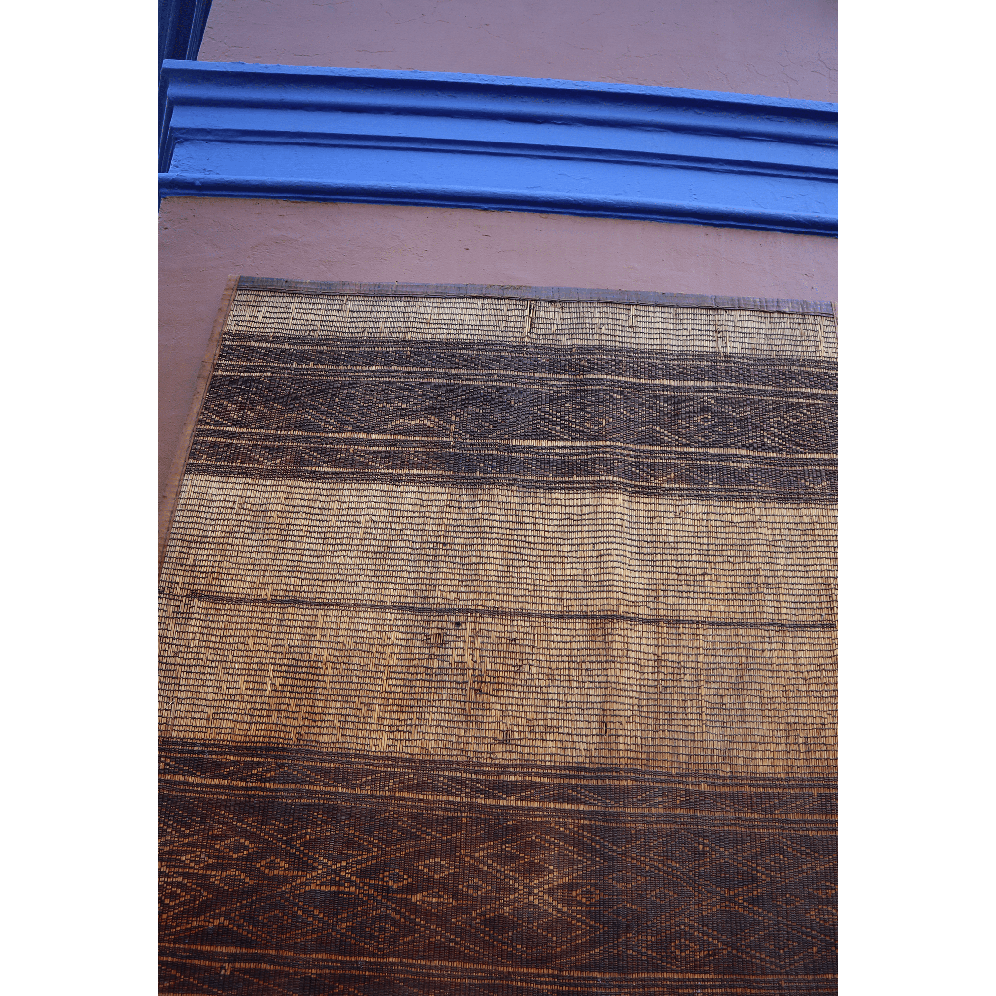 Made by the Tuareg tribe in Morocco. These are Berber people with a traditional nomadic pastoral lifestyle. The rugs are made from reed palm and camel or goat leather which is interwoven to give the patterns in the rugs.