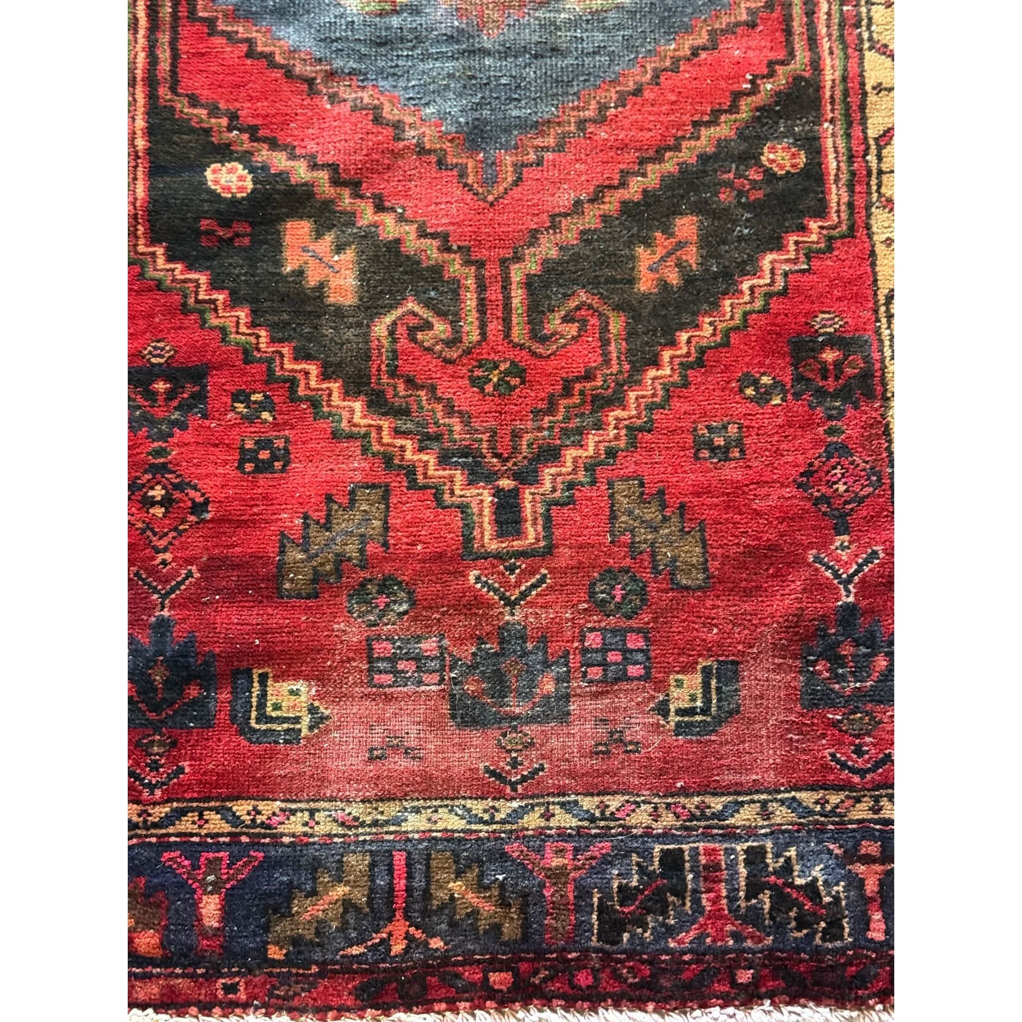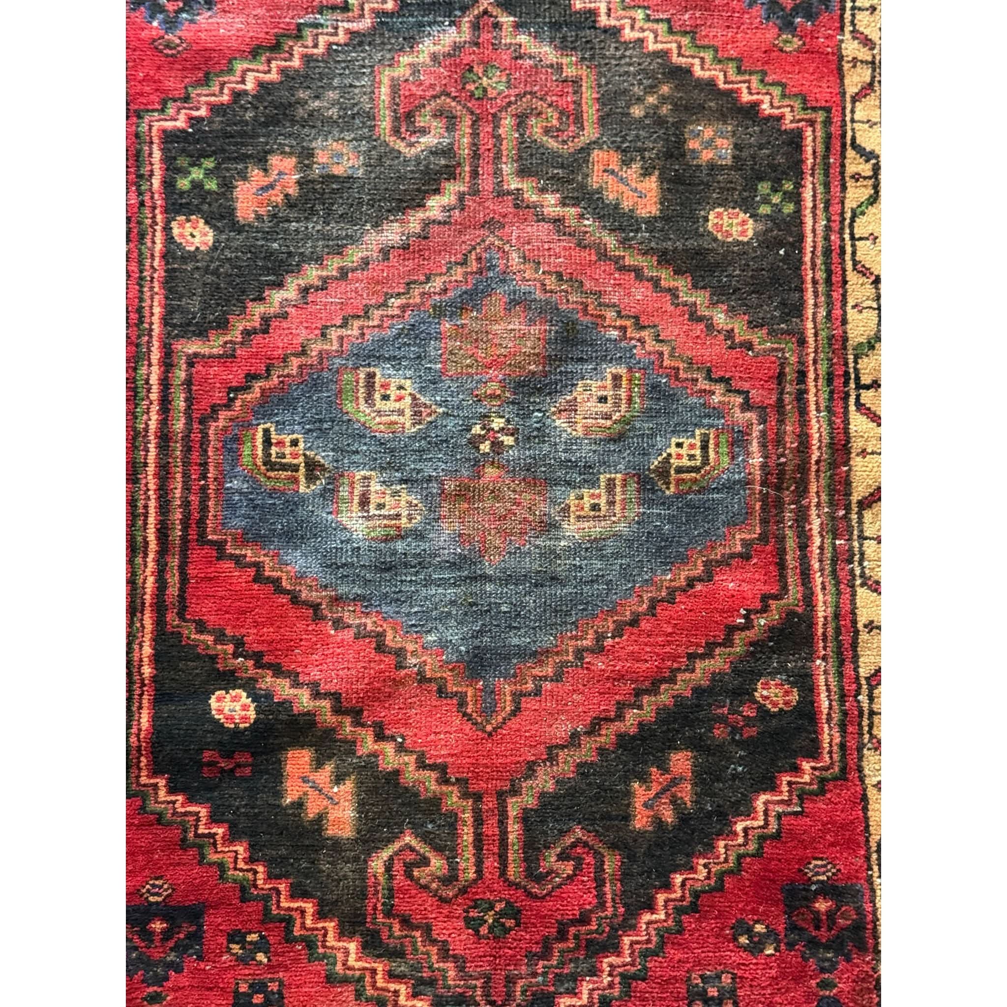 The Hamadan region of western Iran is known for producing durable, tightly knotted rugs with lively tribal-inspired patterns. This example shows the classic diamond medallion with stepped edges, surrounded by smaller symbolic motifs that lend rhythm and movement to the field.