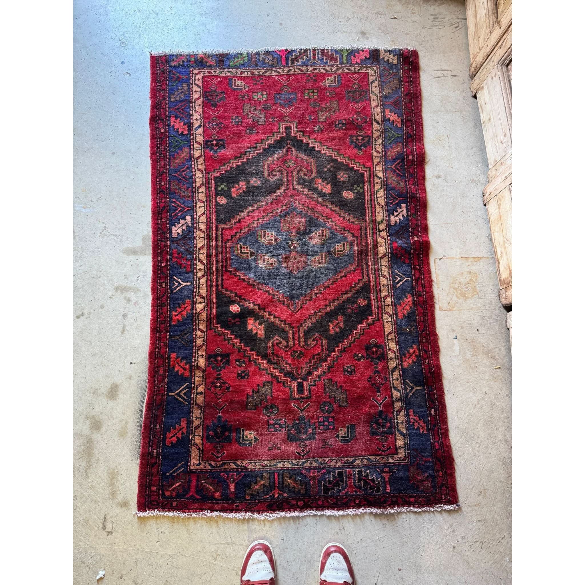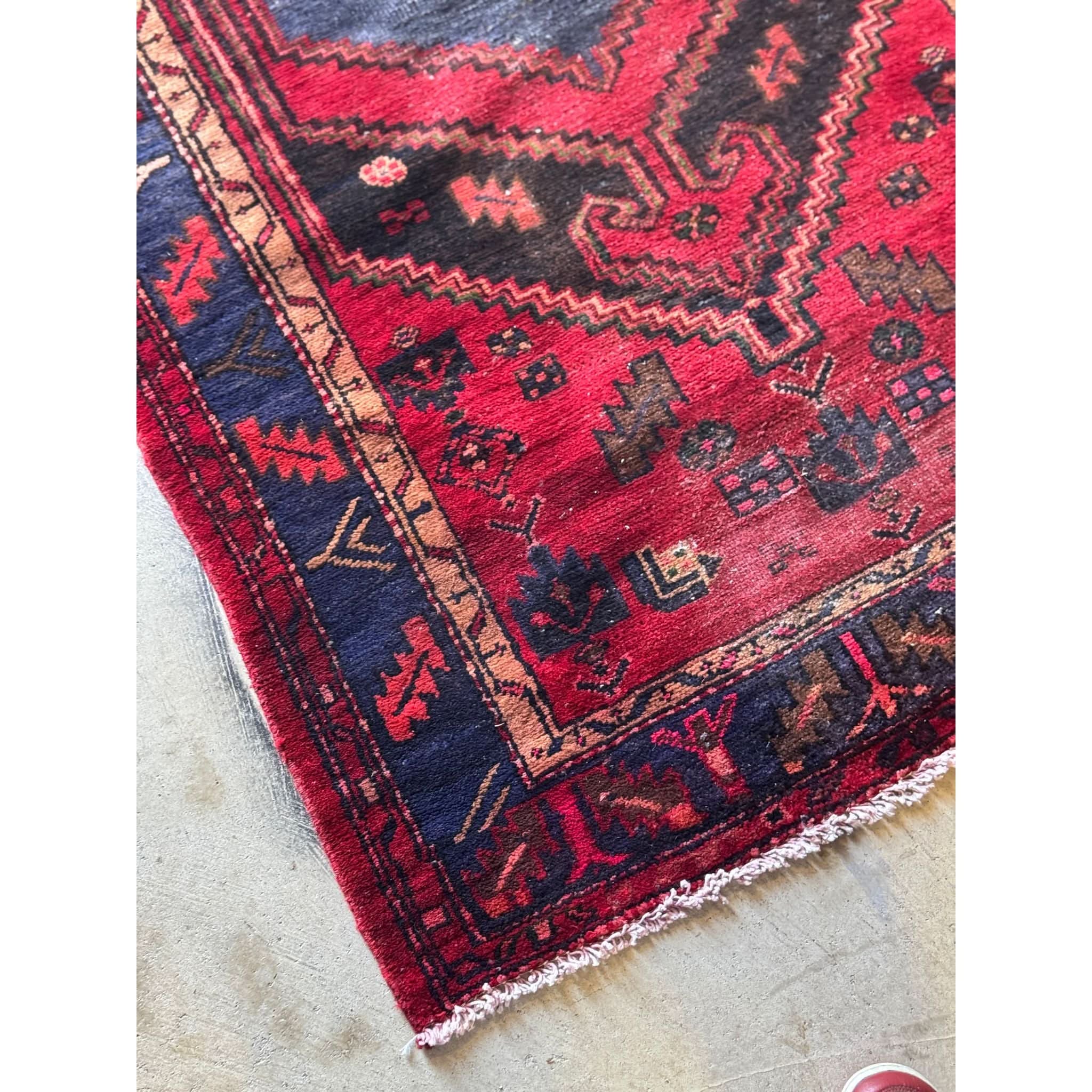 A richly coloured vintage Persian Hamadan rug, handwoven in wool with a bold central medallion design. The palette features deep madder red grounds with indigo, ochre, and soft orange accents, framed by a contrasting dark border decorated with stylised floral and geometric motifs.