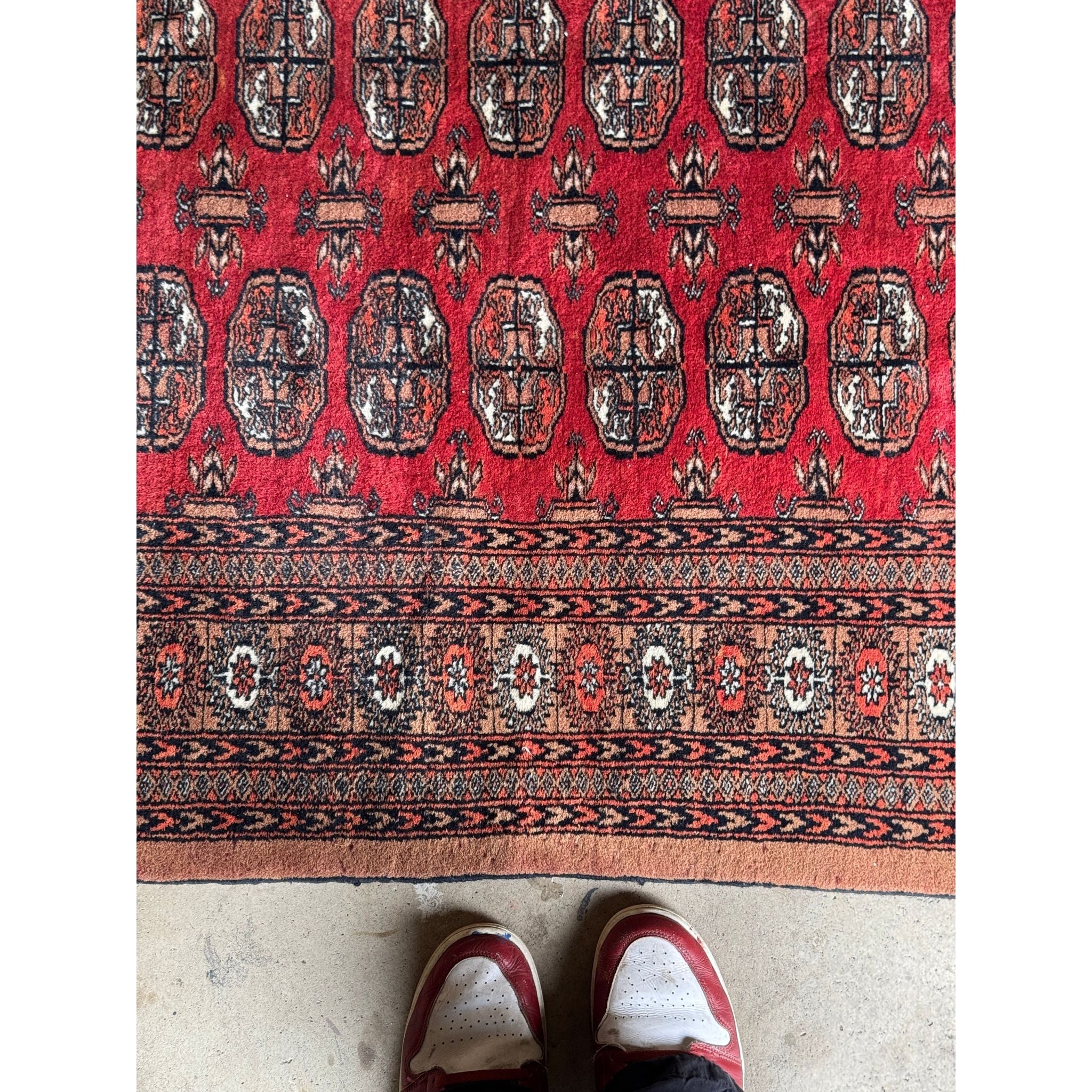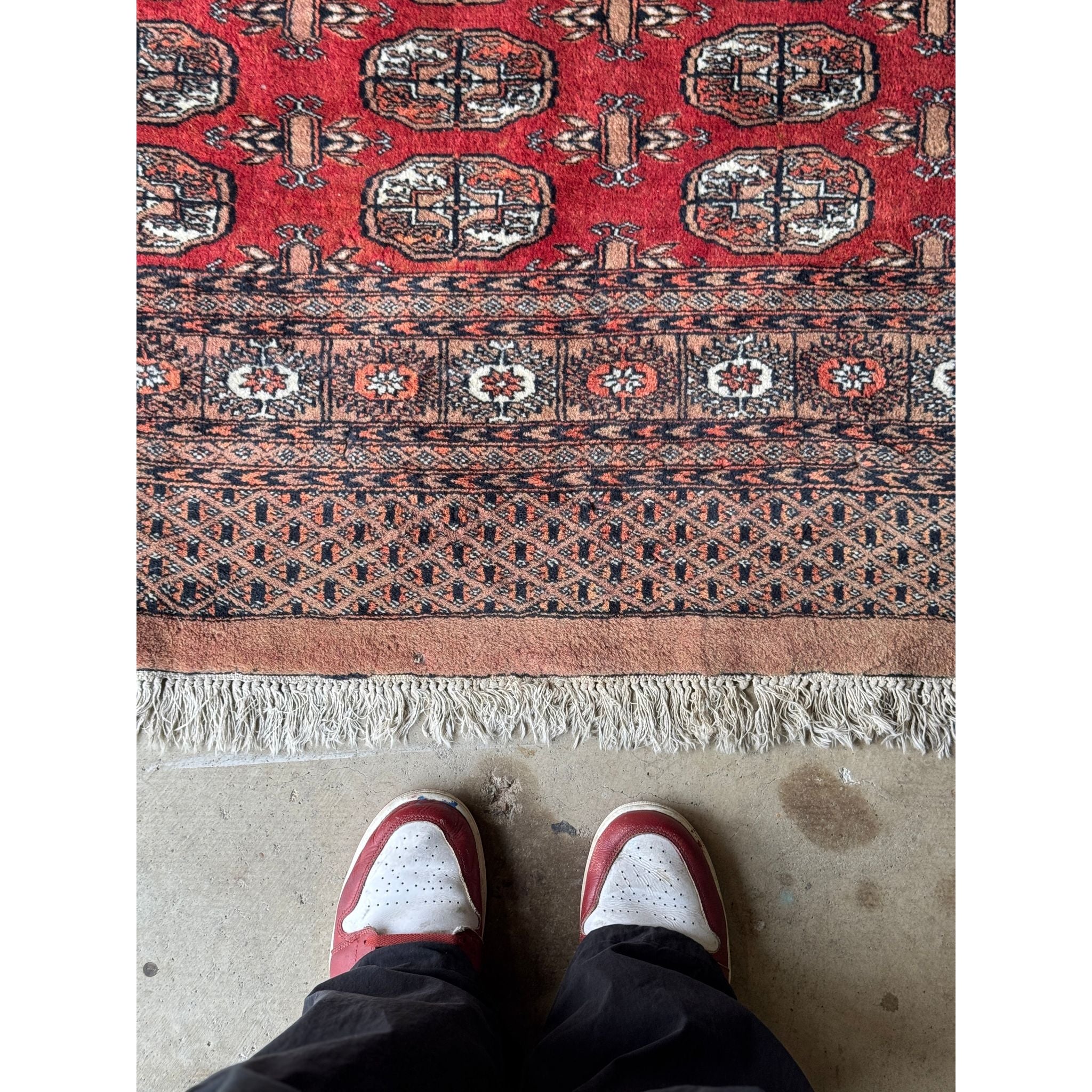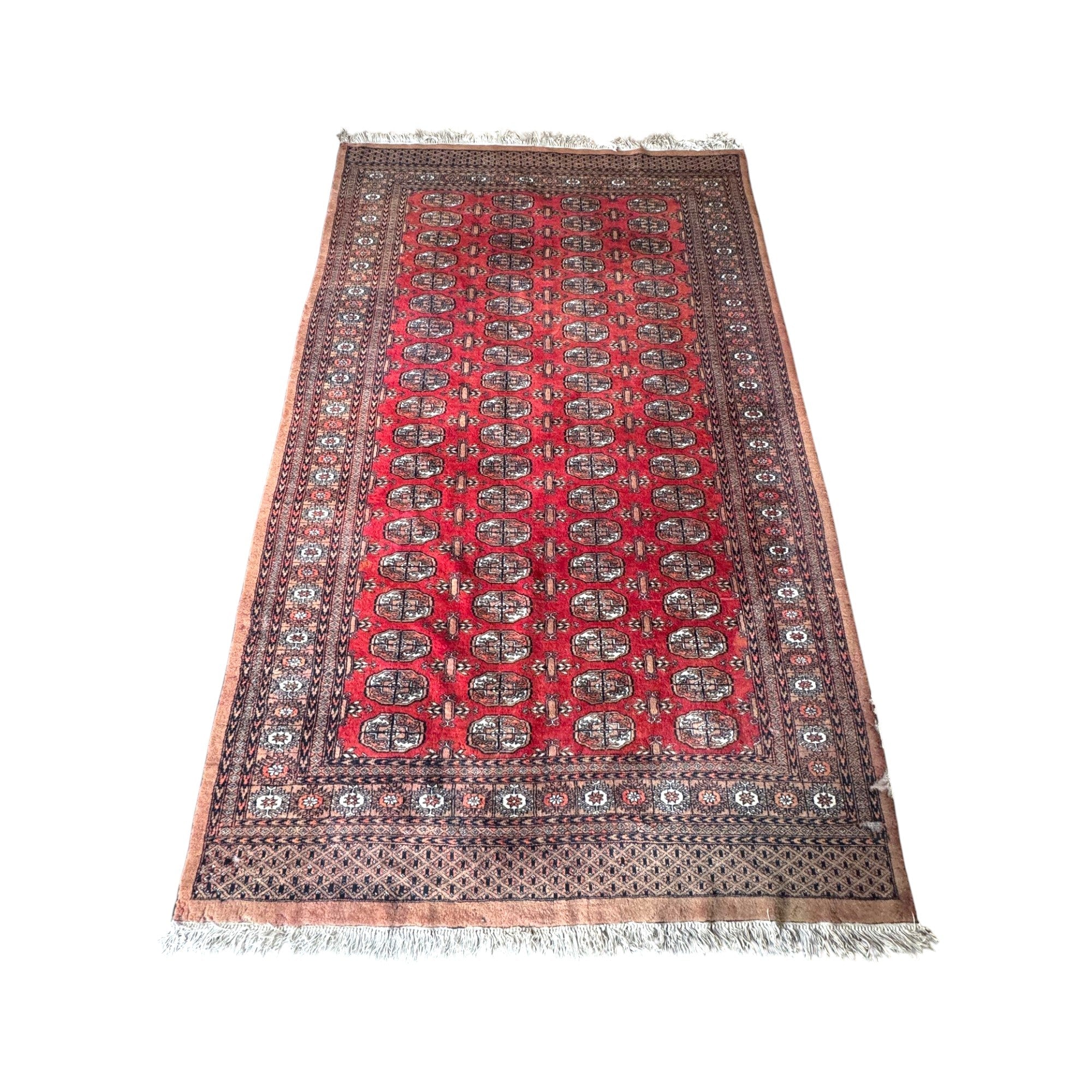 A classic vintage Pakistani Bokhara carpet, handknotted in fine wool and featuring the traditional elephant’s foot gul motif in rich tones of red, rust and black. The intricate repeating pattern is framed by multiple geometric borders, showcasing the craftsmanship and balance typical of Bokhara weaving.