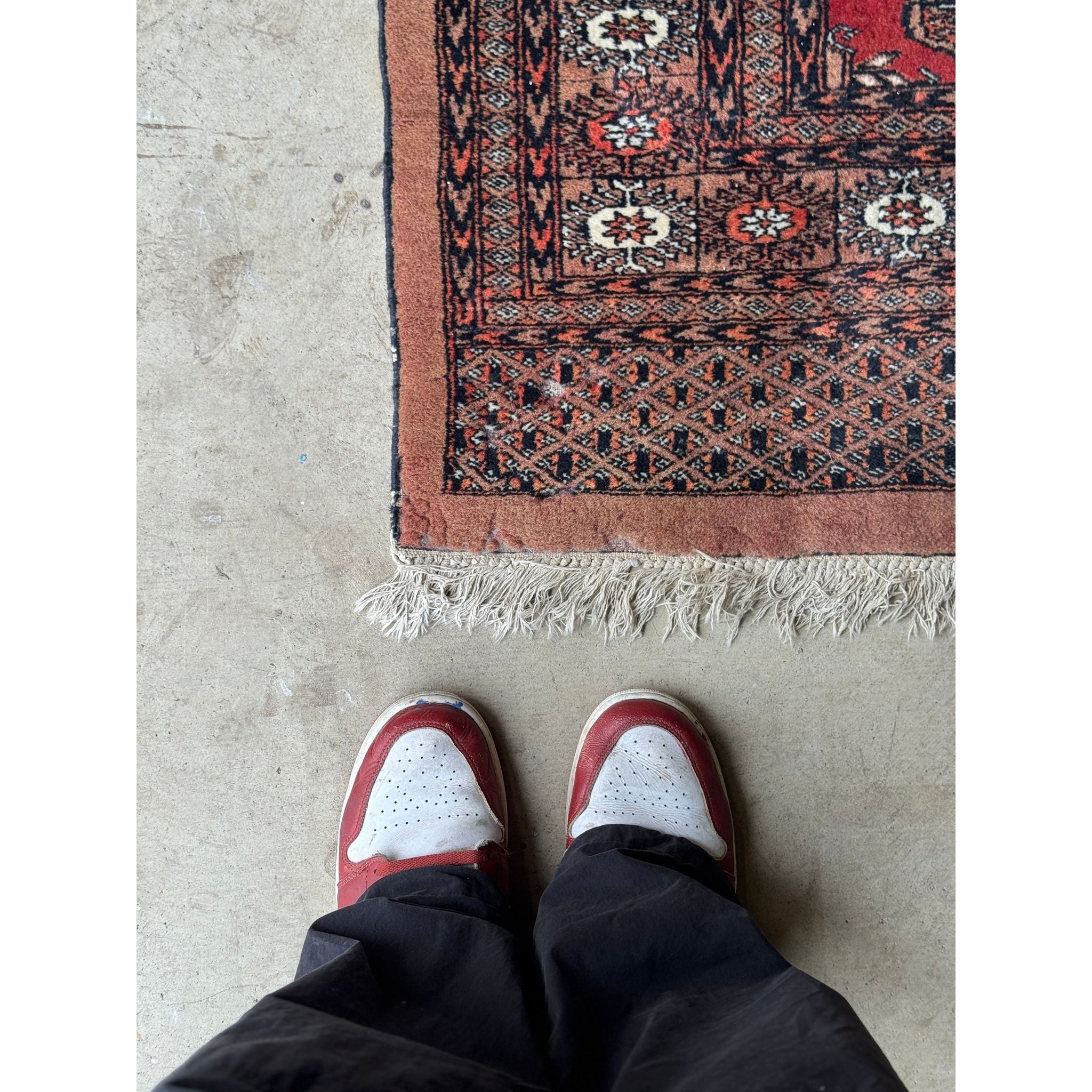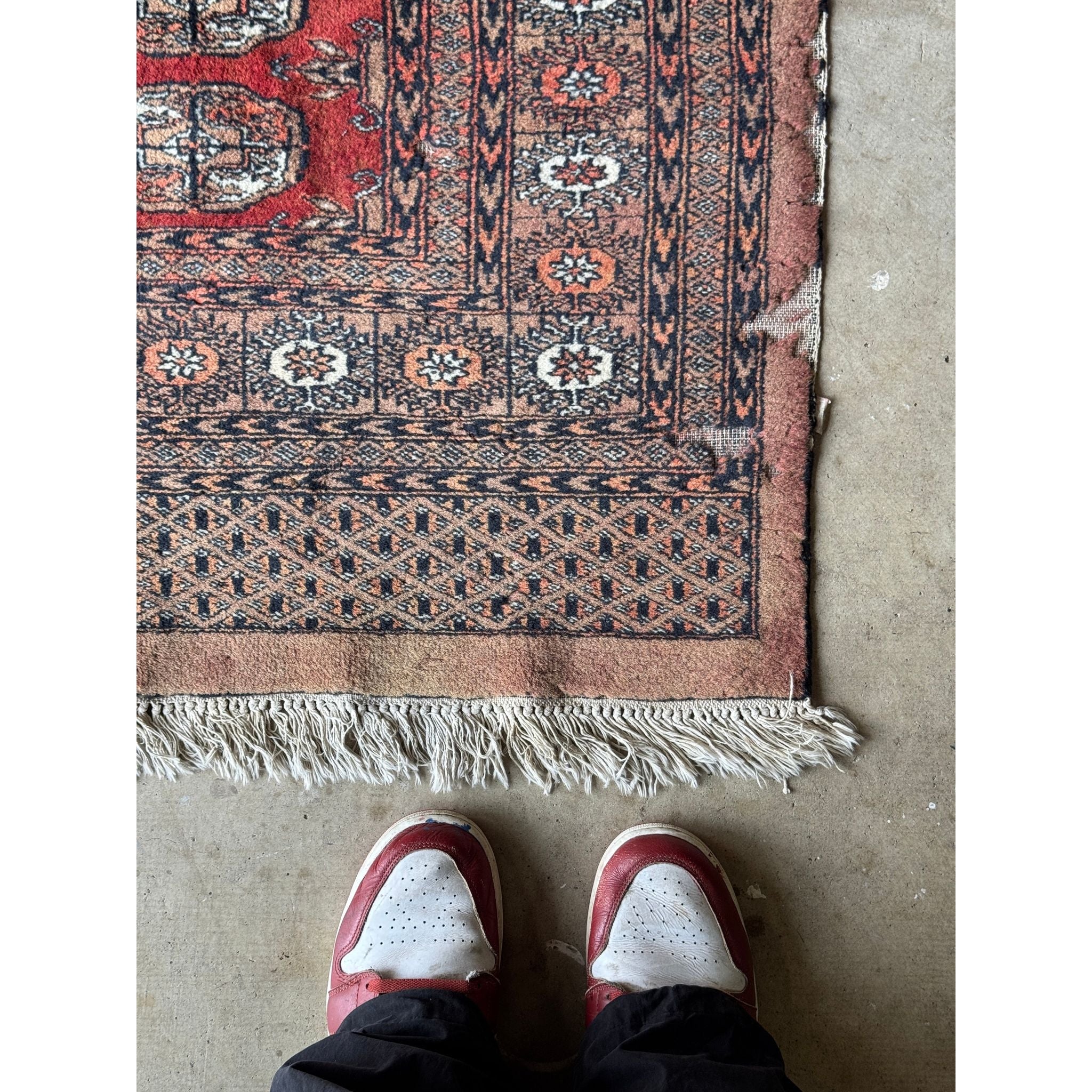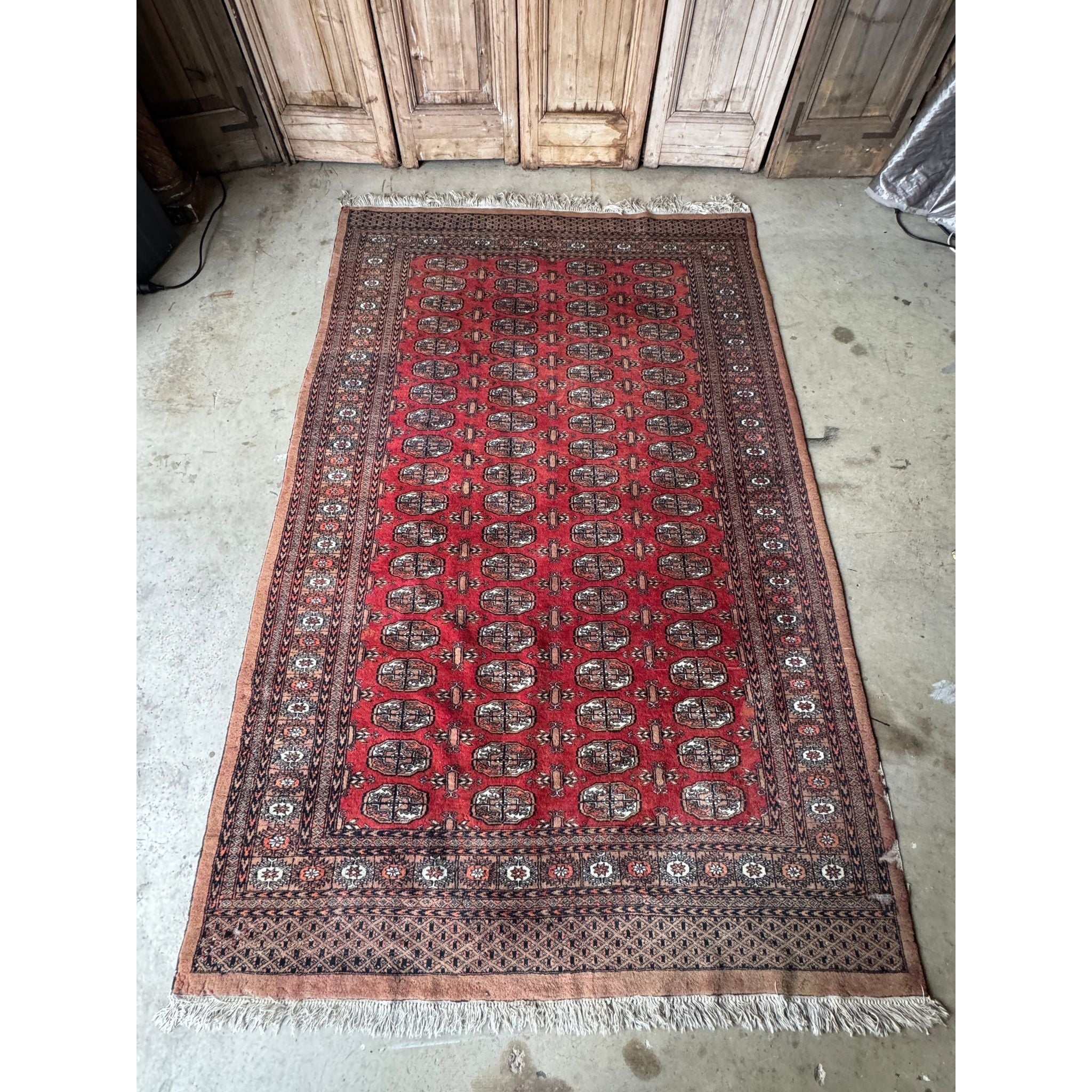 A classic vintage Pakistani Bokhara carpet, handknotted in fine wool and featuring the traditional elephant’s foot gul motif in rich tones of red, rust and black. The intricate repeating pattern is framed by multiple geometric borders, showcasing the craftsmanship and balance typical of Bokhara weaving.