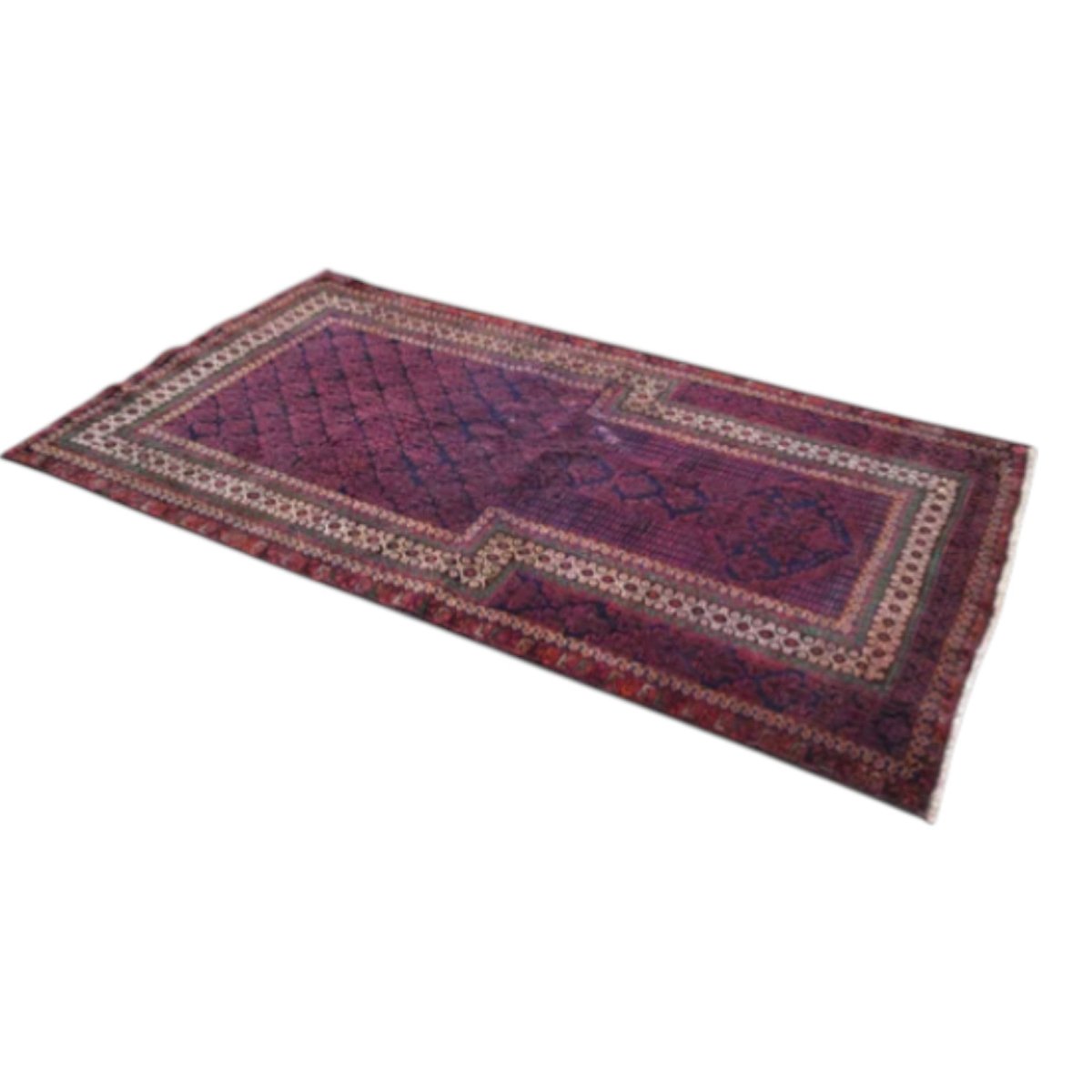 Rich in colour and intricate detail, this handwoven Persian Balouchi rug features deep purple and crimson tones with fine geometric motifs throughout.