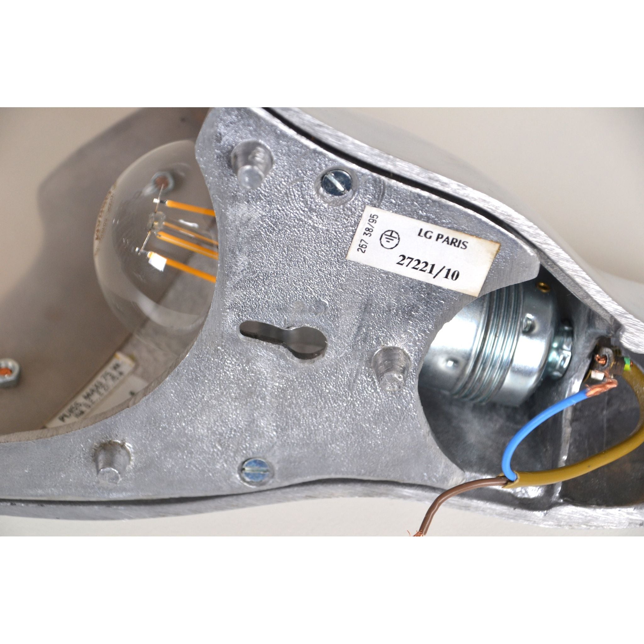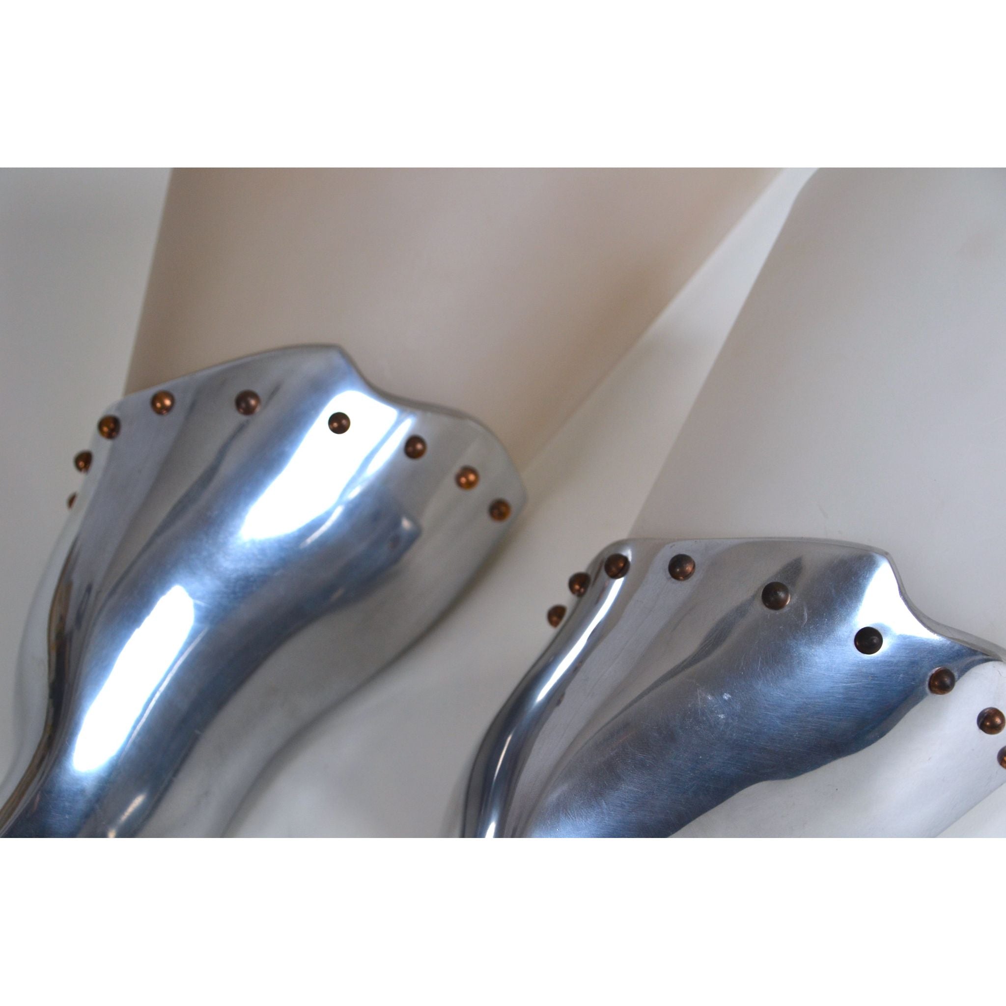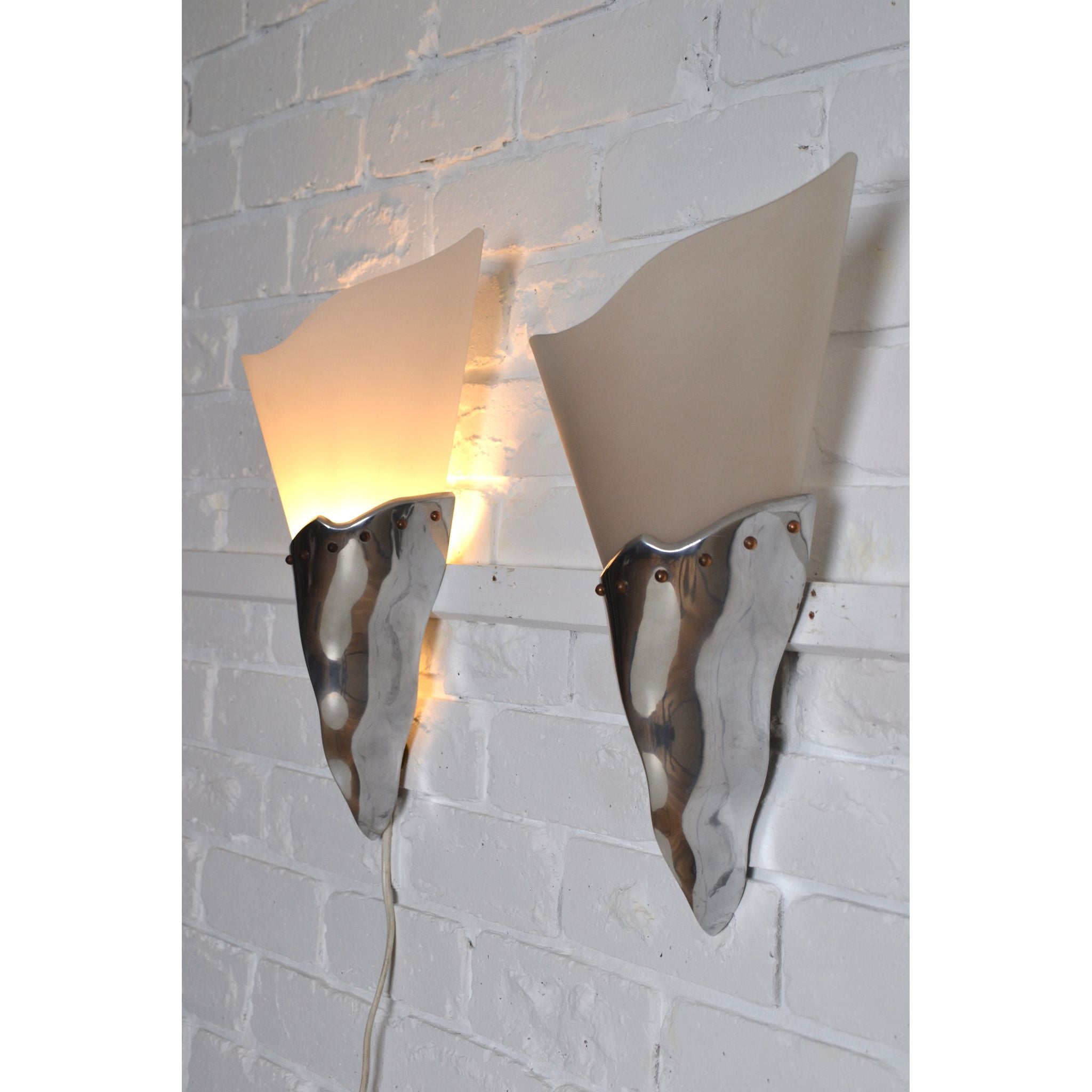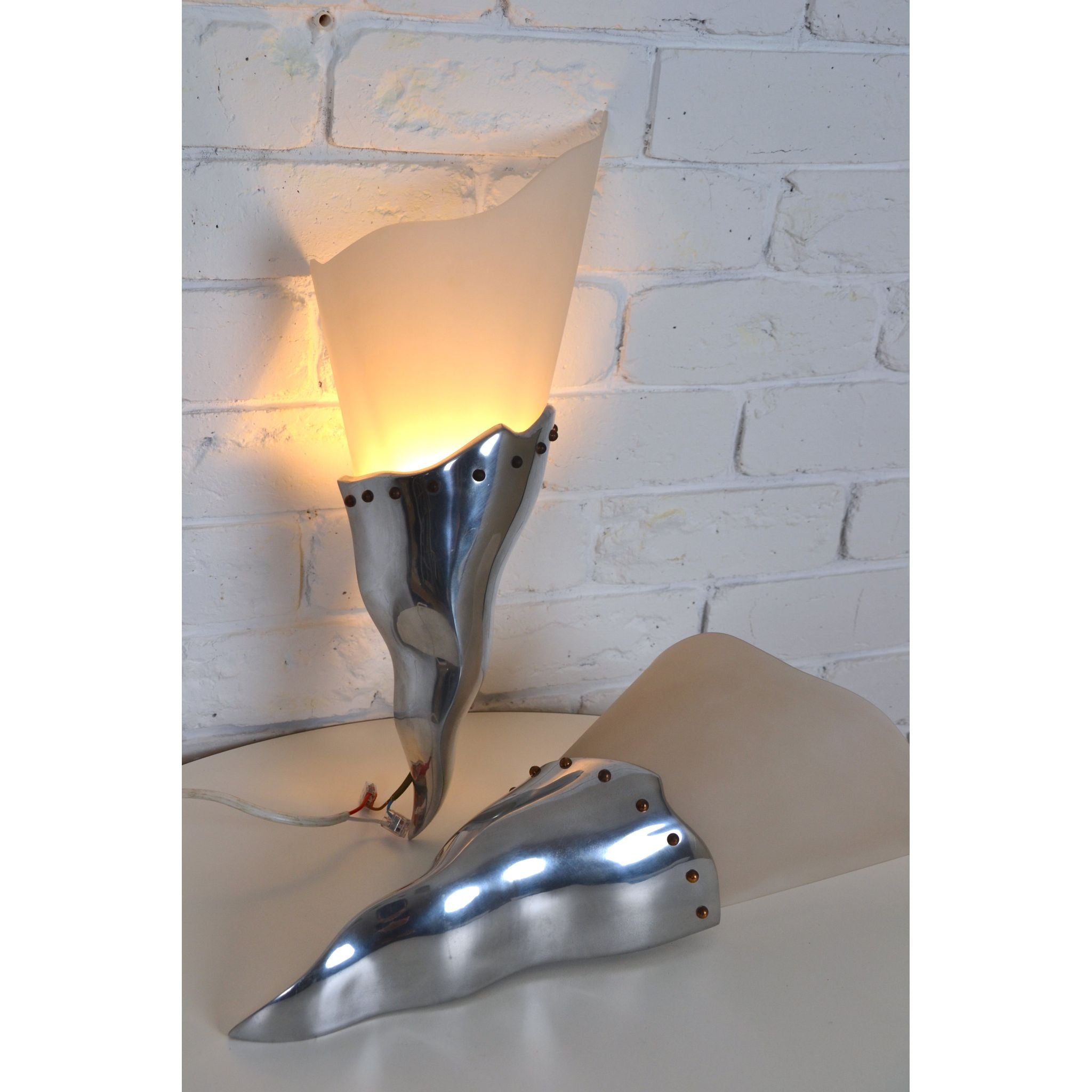 Stunning rare pair of post modern design. Highly collectable & sort after. Made by Maison Lucien Gau, Paris, France. Stamped 1995. Heavy weighted cast aluminium with acrylic diffusers with attractive decorative copper rivets.
