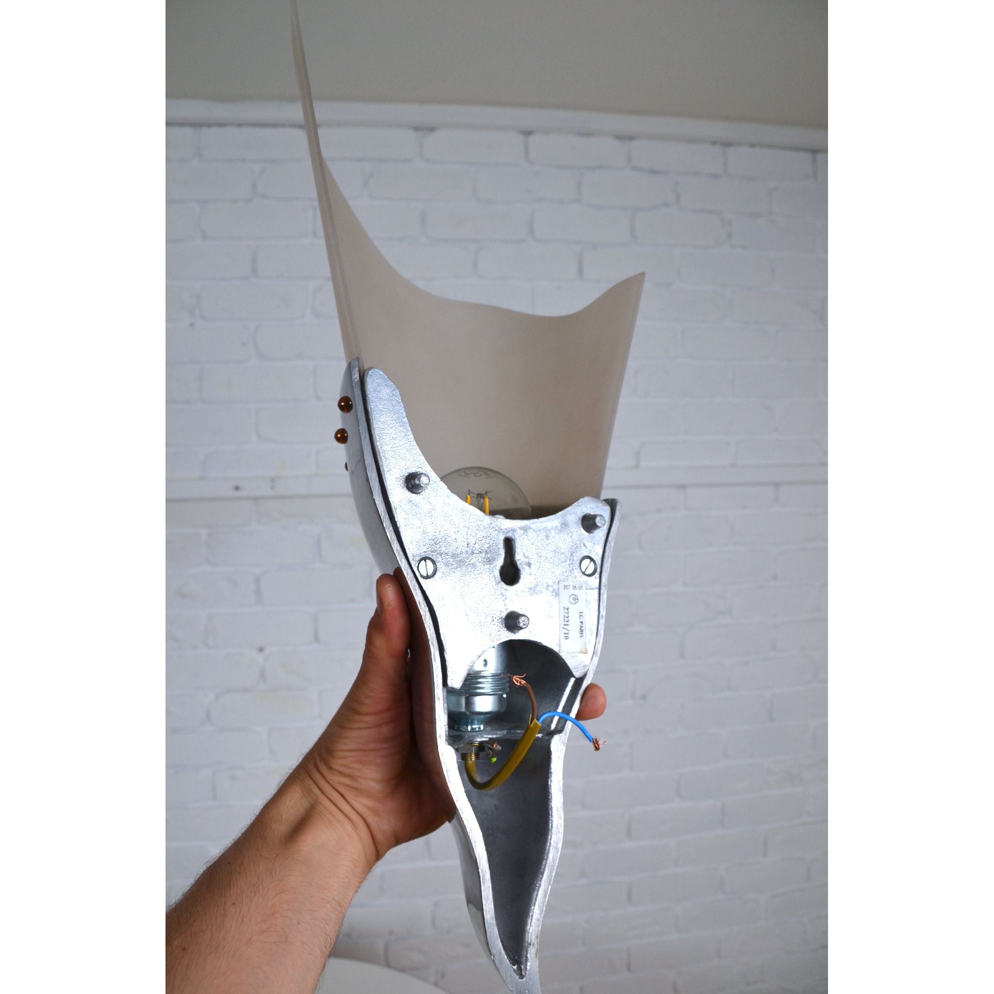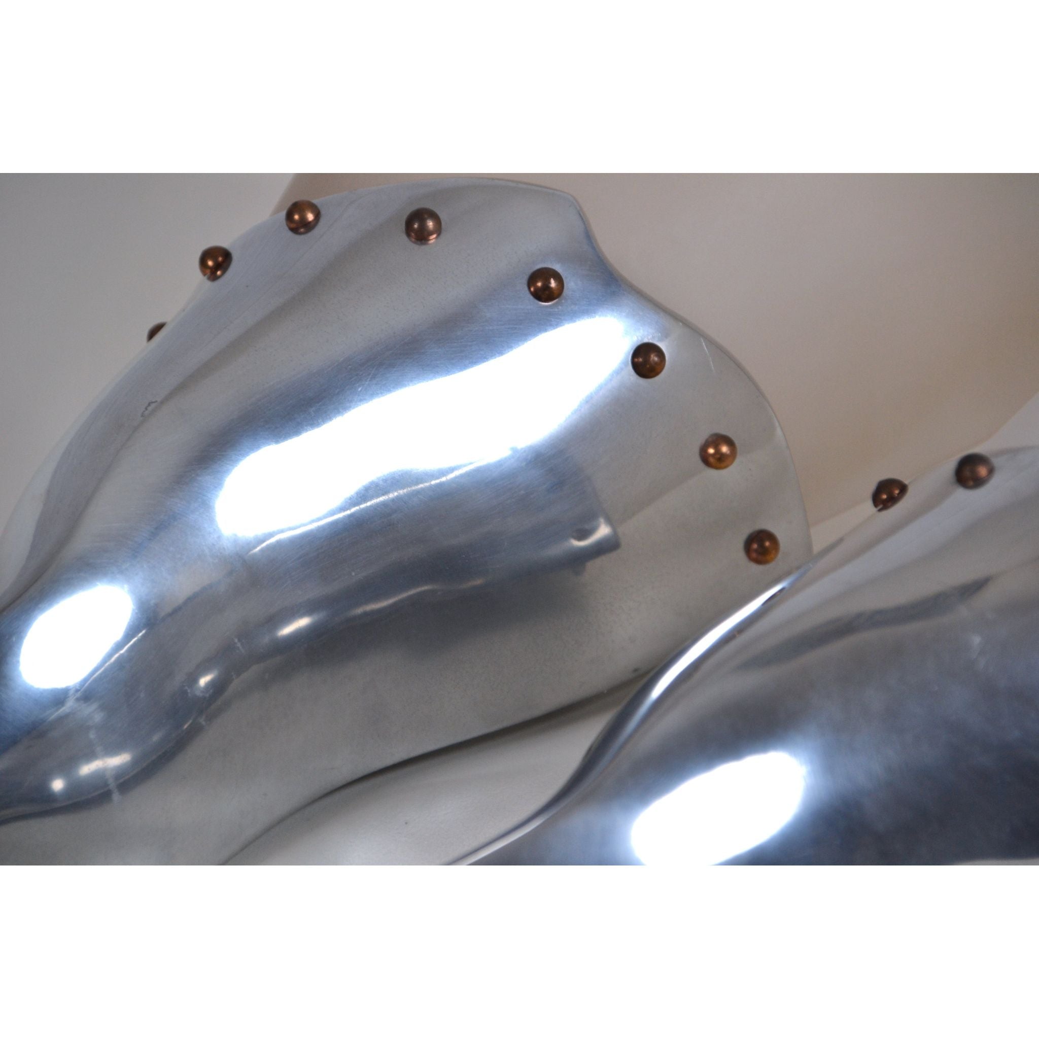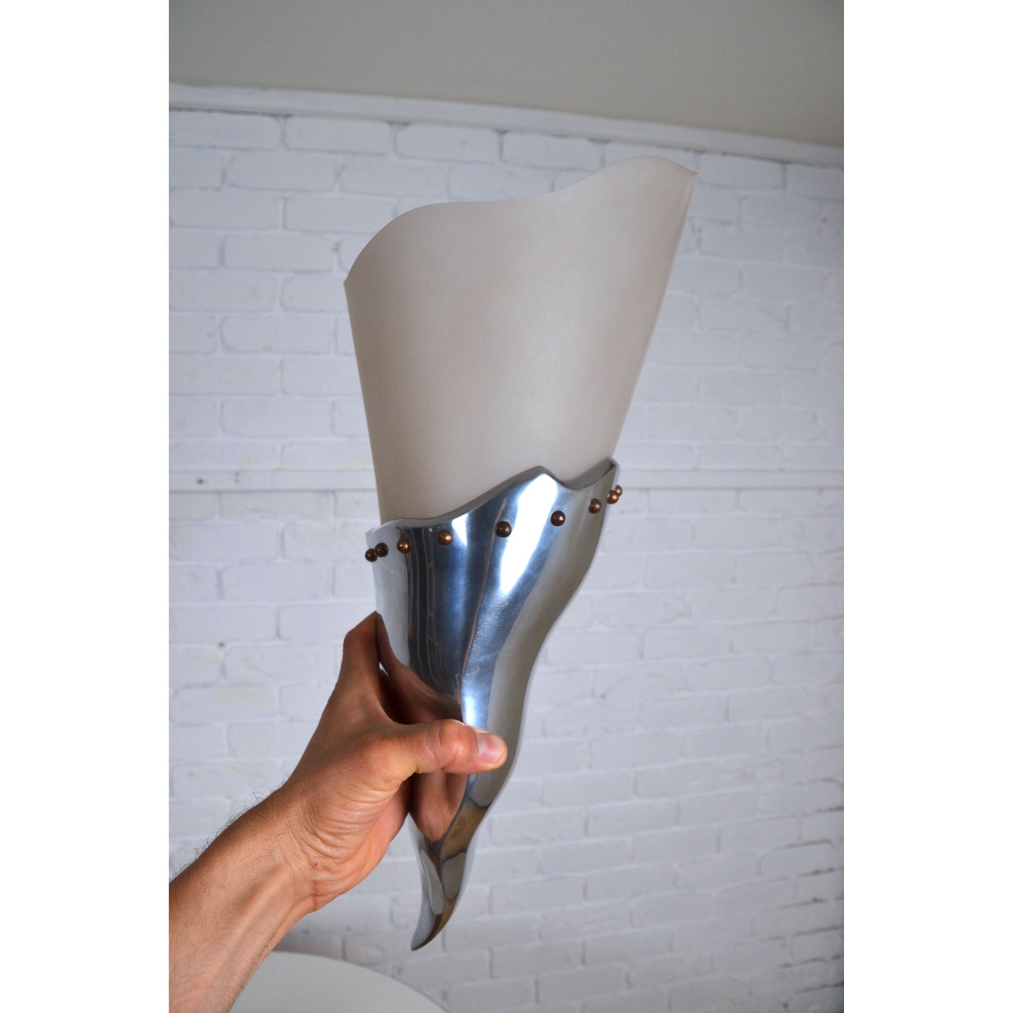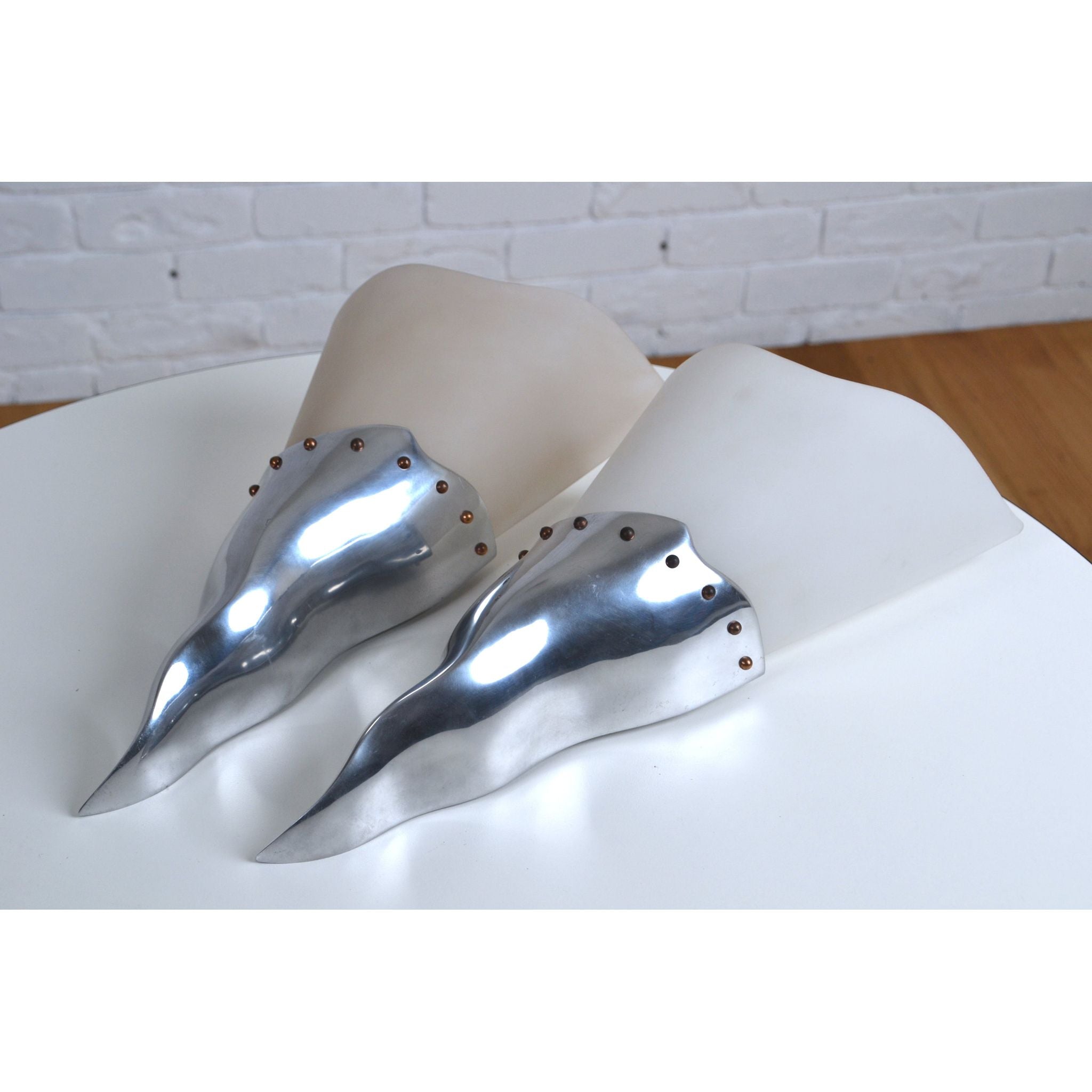Stunning rare pair of post modern design. Highly collectable & sort after. Made by Maison Lucien Gau, Paris, France. Stamped 1995. Heavy weighted cast aluminium with acrylic diffusers with attractive decorative copper rivets.
