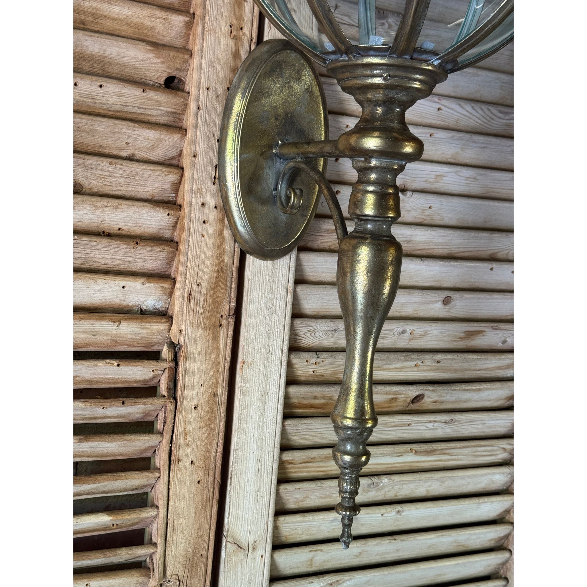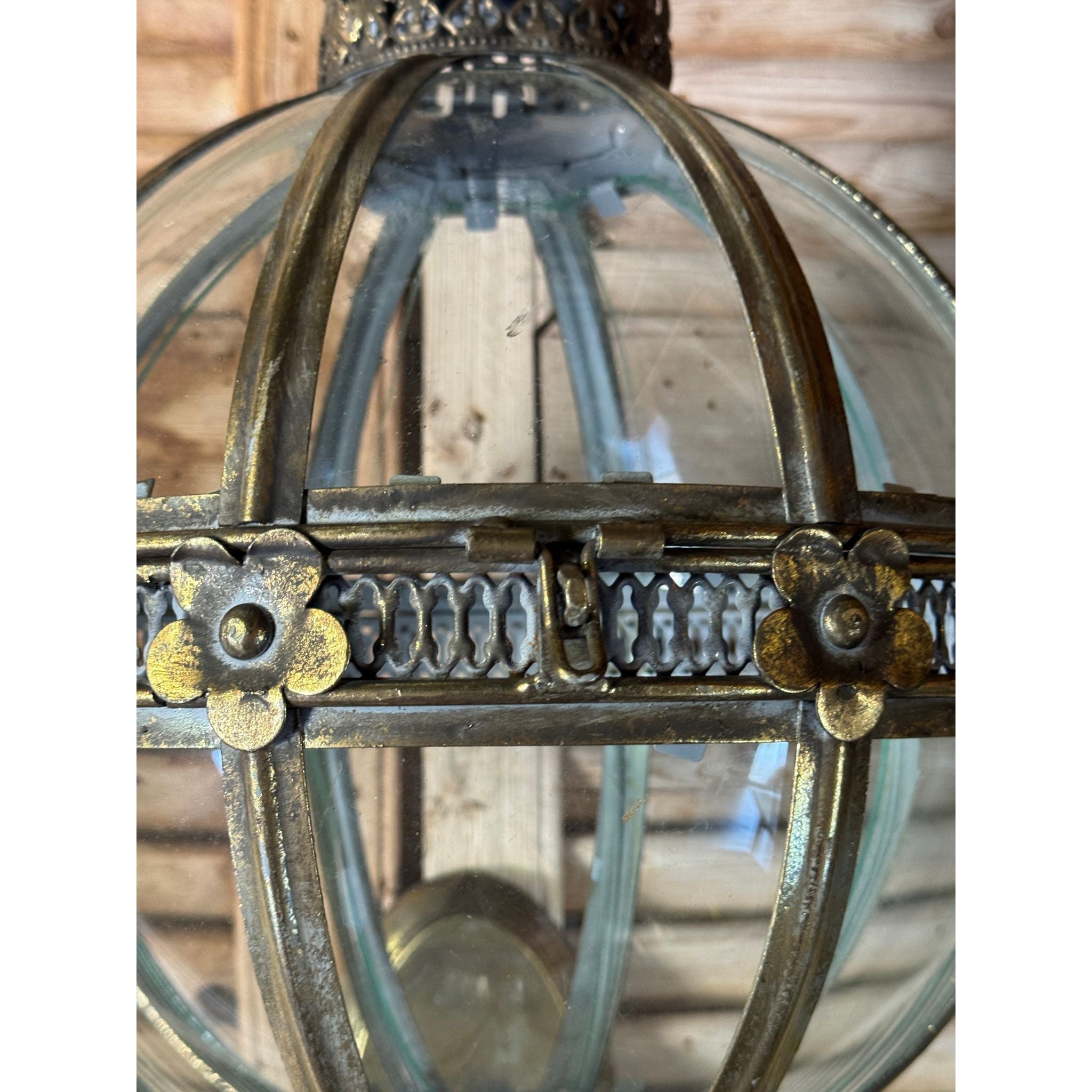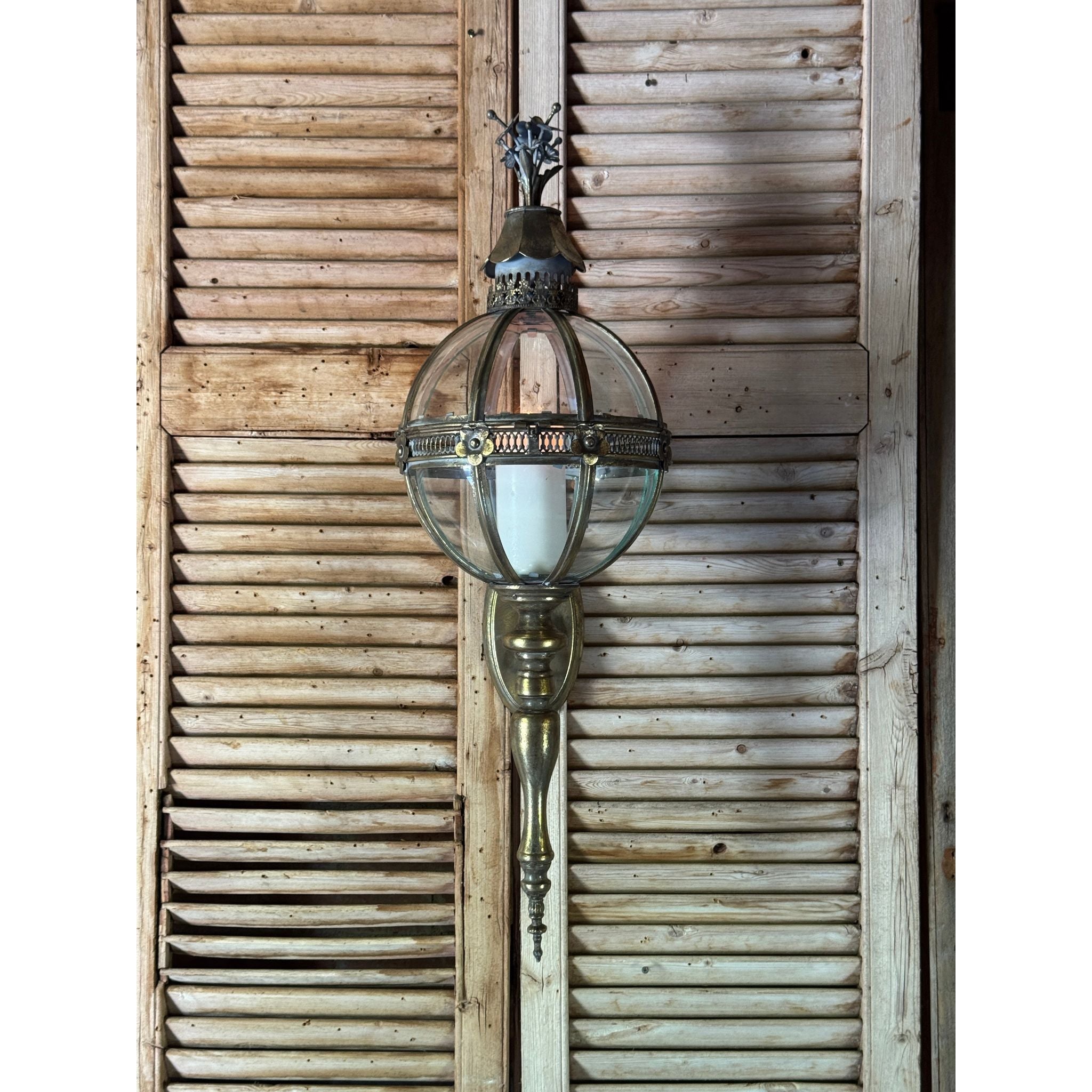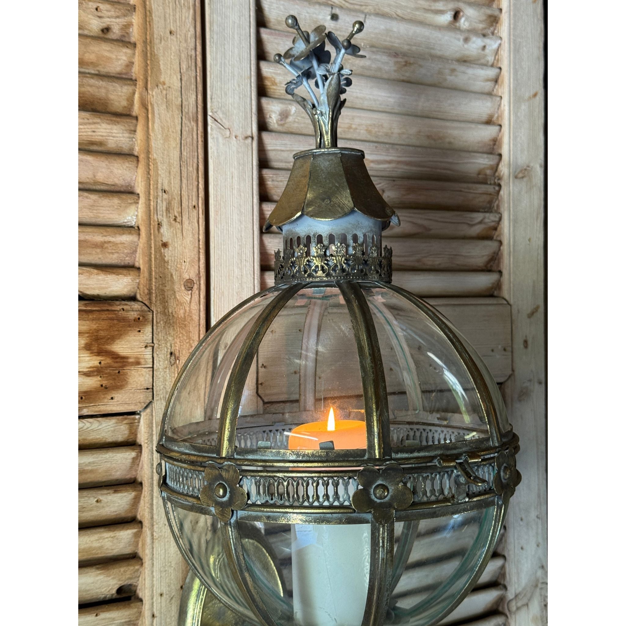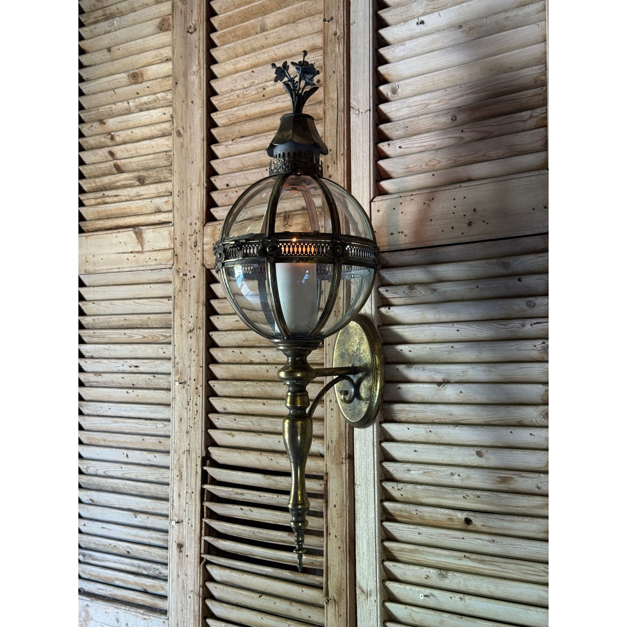 A beautifully detailed decorative wall lantern featuring a segmented glass globe framed in antiqued brass tone metal. The spherical body is accented with floral motifs and pierced banding, topped with a sculptural crown finial and finished with an elegant elongated drop. Inspired by classical European lantern forms with subtle neoclassical influence, this piece creates a warm architectural statement and works beautifully in hallways, entryways or flanking artwork and mirrors.