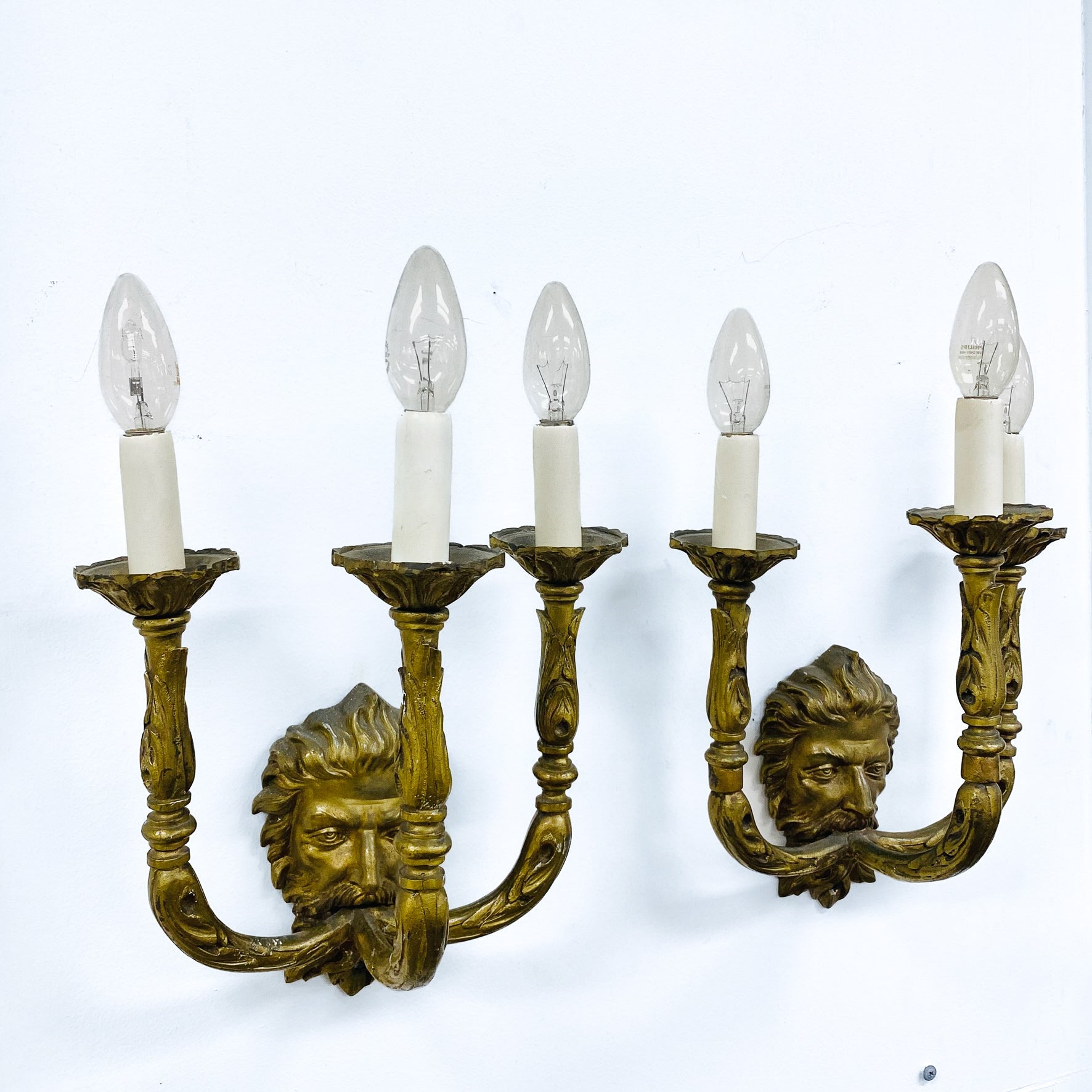 Stunning pair of early 20th century figural 3 armed wall sconces, in a Neoclassical or Empire style. Featuring a sculpted human face backplate with 3 scrolling arms and fluted light cups. Constructed from cast brass, with gorgeous patina.