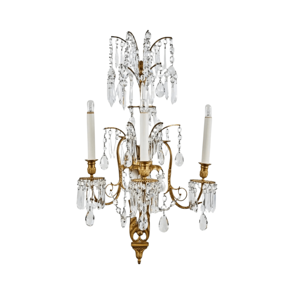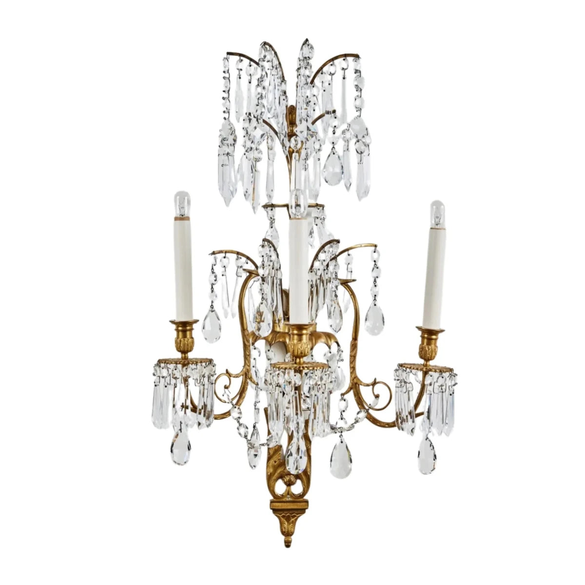 Russian wall sconces in gilt bronze frames embellished with foliate forms. Each with three, dramatic illuminated arms, and crowned by splayed fronds. All richly embellished with cut crystal drops throughout.