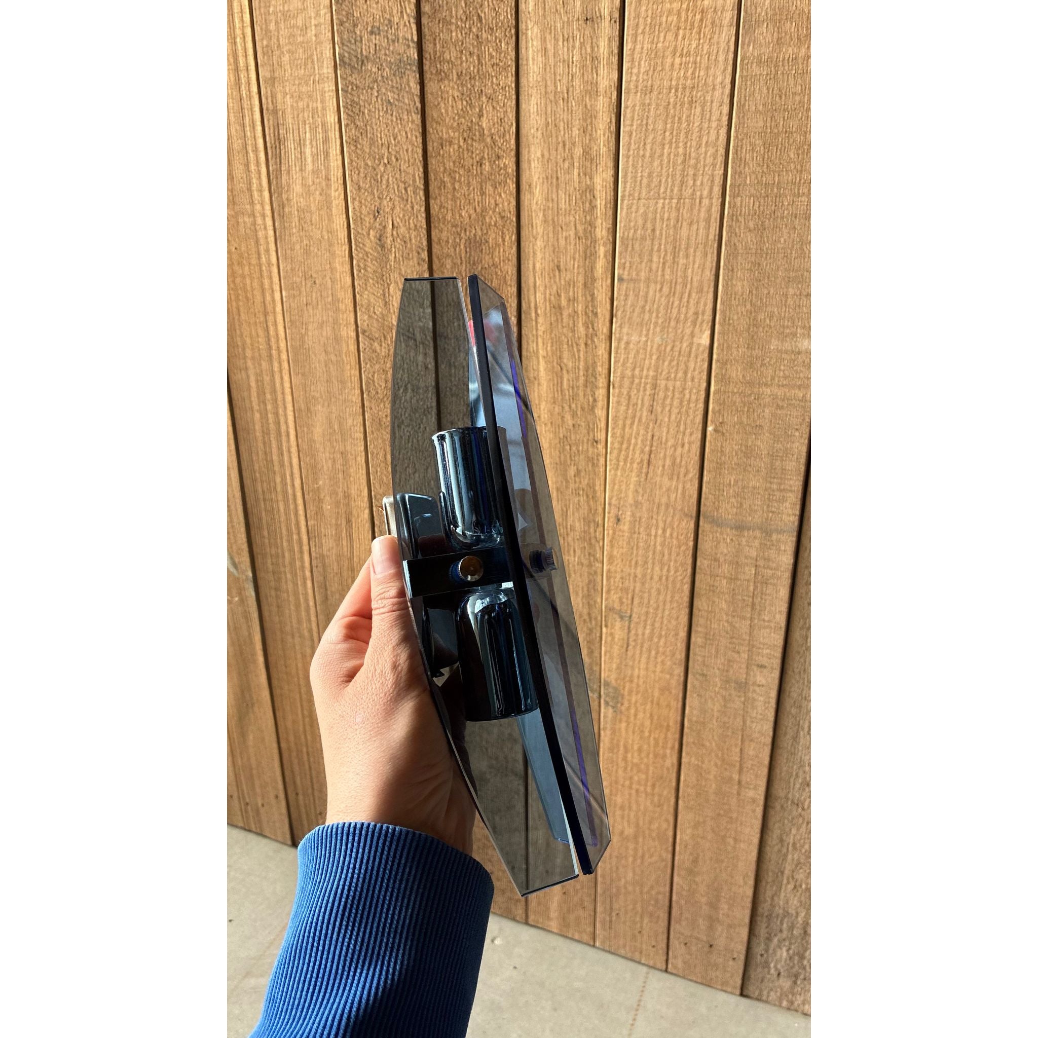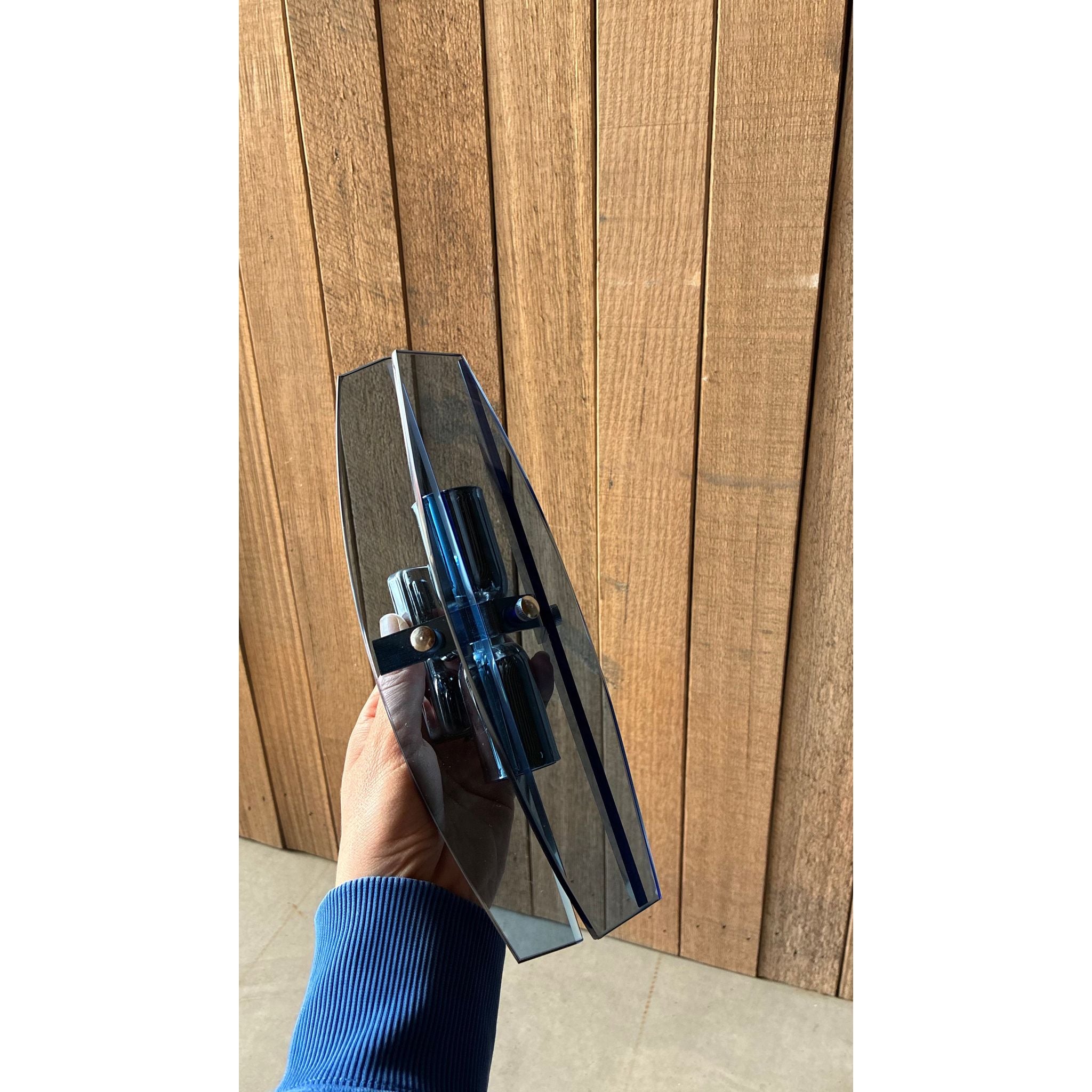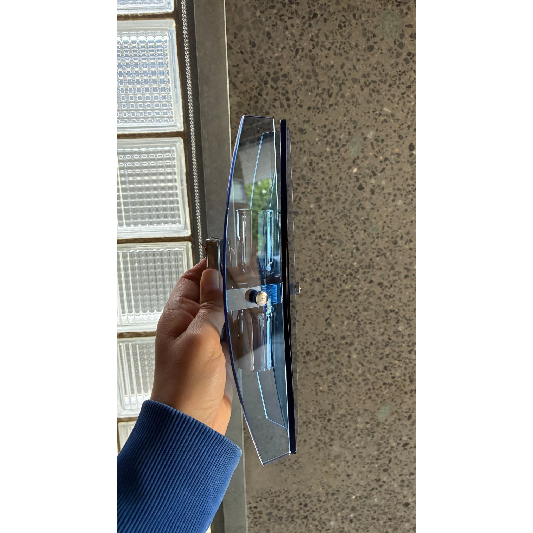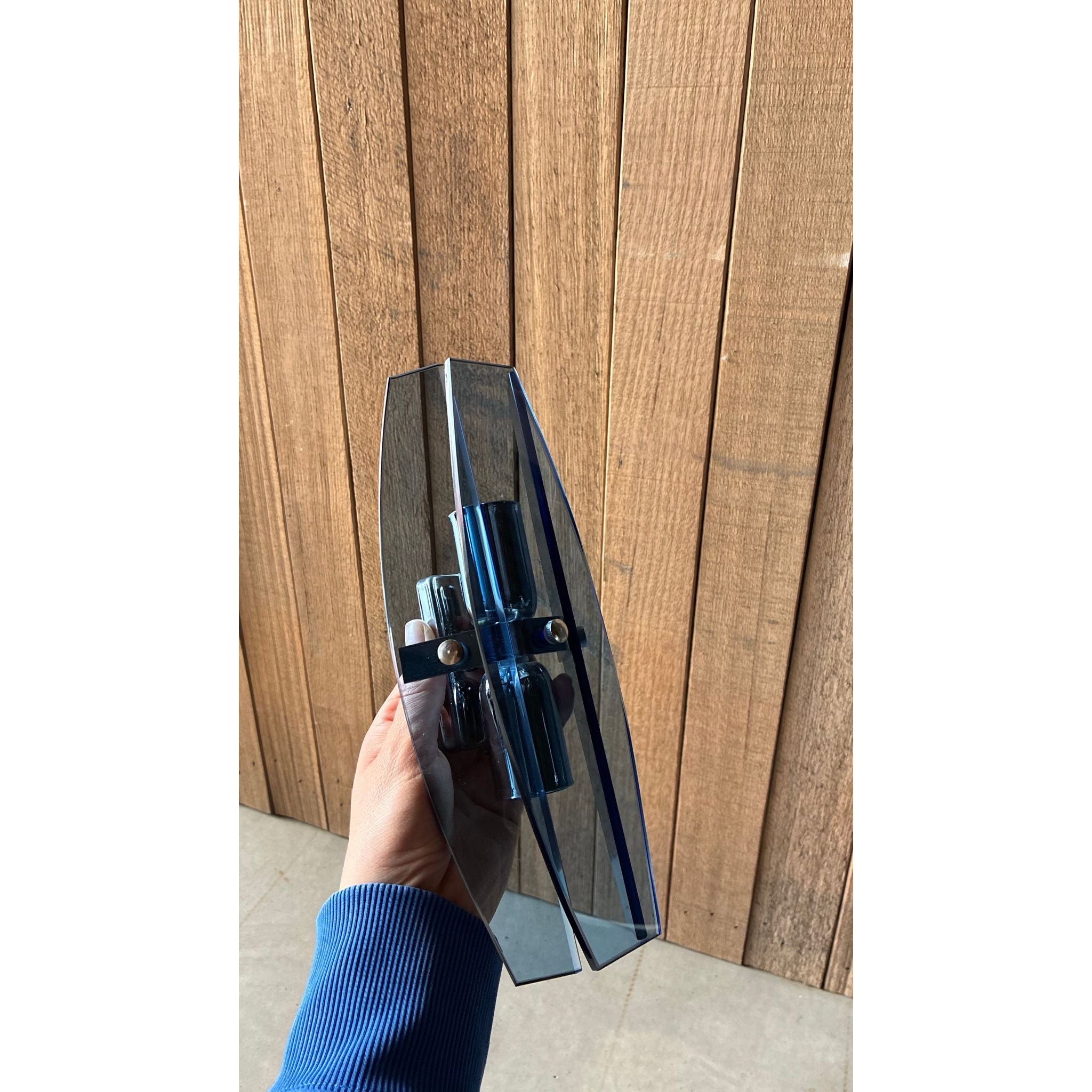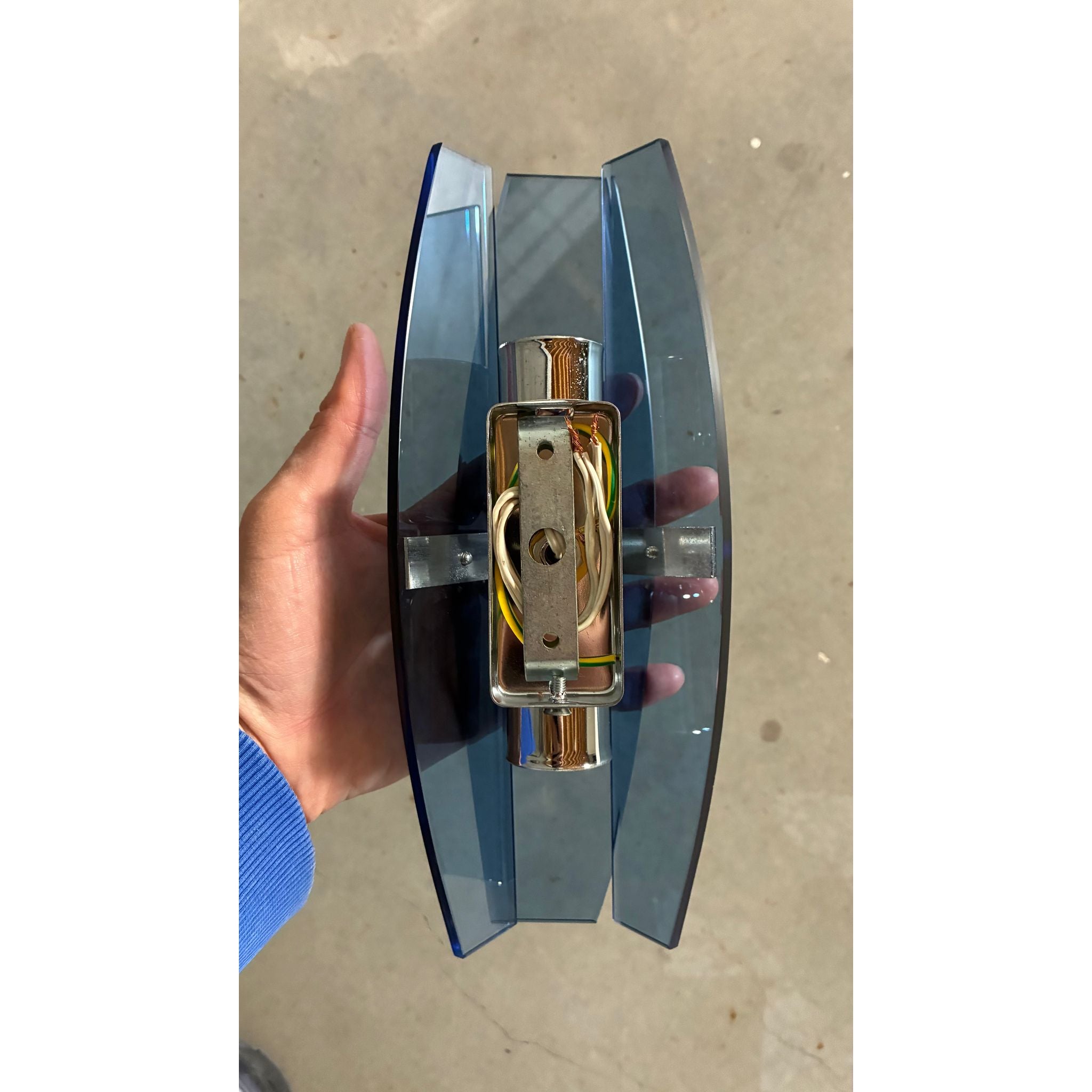 Two curved glass blades sit in a sculptural, tapered formation, framing a chrome-plated central mount and twin bulb holders. The play of colour, clarity and reflection is pure Veca: architectural jewel-like and instantly recognisable.
