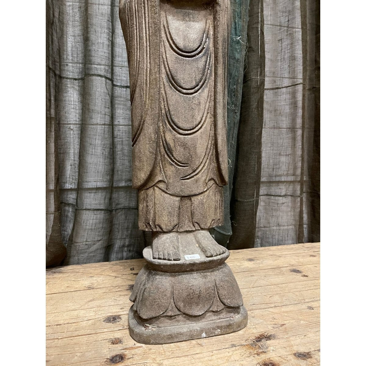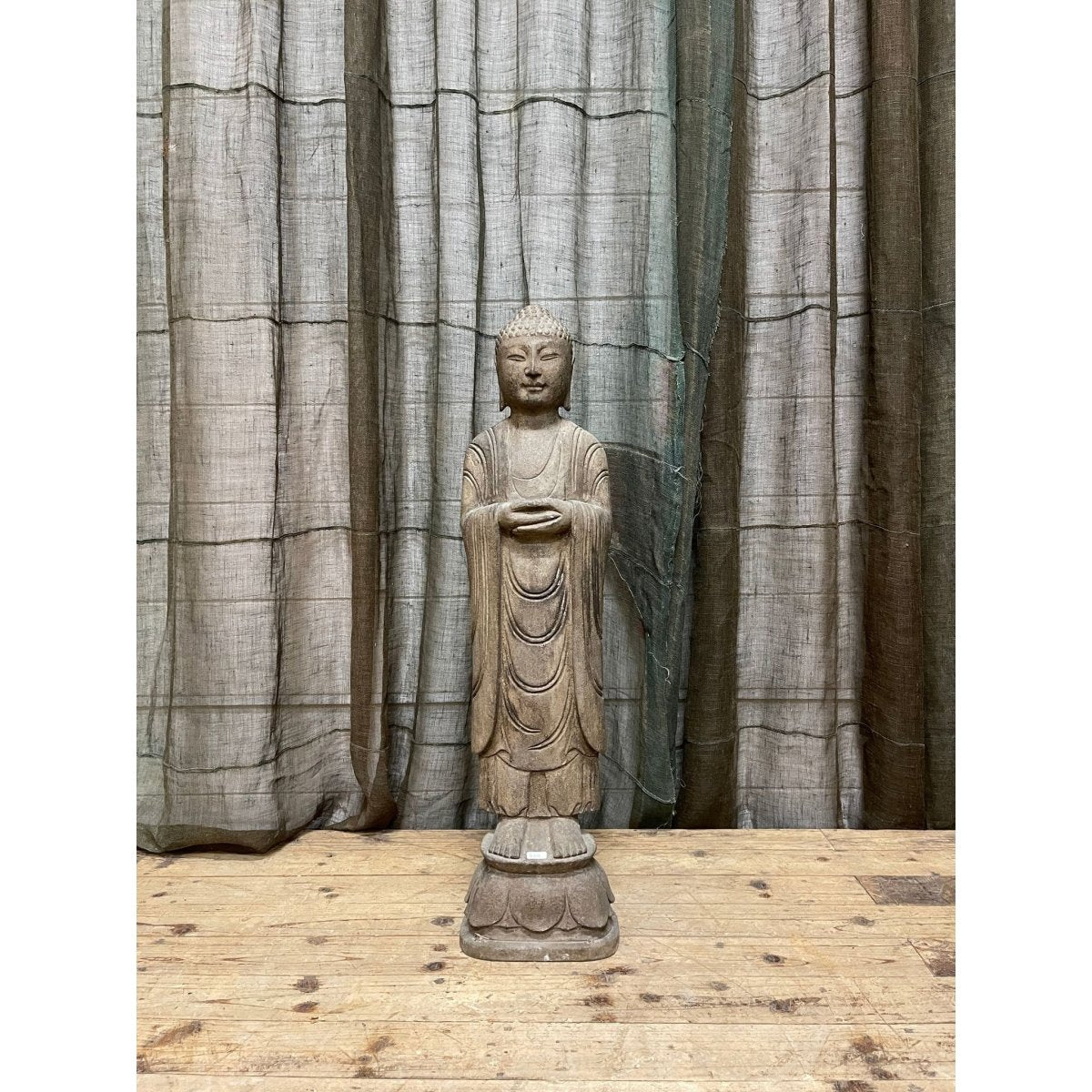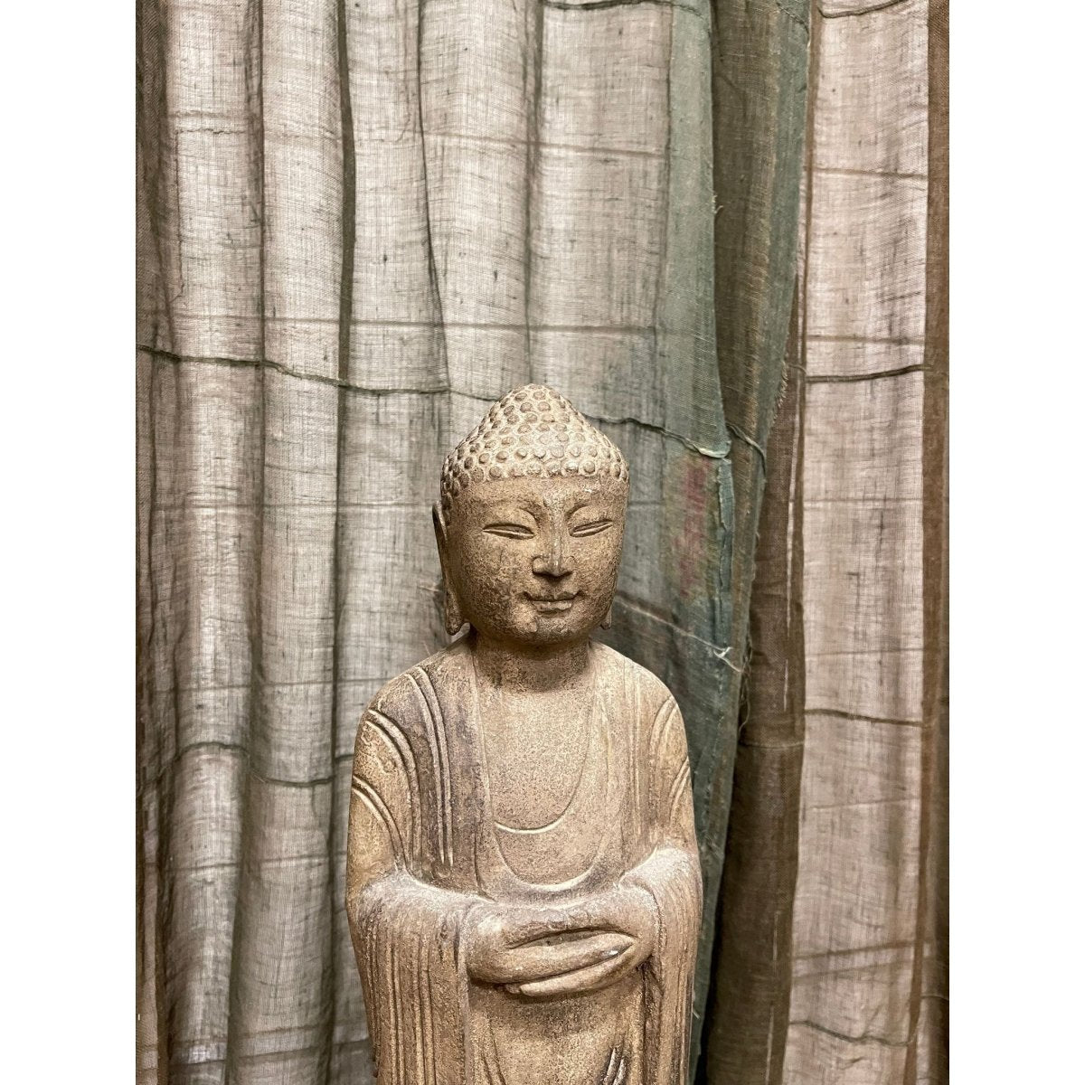 A Chinese standing buddha statue, made from hand carved stone. This buddha's hand's depict the Dhyana Mudra - The Gesture of Meditation and Balance, representing the deep concentration and introspection that lead to enlightenment.