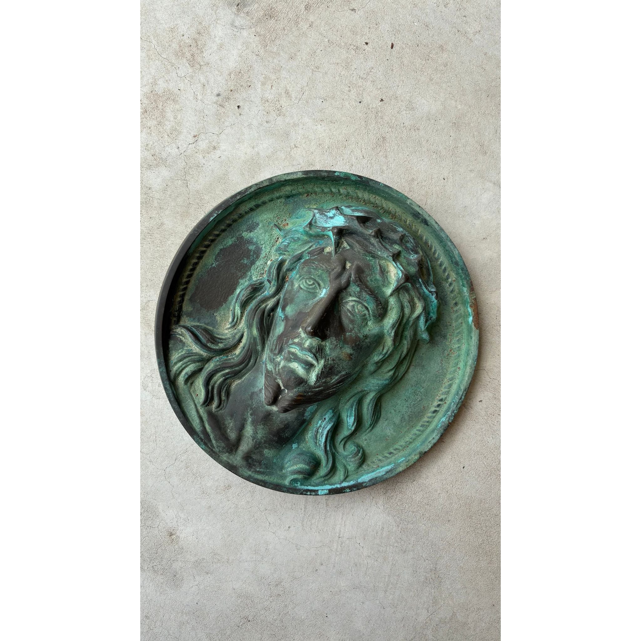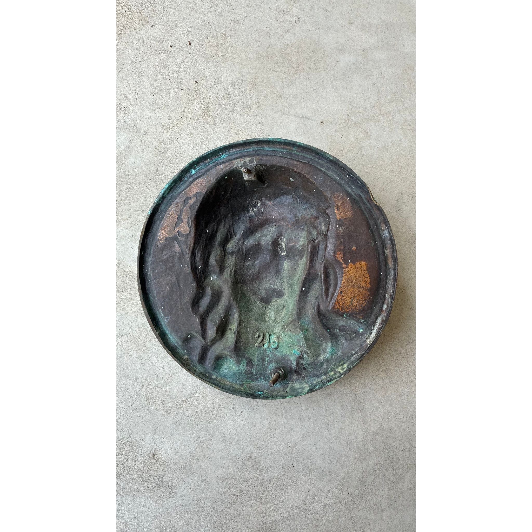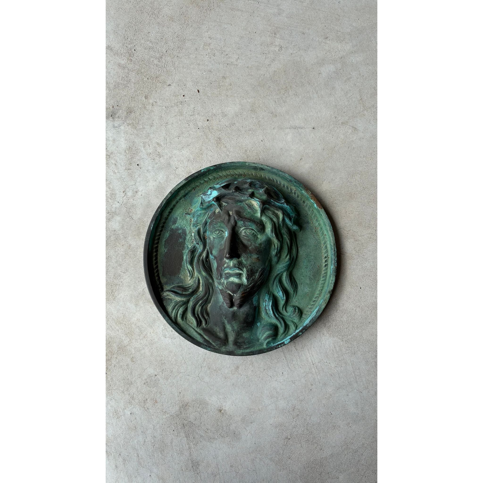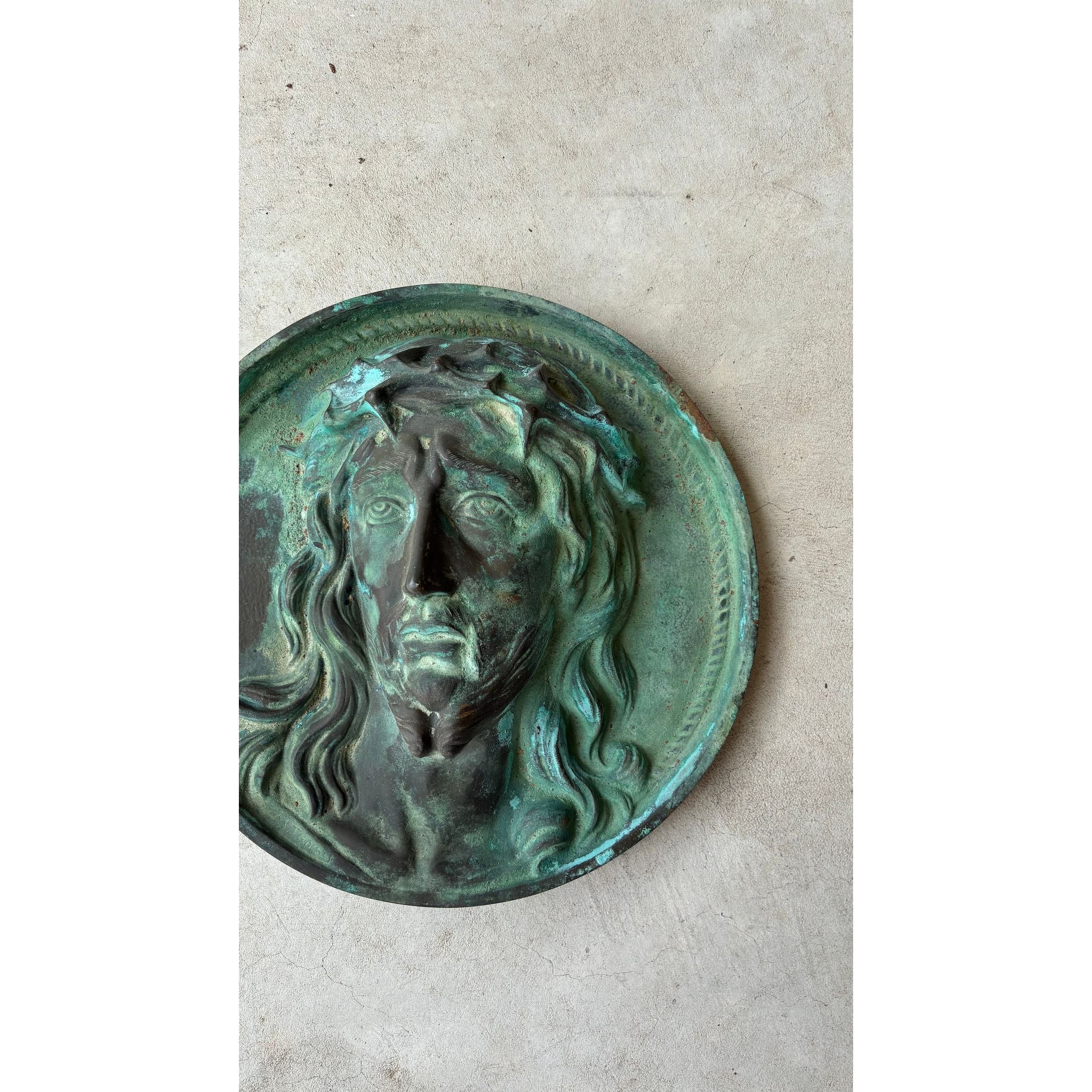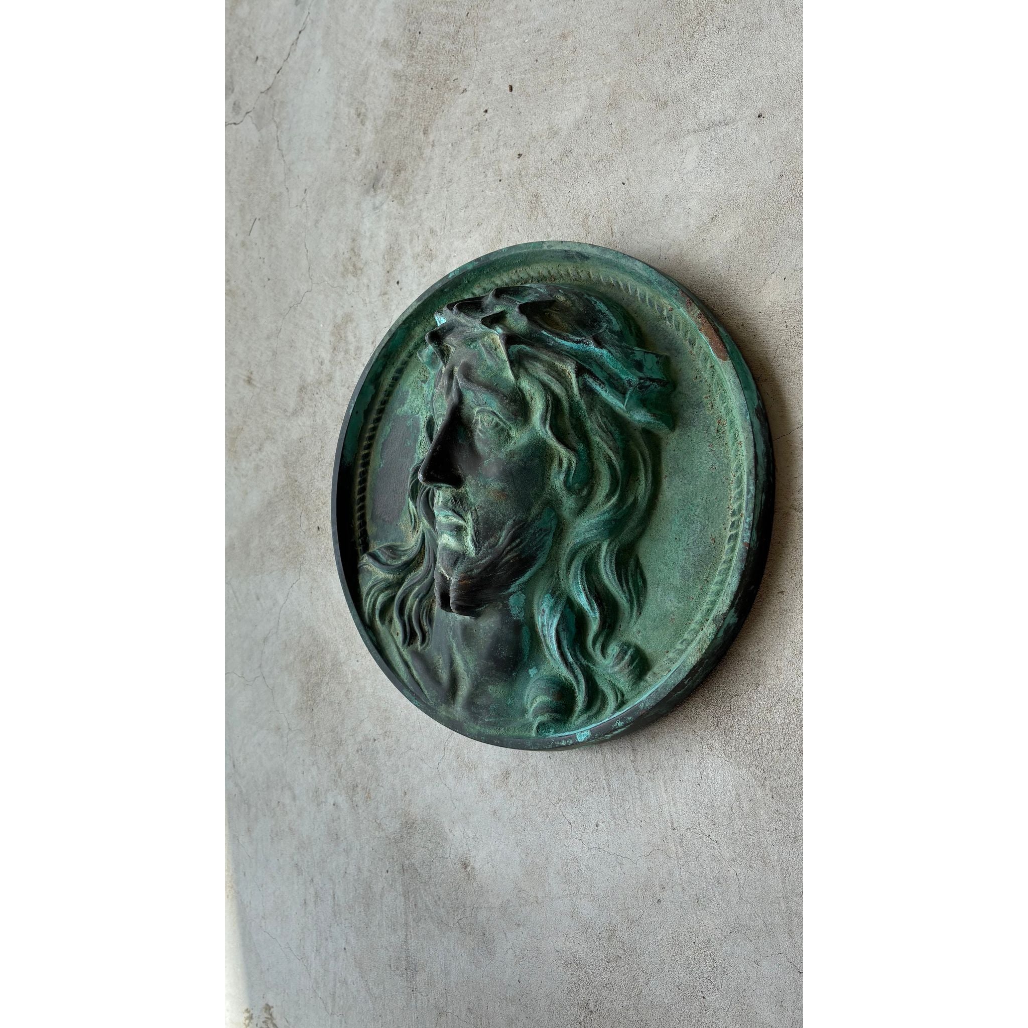 A compelling French bronze relief depicting Christ crowned with thorns, cast in solid bronze and intended to be mounted on a door or timber surface. The circular form and raised border echo architectural ornament, yet the sculptural modelling and expressive detail give the piece a presence that stands beyond decoration.
