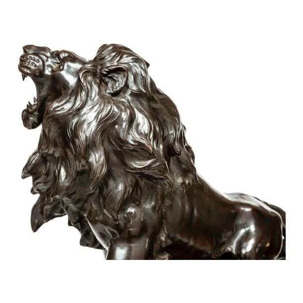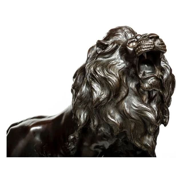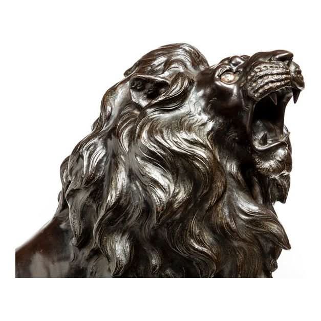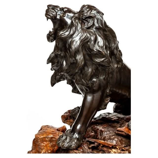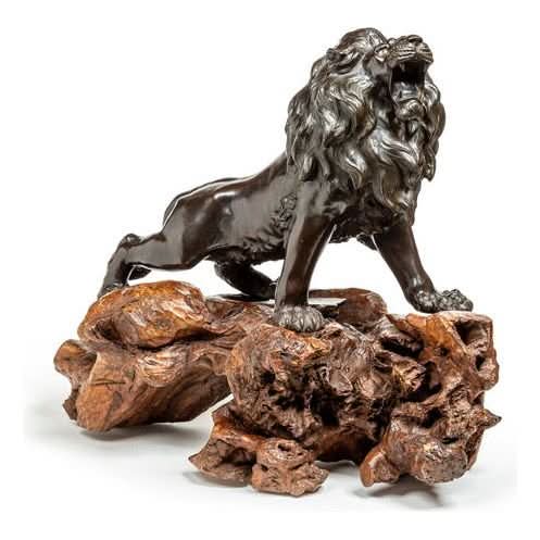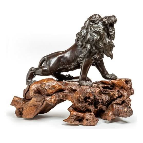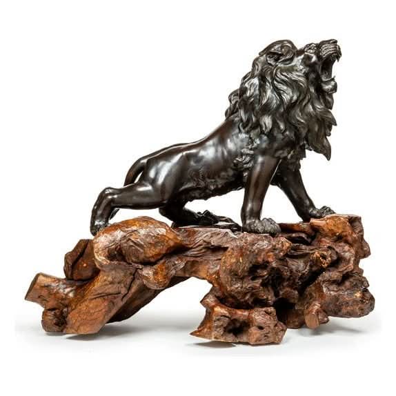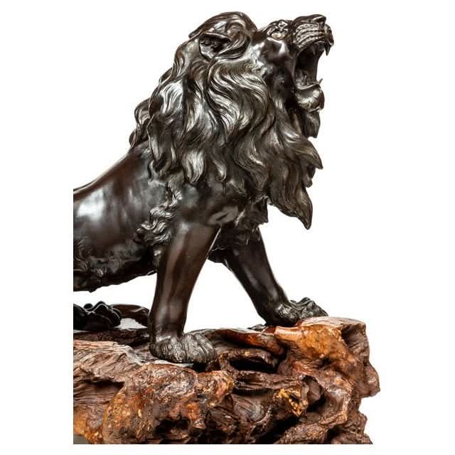 A very finely cast Japanese bronze figure of a prancing lion mounted on its original root wood base. The detail in the casting of the lion is Japanese Meiji period workmanship at its finest Original glass eyes and patina. Height 650, length 800, width400