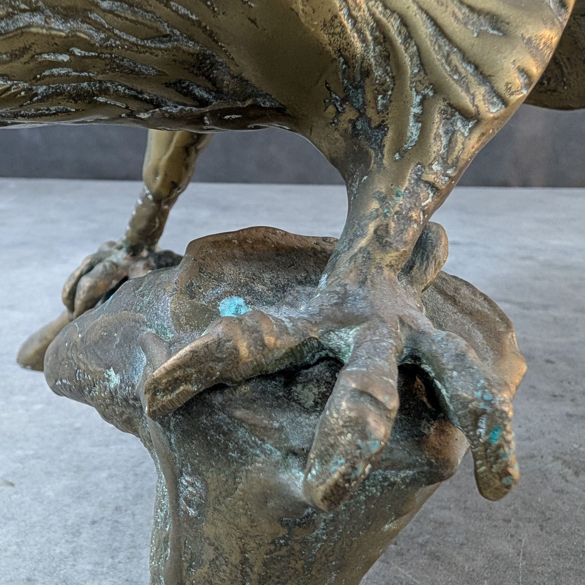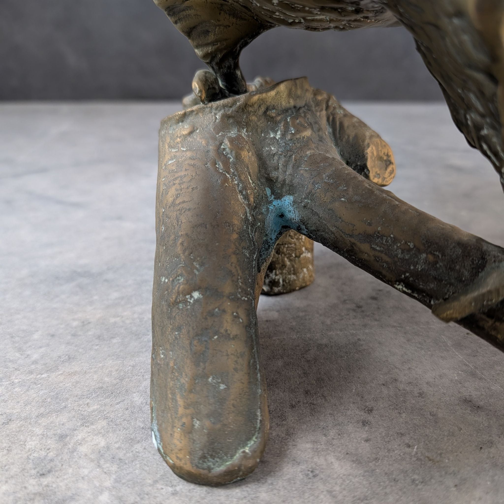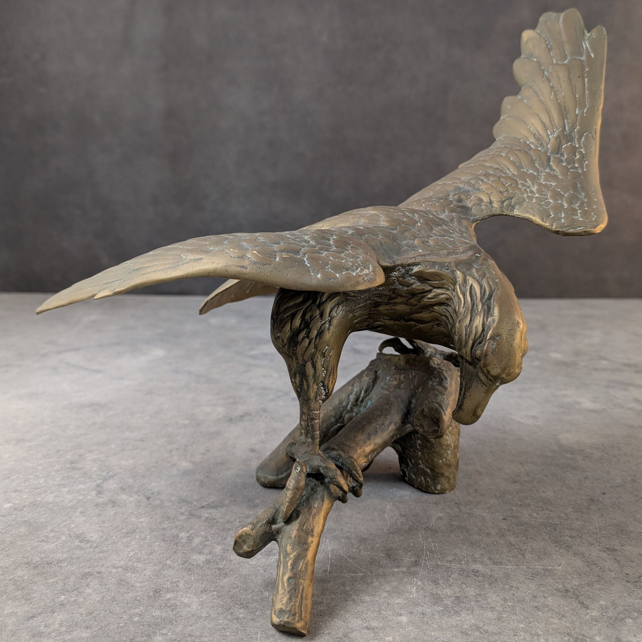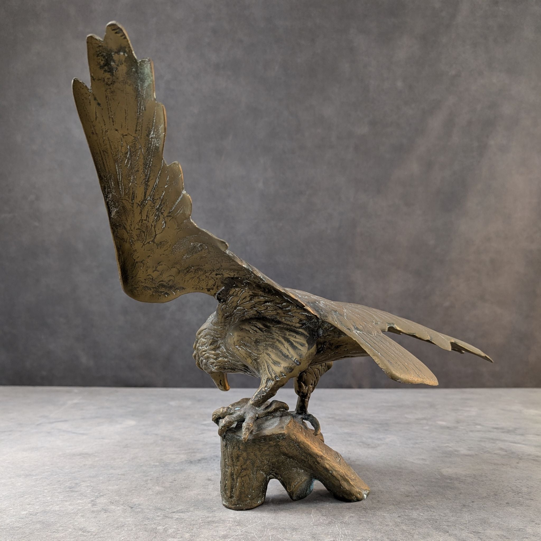 Cast in the mid twentieth century, the sculpture carries a rich, time worn surface with the natural green oxidisation that settles only on authentic bronze. Feather work and branch detail are cut with precision, each line shaped to heighten the sense of tension through the body. The broad span and grounded posture echo the period’s preference for expressive realism in metalwork.