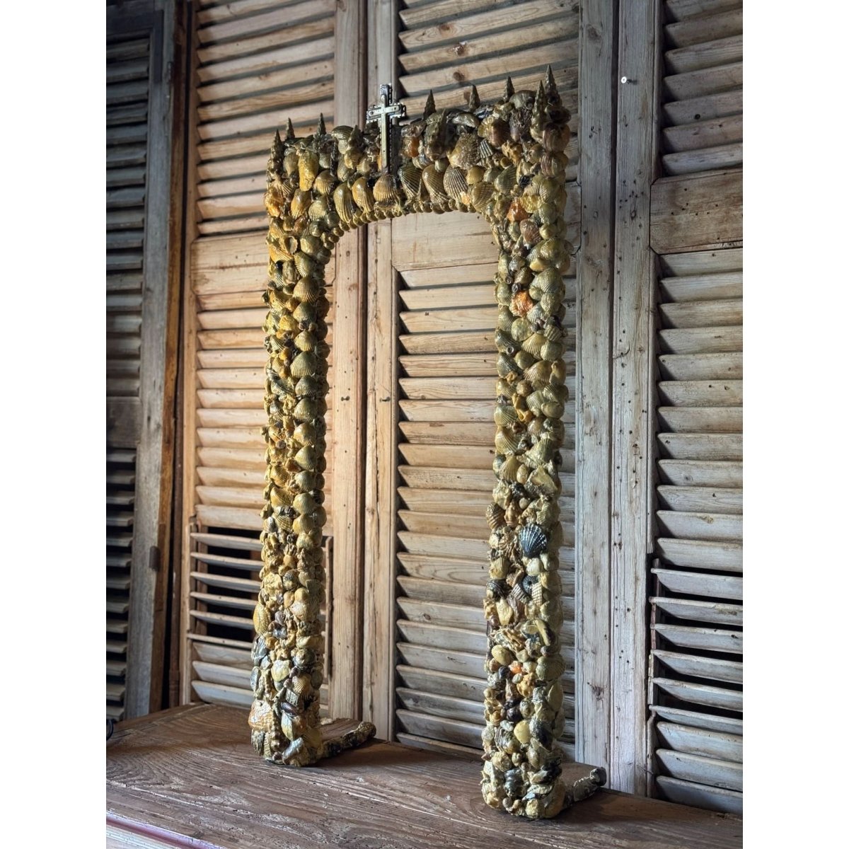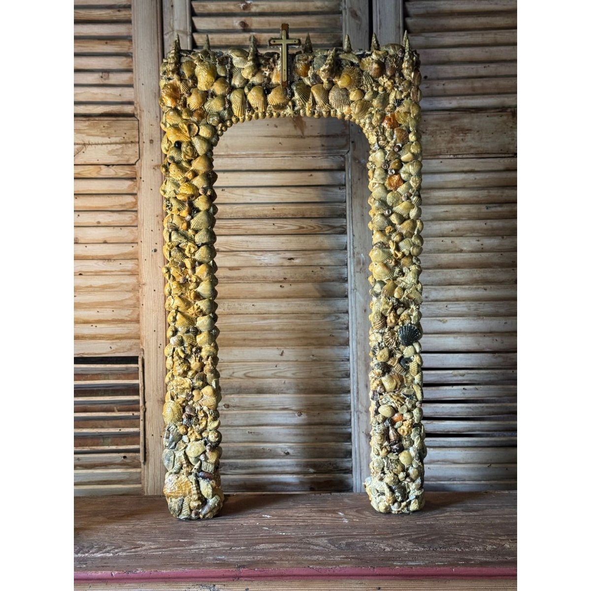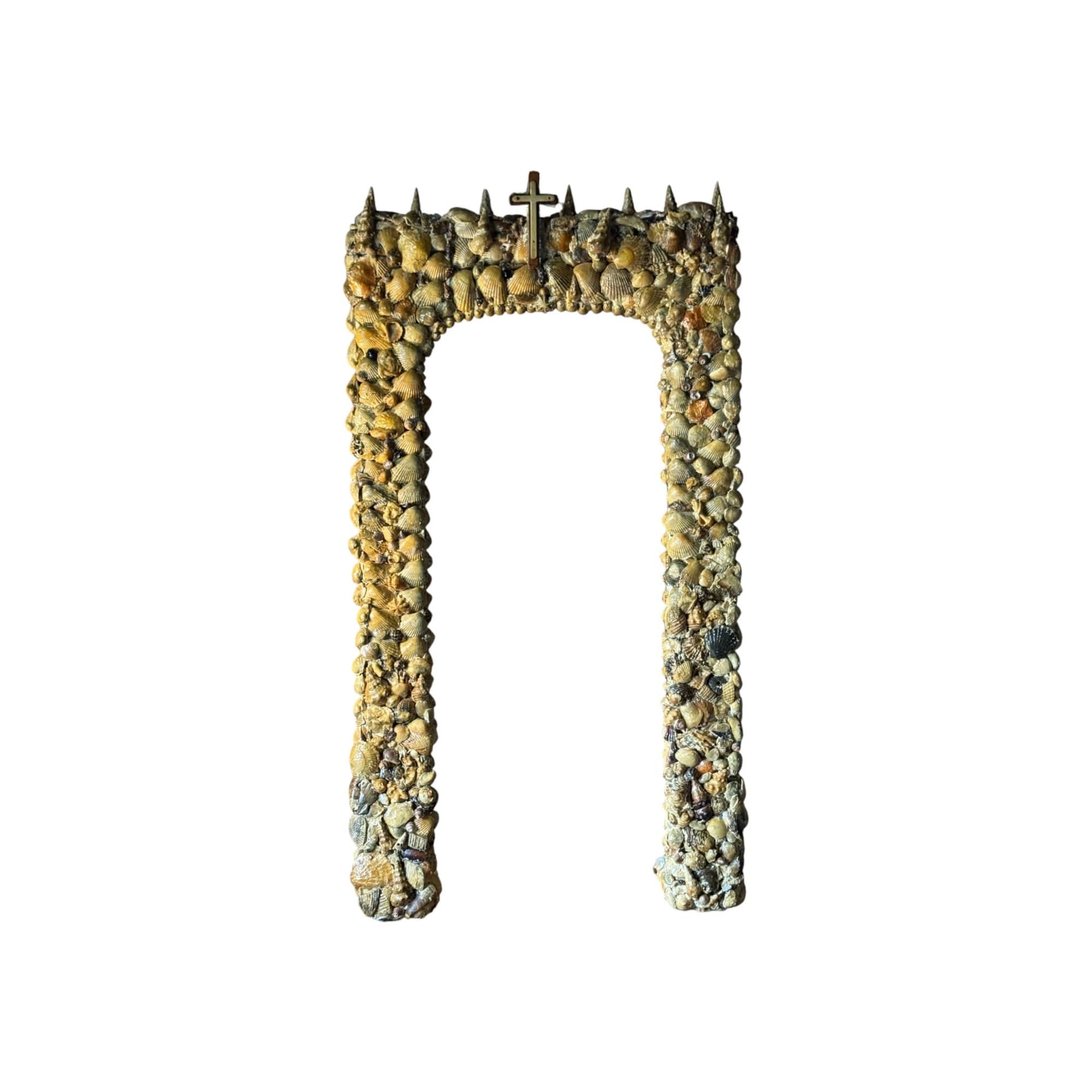 Beautiful large vintage handcrafted freestanding alter frame with shell encrusted details and religious cross emblem surmount. Perfect as the backdrop for a religious statue / santos doll. Some losses as expected with age.