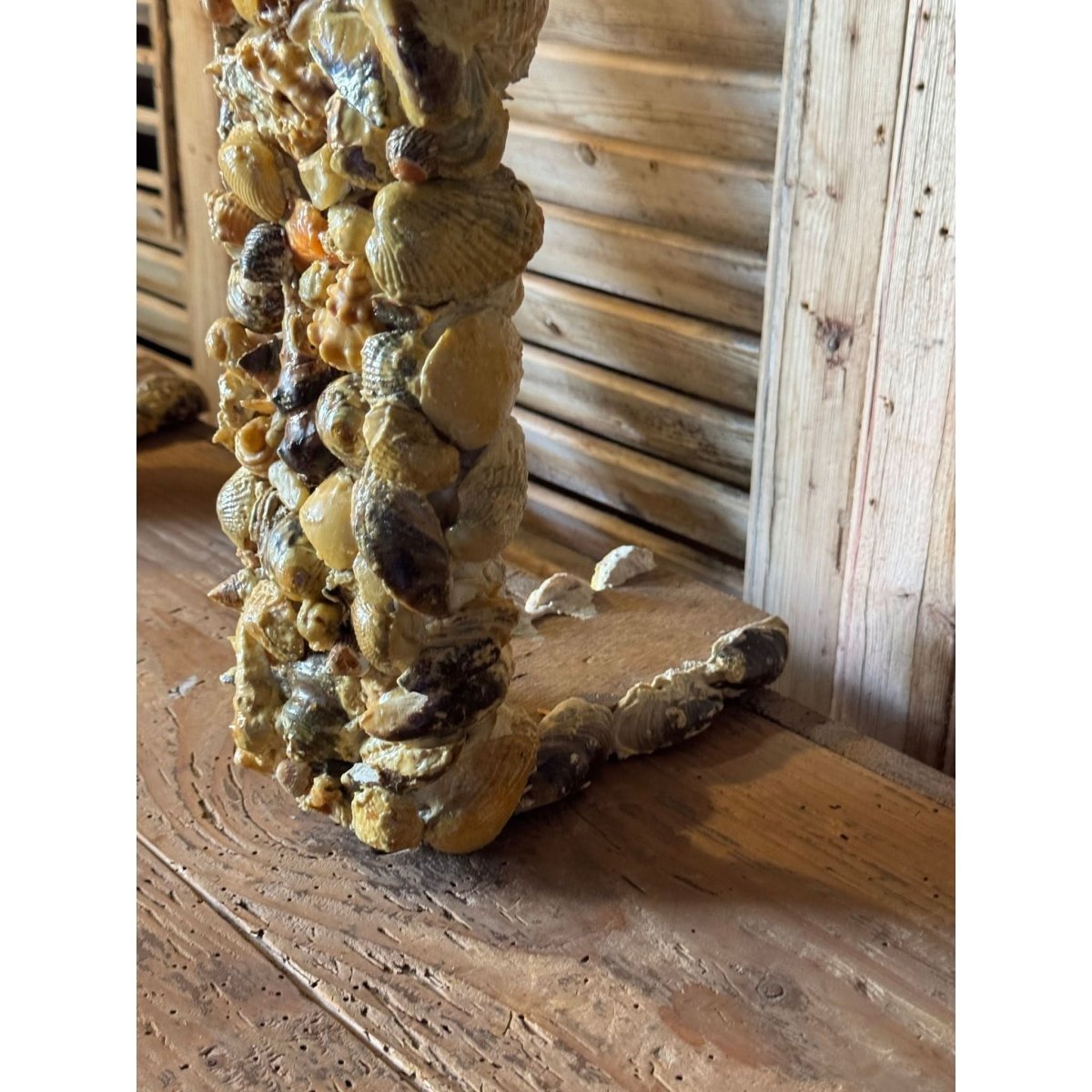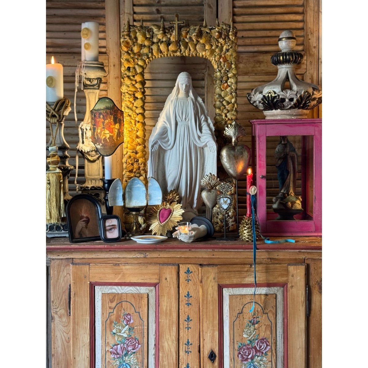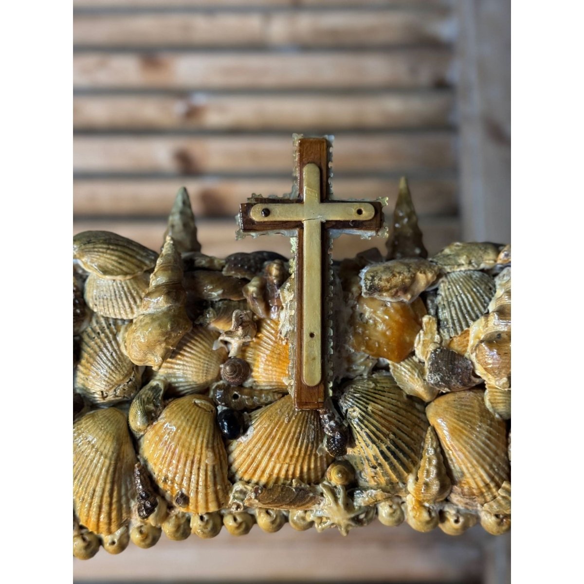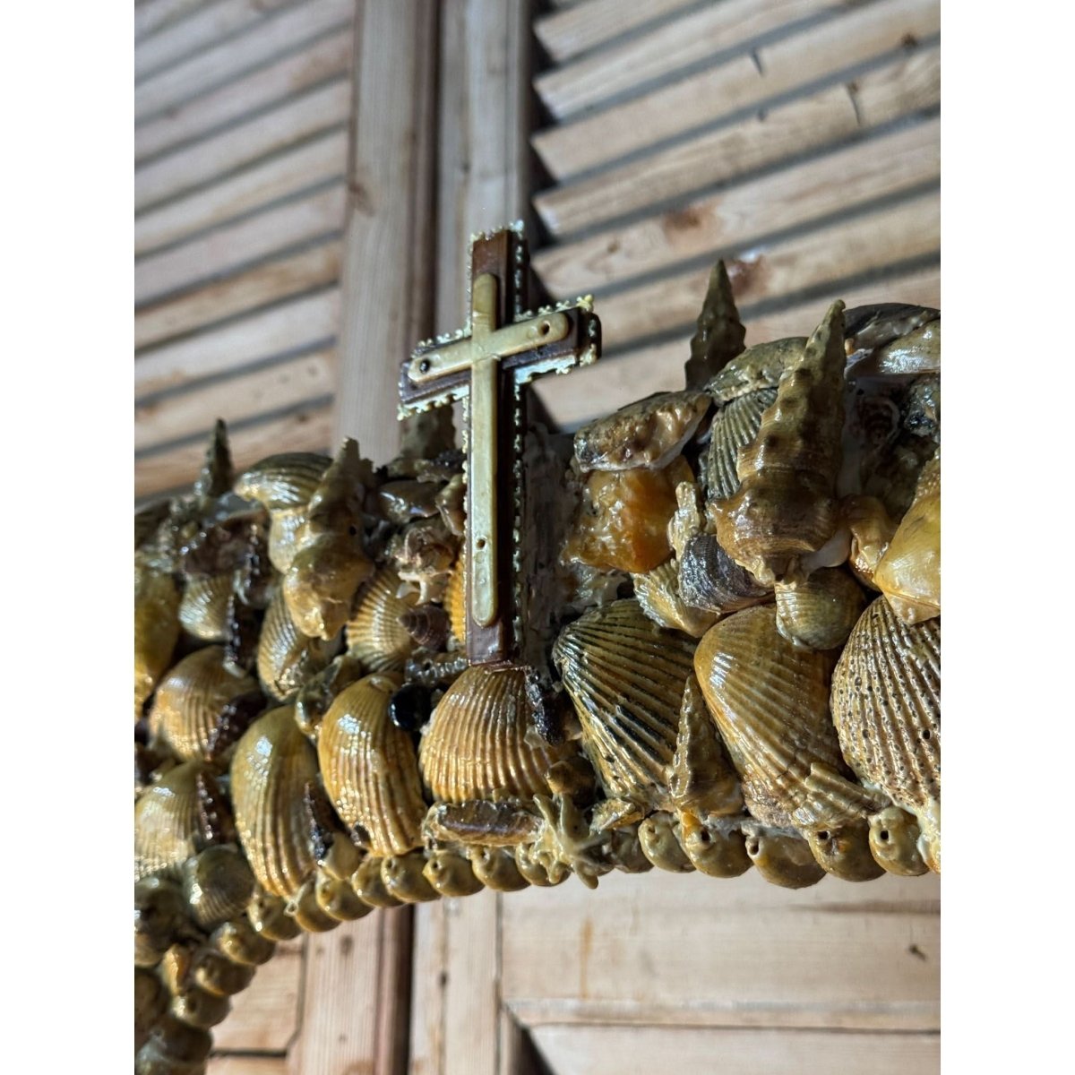 Beautiful large vintage handcrafted freestanding alter frame with shell encrusted details and religious cross emblem surmount. Perfect as the backdrop for a religious statue / santos doll. Some losses as expected with age.