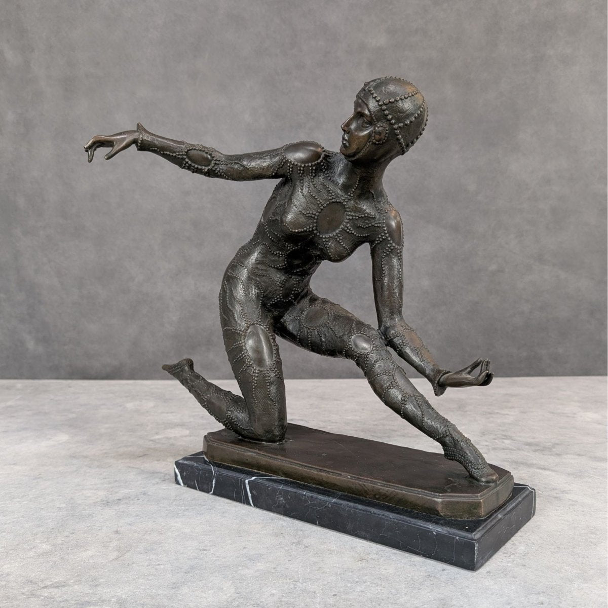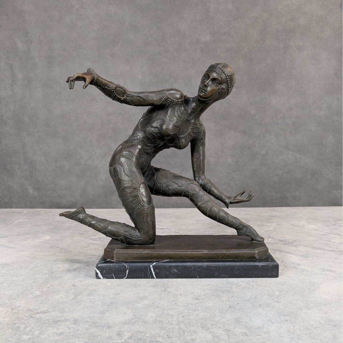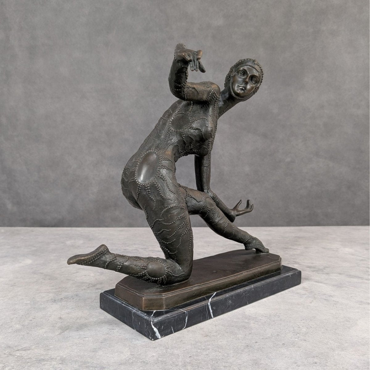 Cast in solid bronze, her surface carries those fine, era true textures collectors look for, the layered costume work, the precision of each patterned contour, the unmistakable Chiparus signature rendered discreetly at the base. It’s a piece that doesn’t need noise. It just holds its ground and fills a room.