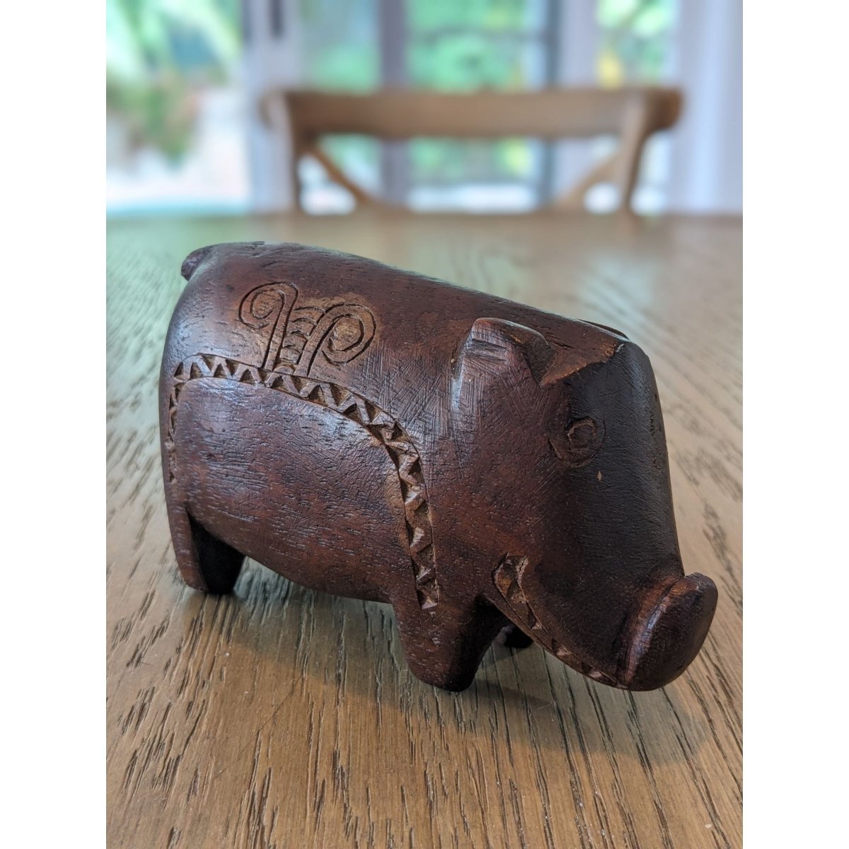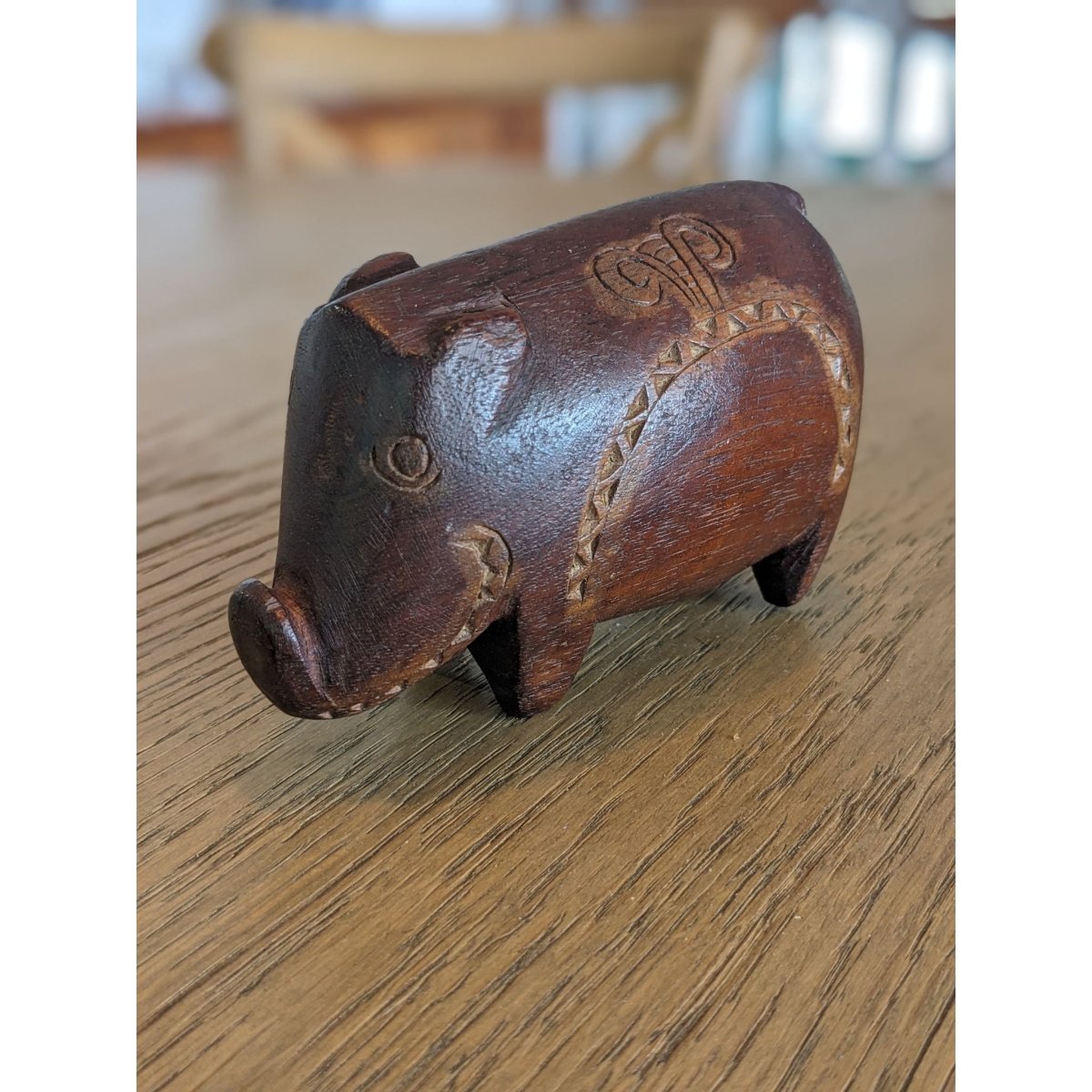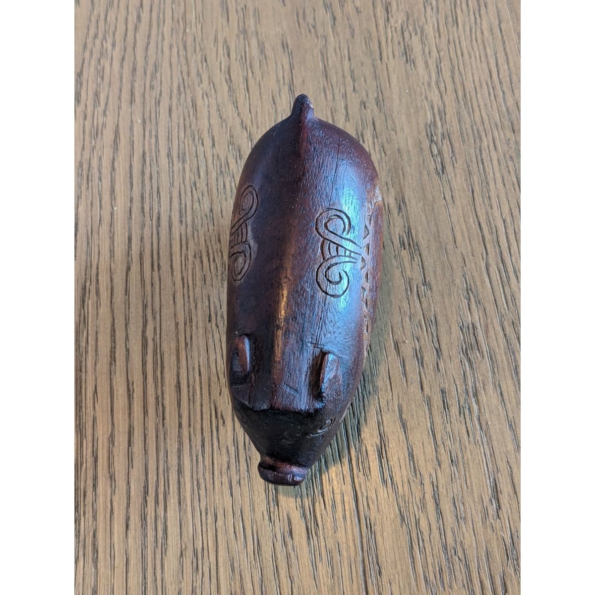 Charming carved hardwood pig figure from the Massim region featuring traditional incised crescent decoration with lime infill. Rich chocolate-brown patina indicates genuine age and use