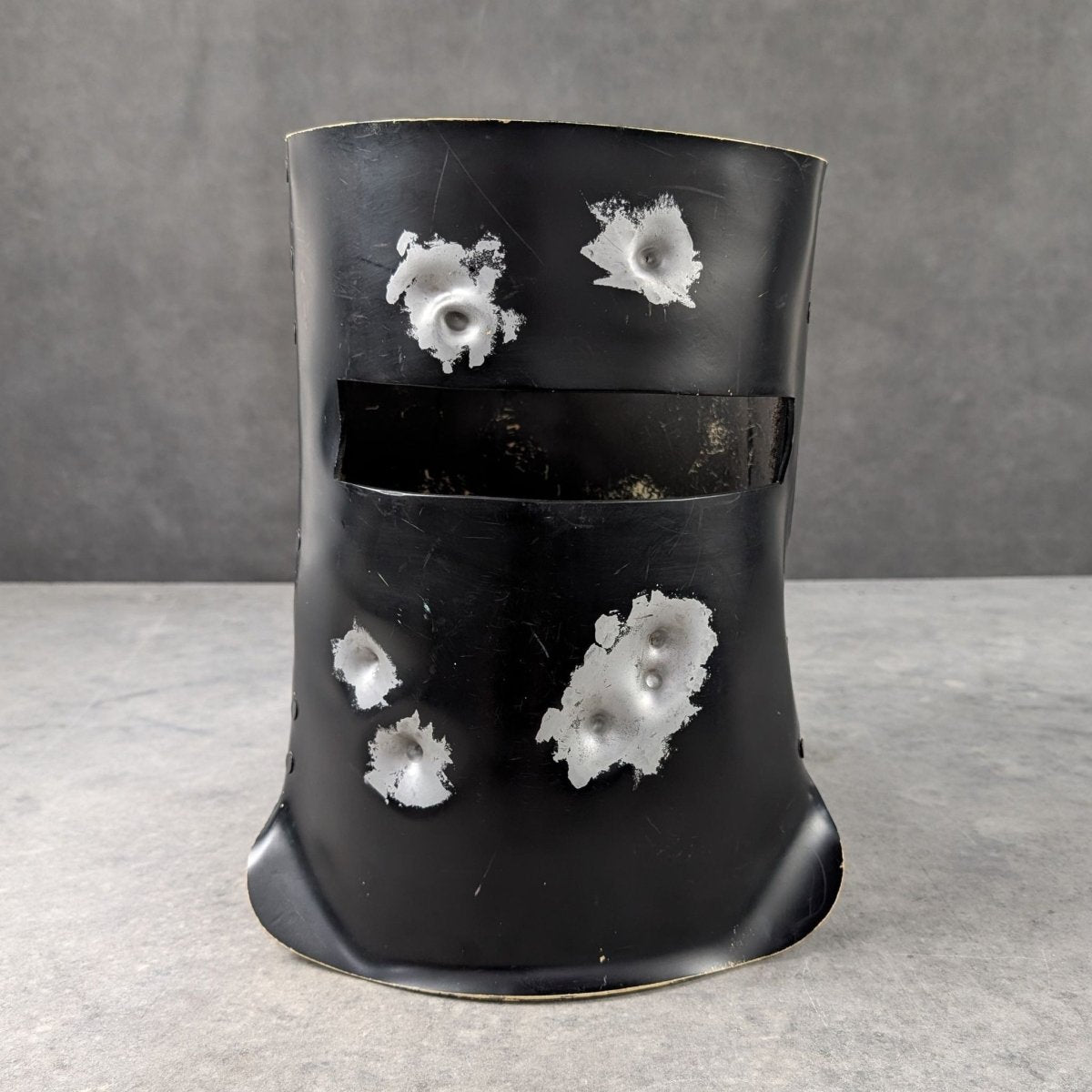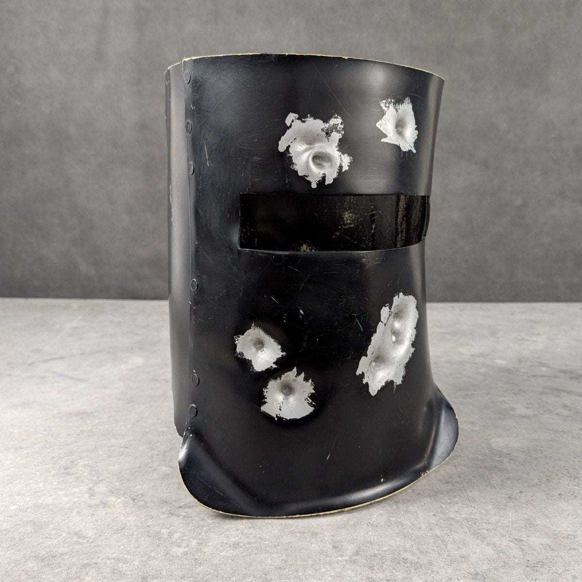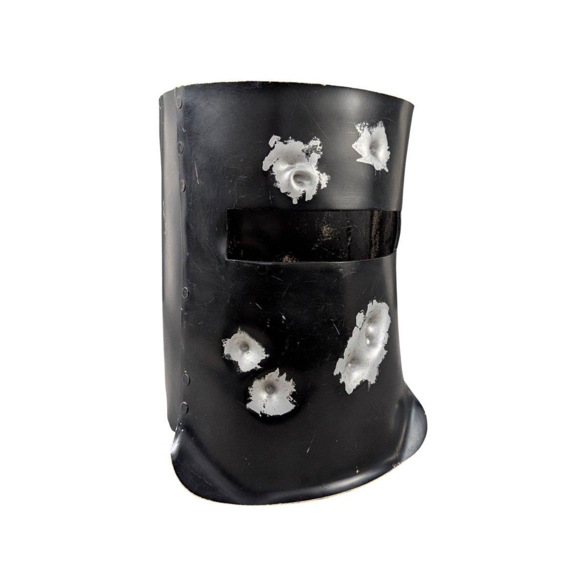 A relic of Australian stagecraft, this Ned Kelly helmet was produced by Nigel Shaw Costumes, the long running Sydney workshop known for supplying theatre, film and television. Its surface carries deliberate distressing from production use, including impact textures and aged black finish that reflect its working life as a prop rather than a replica. The interior tag confirms manufacture by Nigel Shaw Costumes. A rare opportunity to acquire an authentic screen and theatre piece connected to one of Australia’s most recognisable historical figures. Strong presence. Collectable. Display ready.