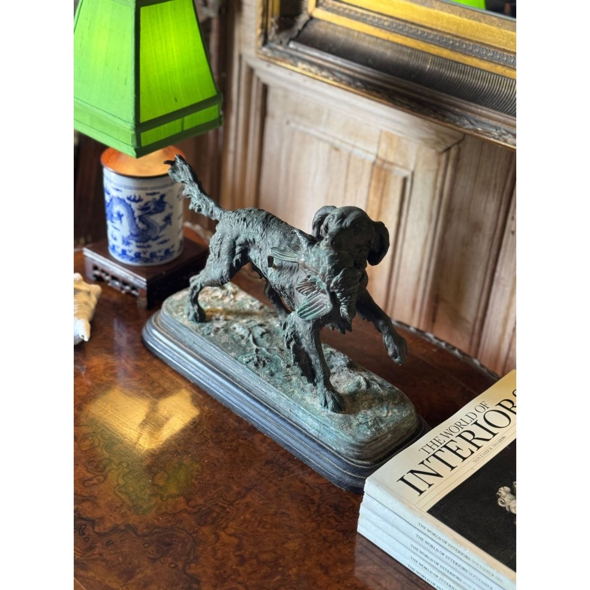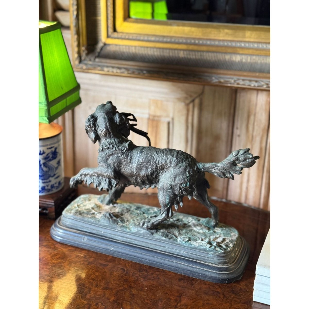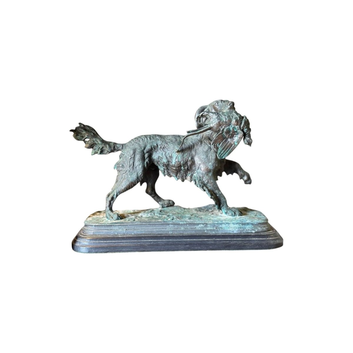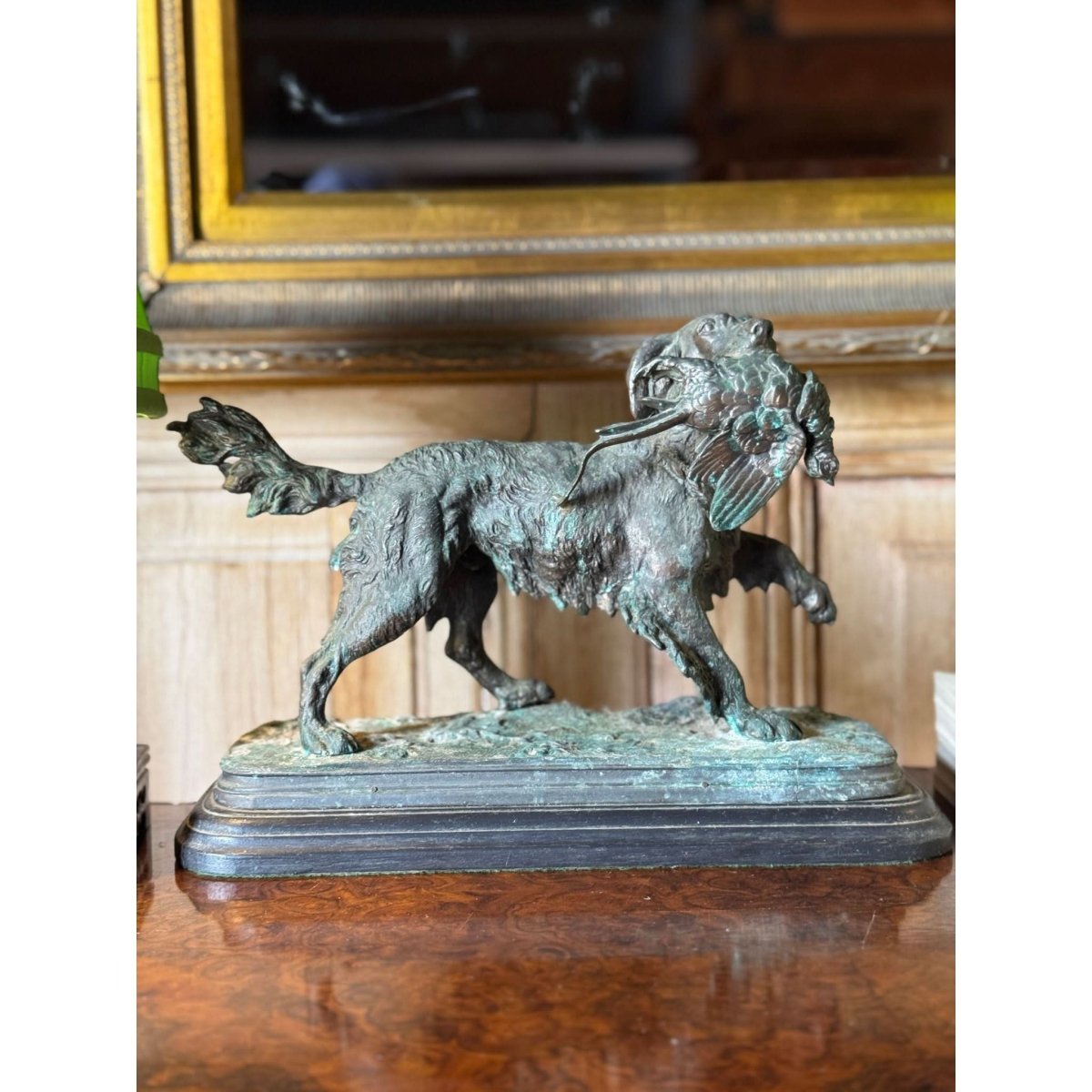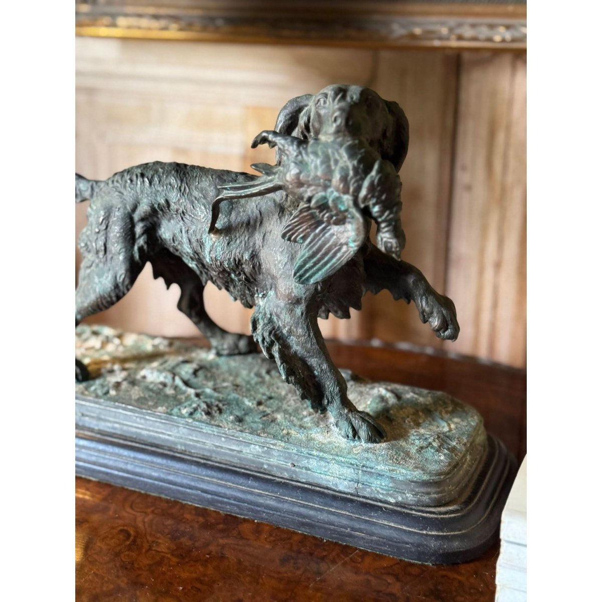 Vintage bronze sculpture of a hunting dog with pheasant in Prosper Lecourtier style on timber base.