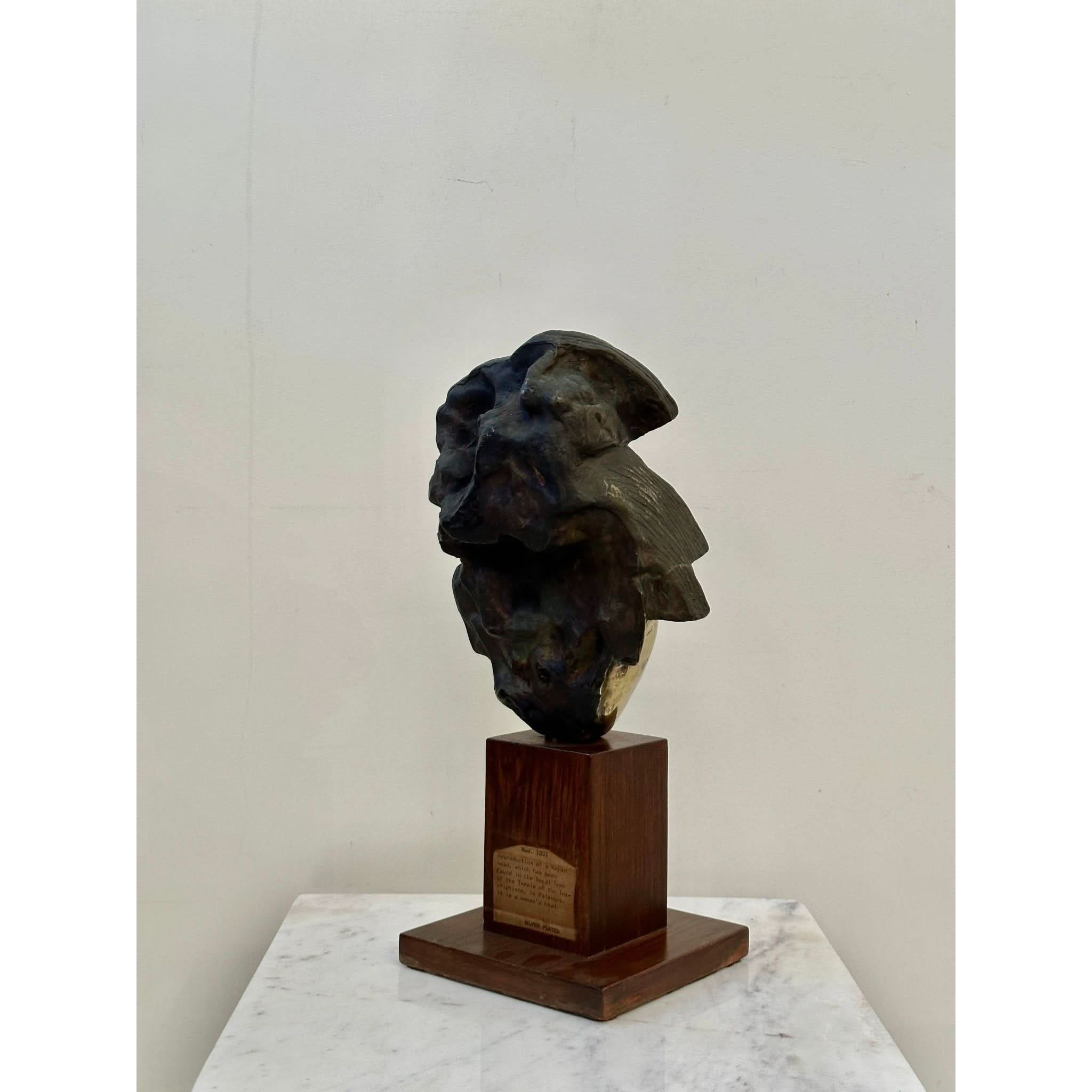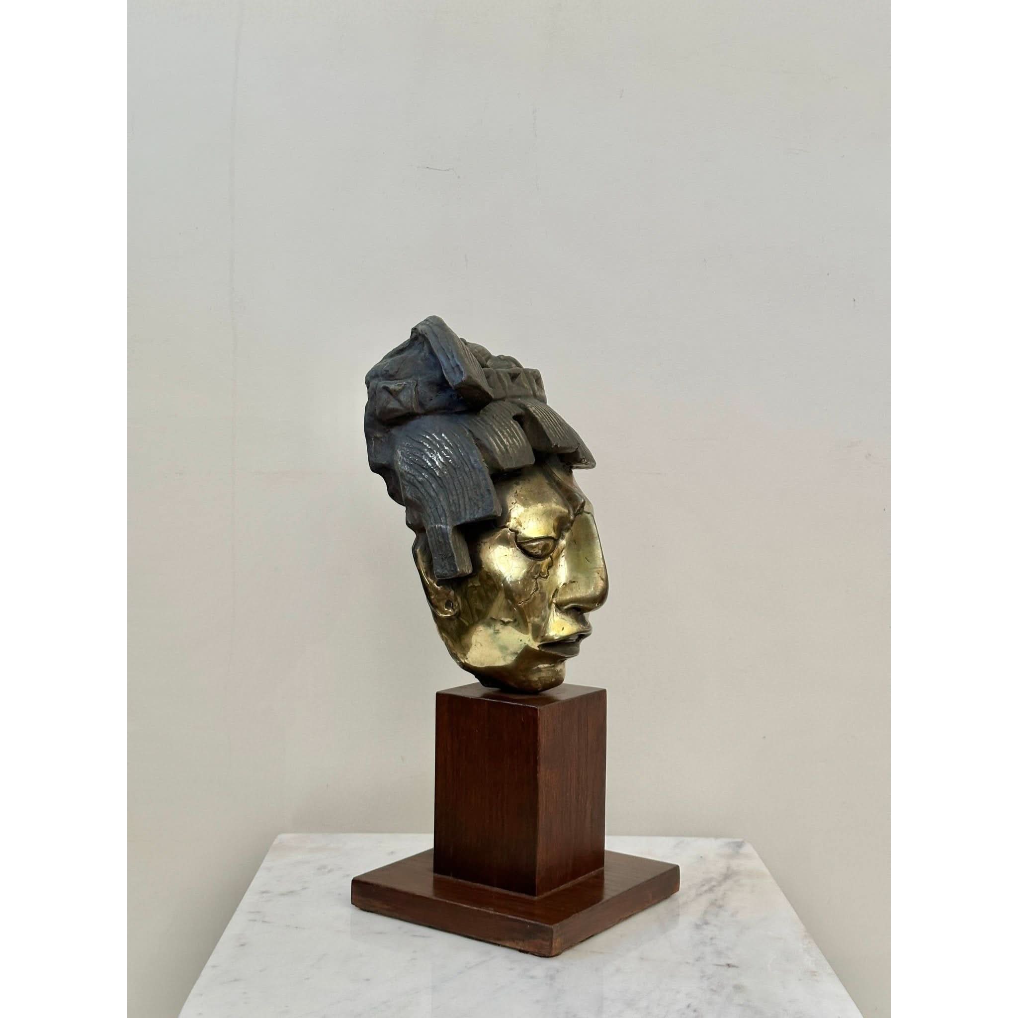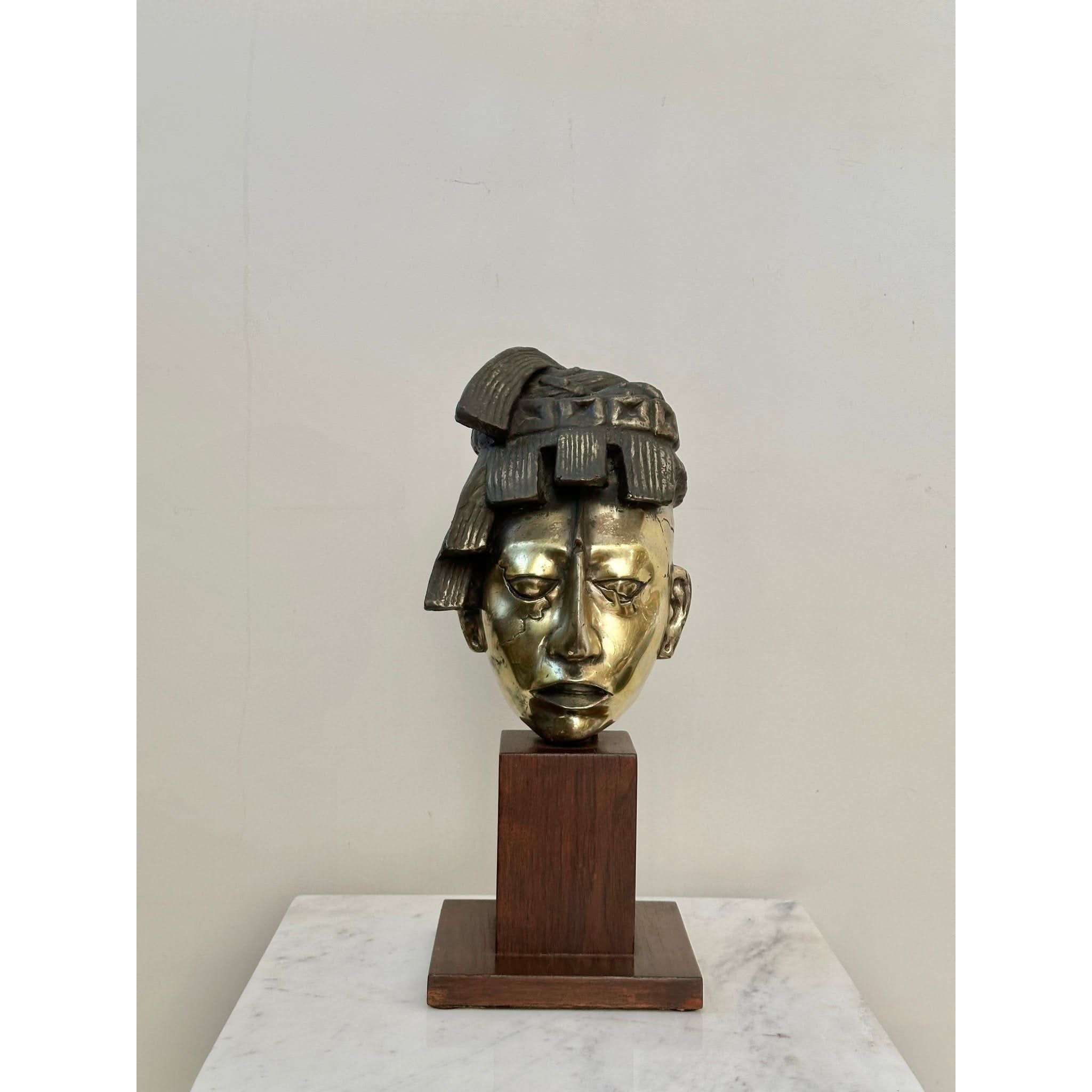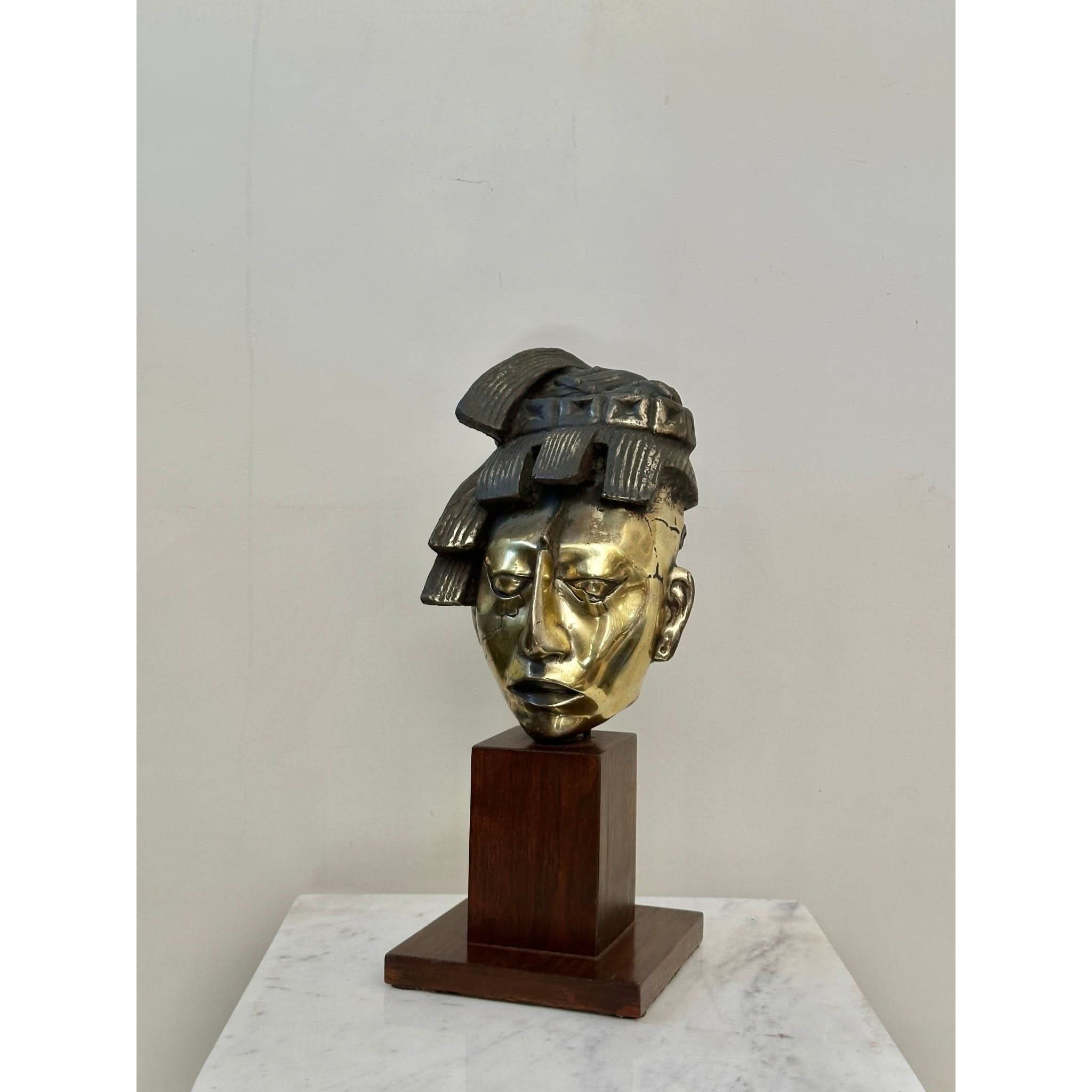 Mounted on a stepped wooden mid-century modern pedestal, this piece is a bold fusion of ancient inspiration and mid-century artistry, crafted by Nicromex in Mexico during the late 1950s to Early 1960s. The design echoes the grandeur of Mayan civilization while embodying the sleek, expressive style of modernist sculpture.