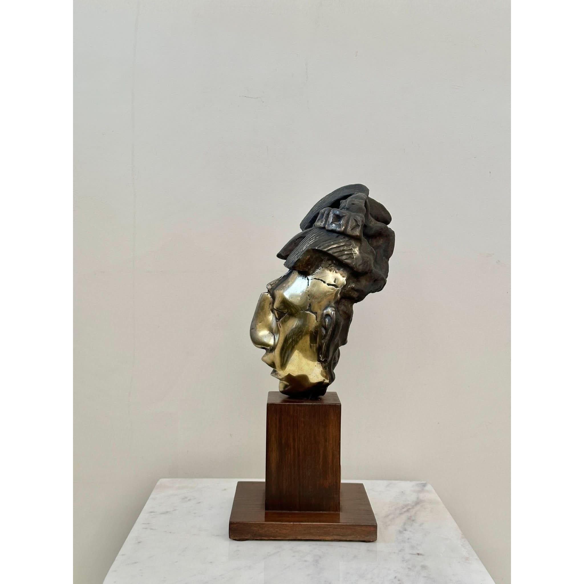 A striking bronze sculpture inspired by the legendary Mayan ruler K’inich Janab Pakal or Pakal The Great. Produced after the discovery of the iconic head found in the Temple of the Inscriptions at Palenque, Mexico in 1952 by Mexican archaeologist Alberto Ruz Lhuillier. The silver-gilt face contrasts beautifully with the verdigris-toned hair, creating a dynamic and aged patina that enhances its presence.