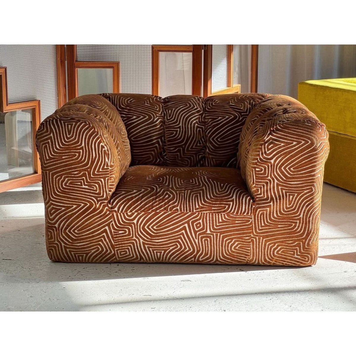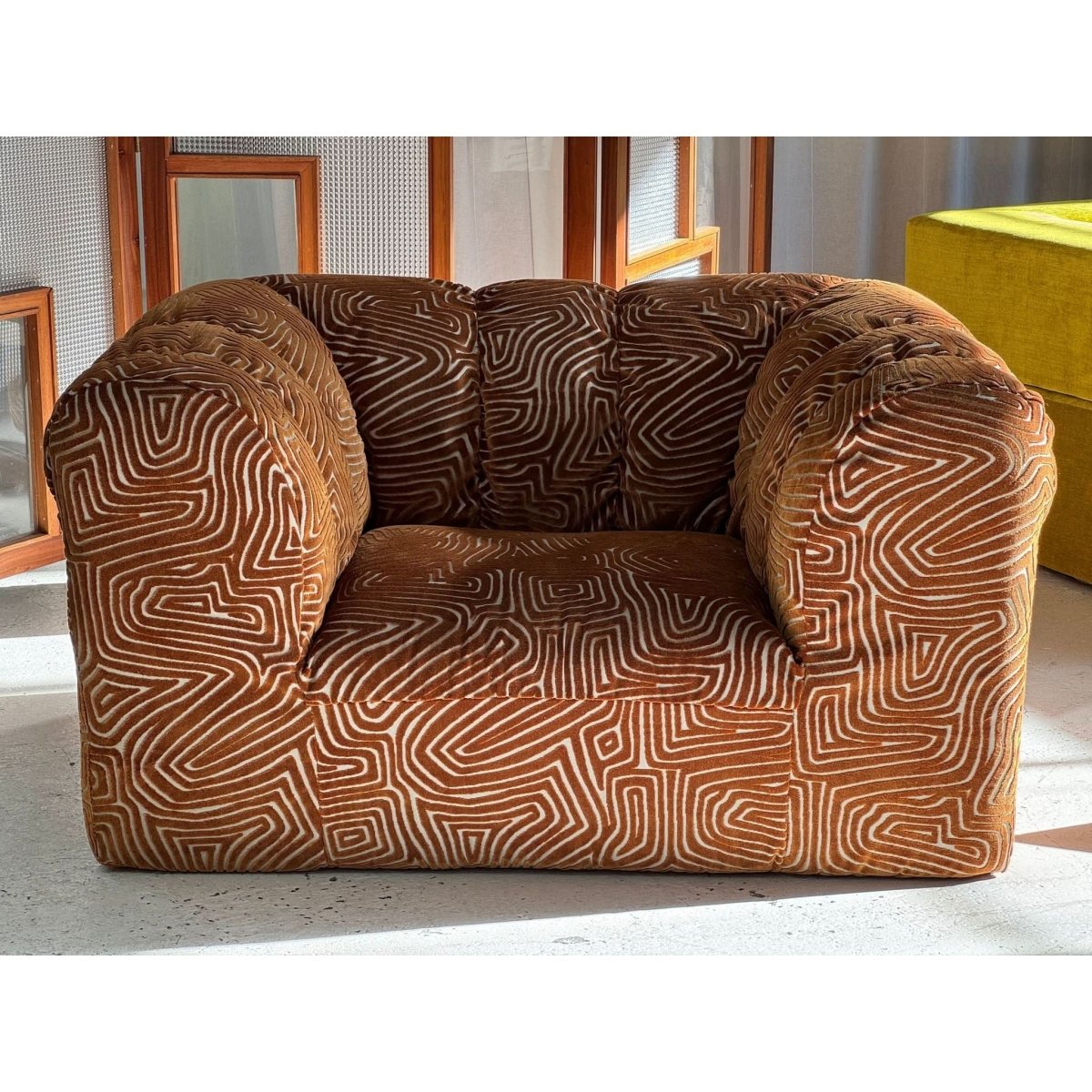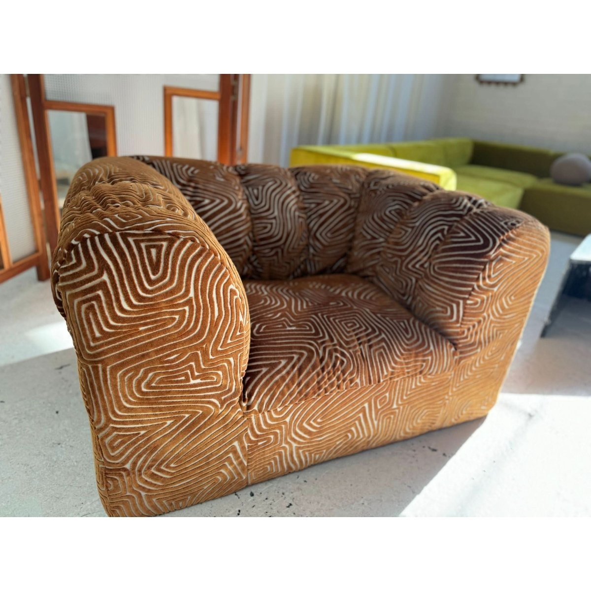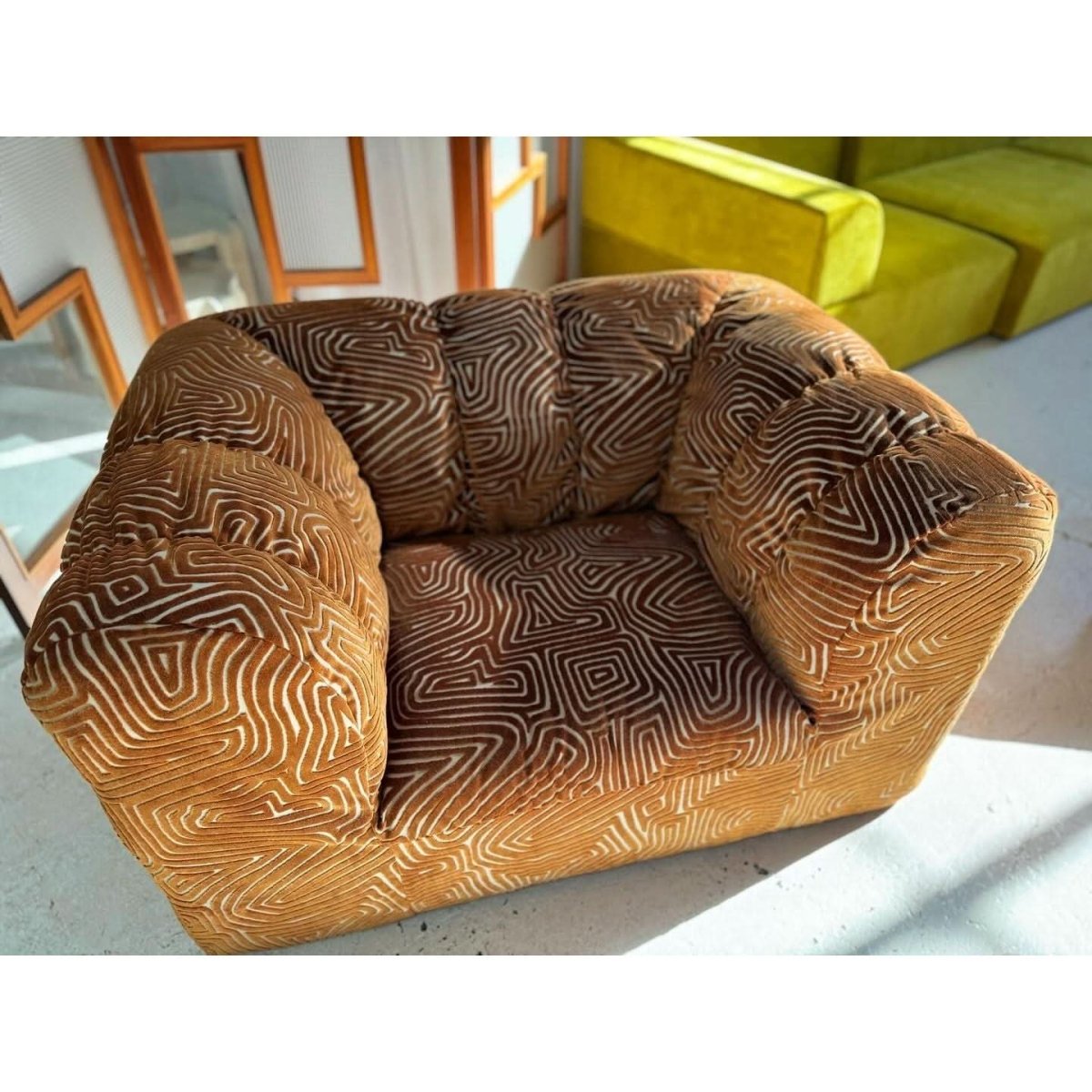 Stunning vintage patterned armchair, freshly restored and reupholstered.