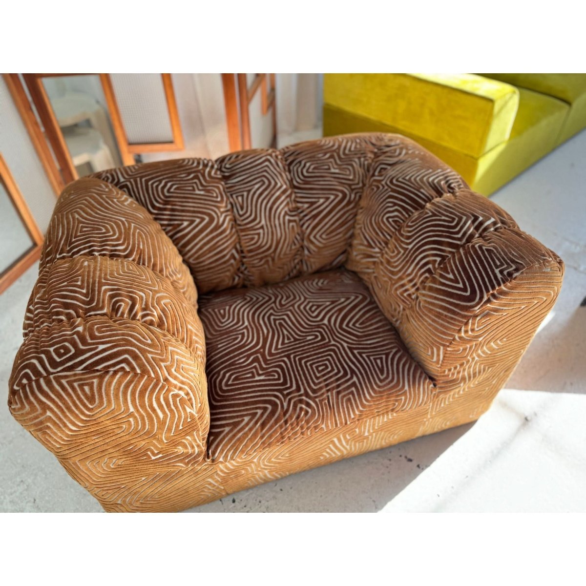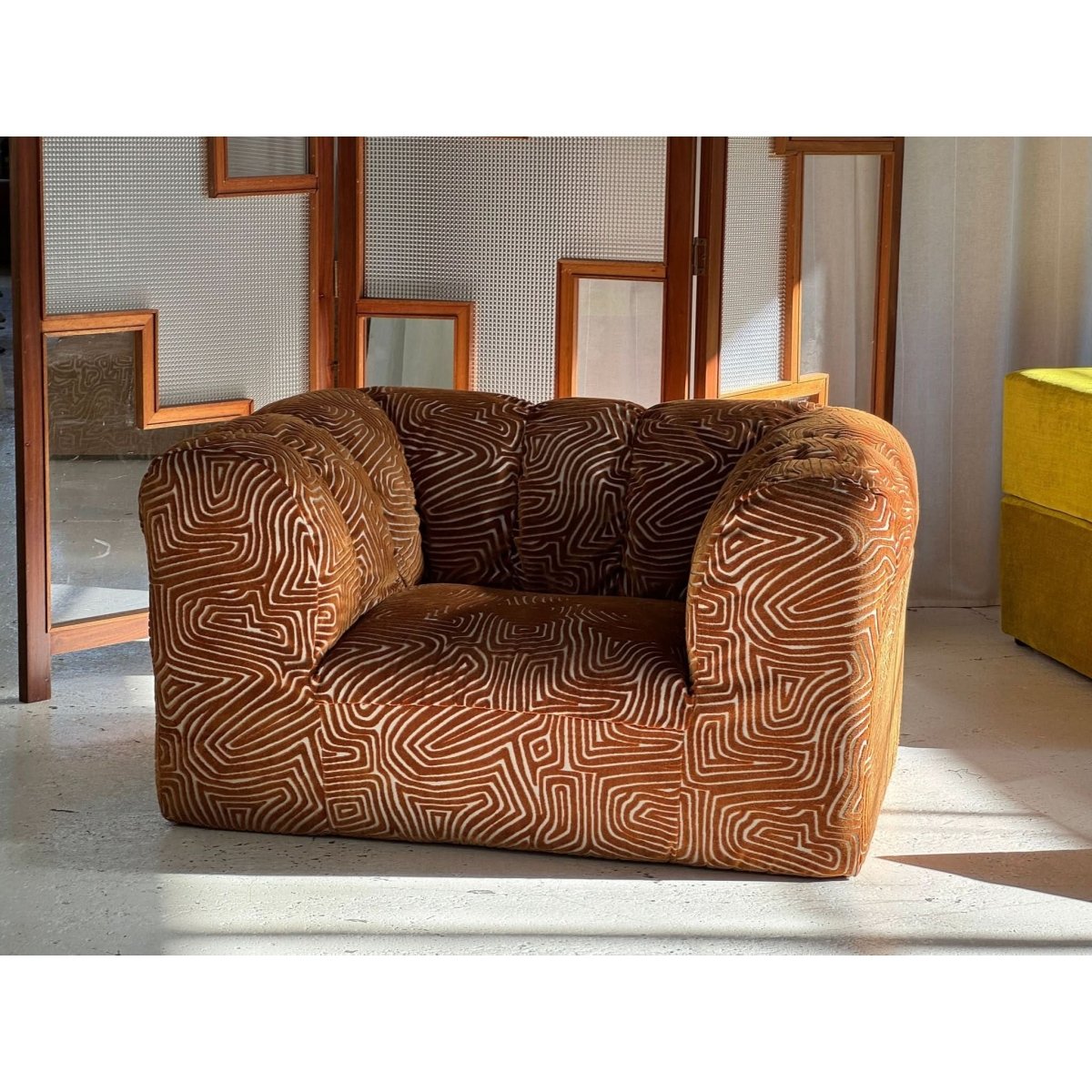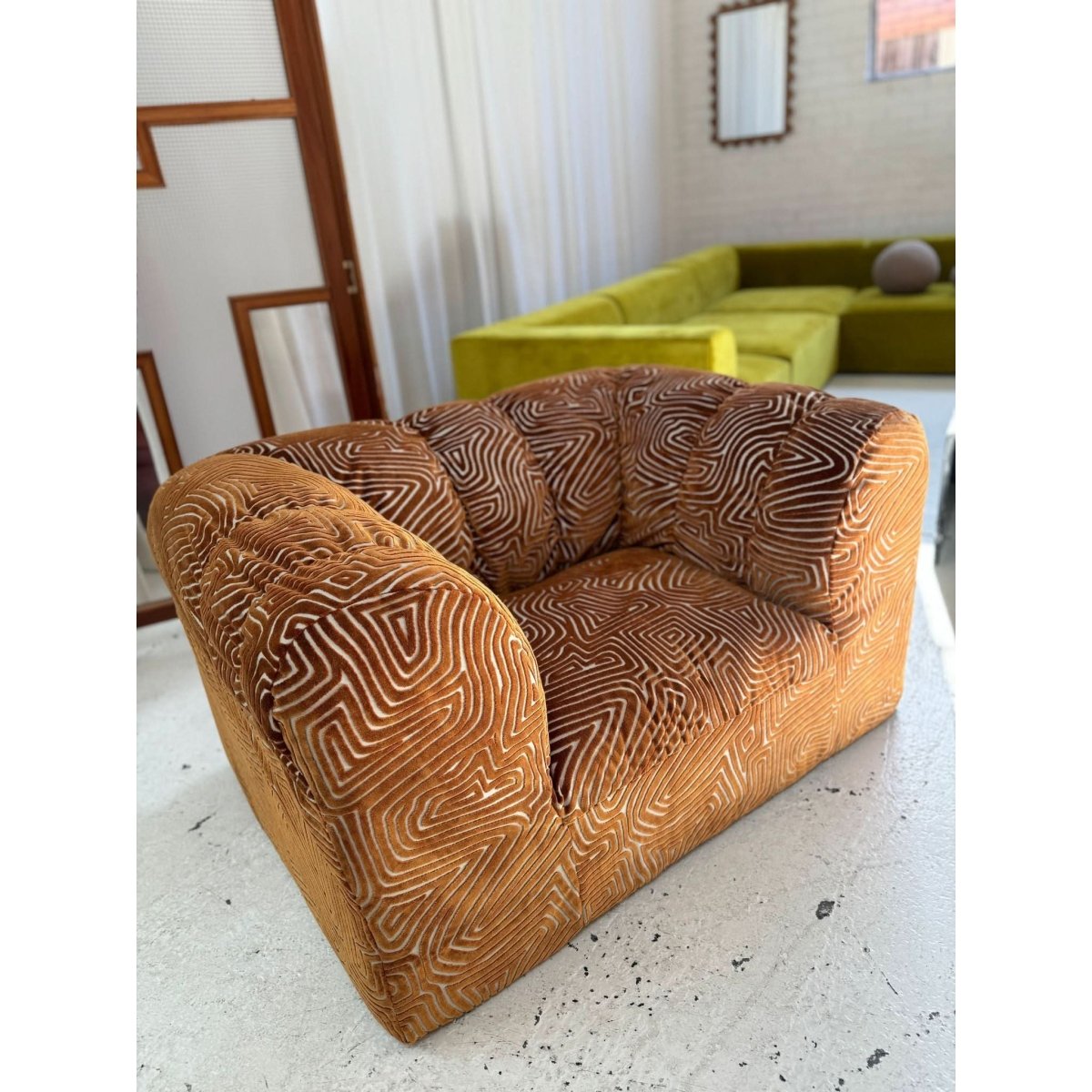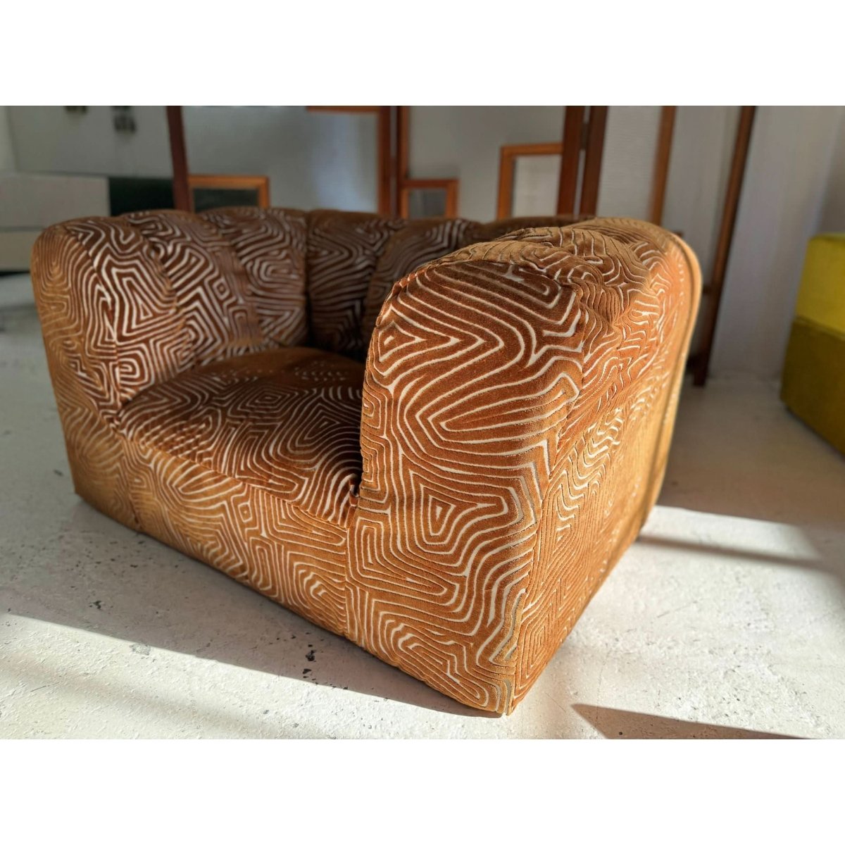 Stunning vintage patterned armchair, freshly restored and reupholstered.