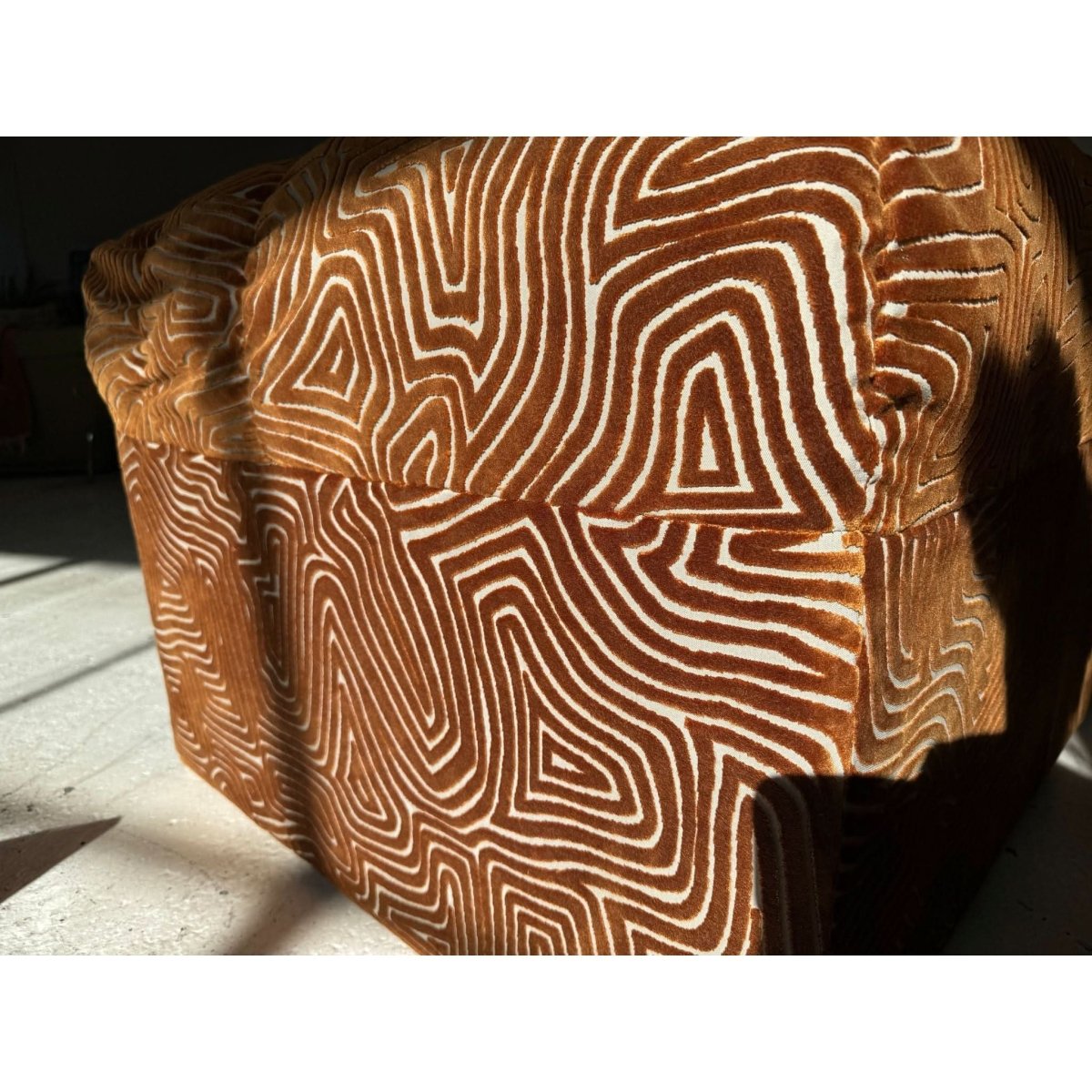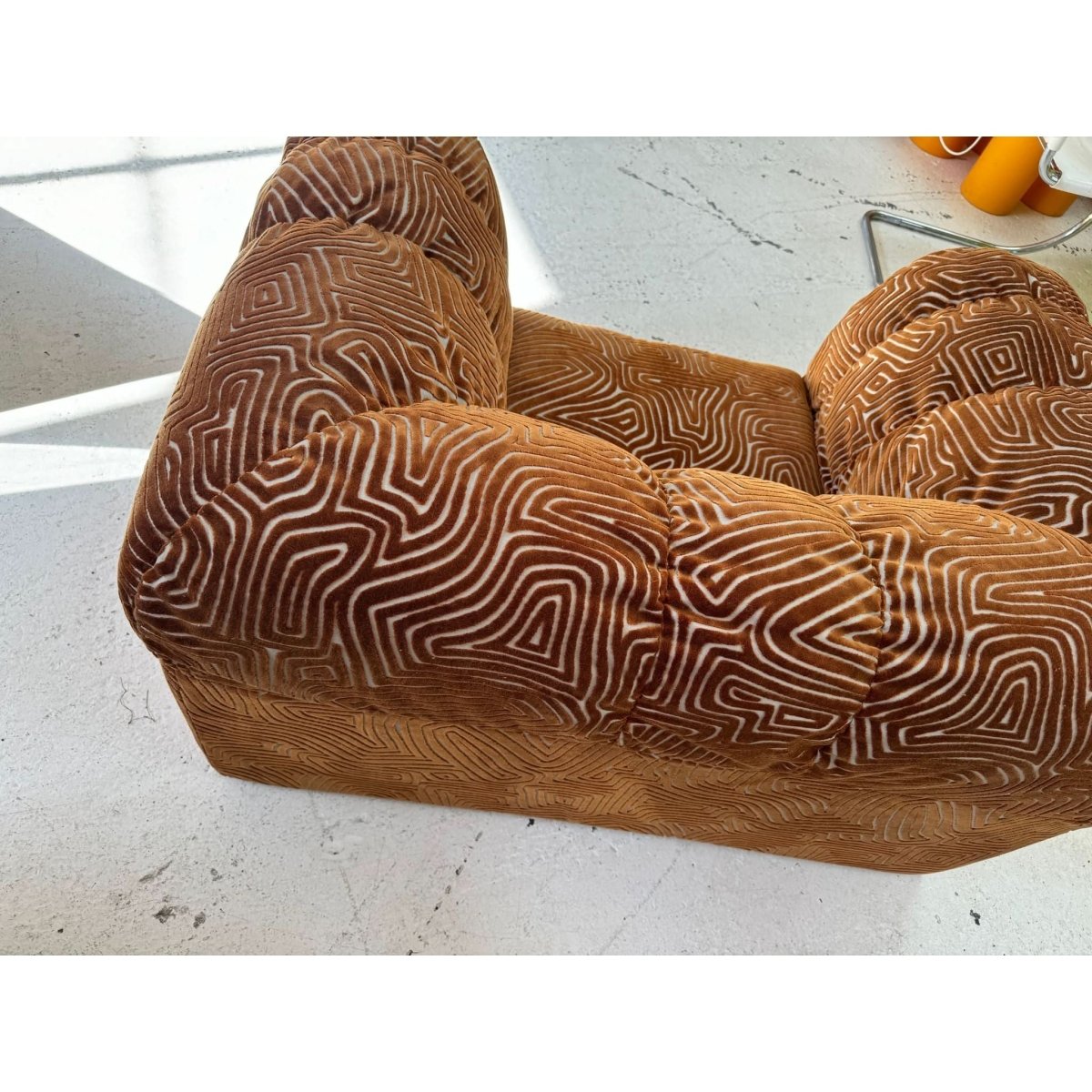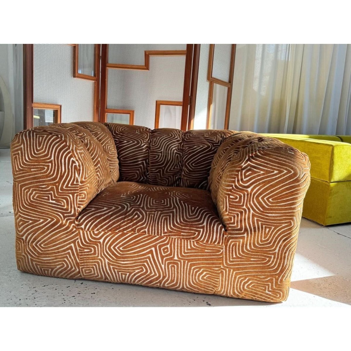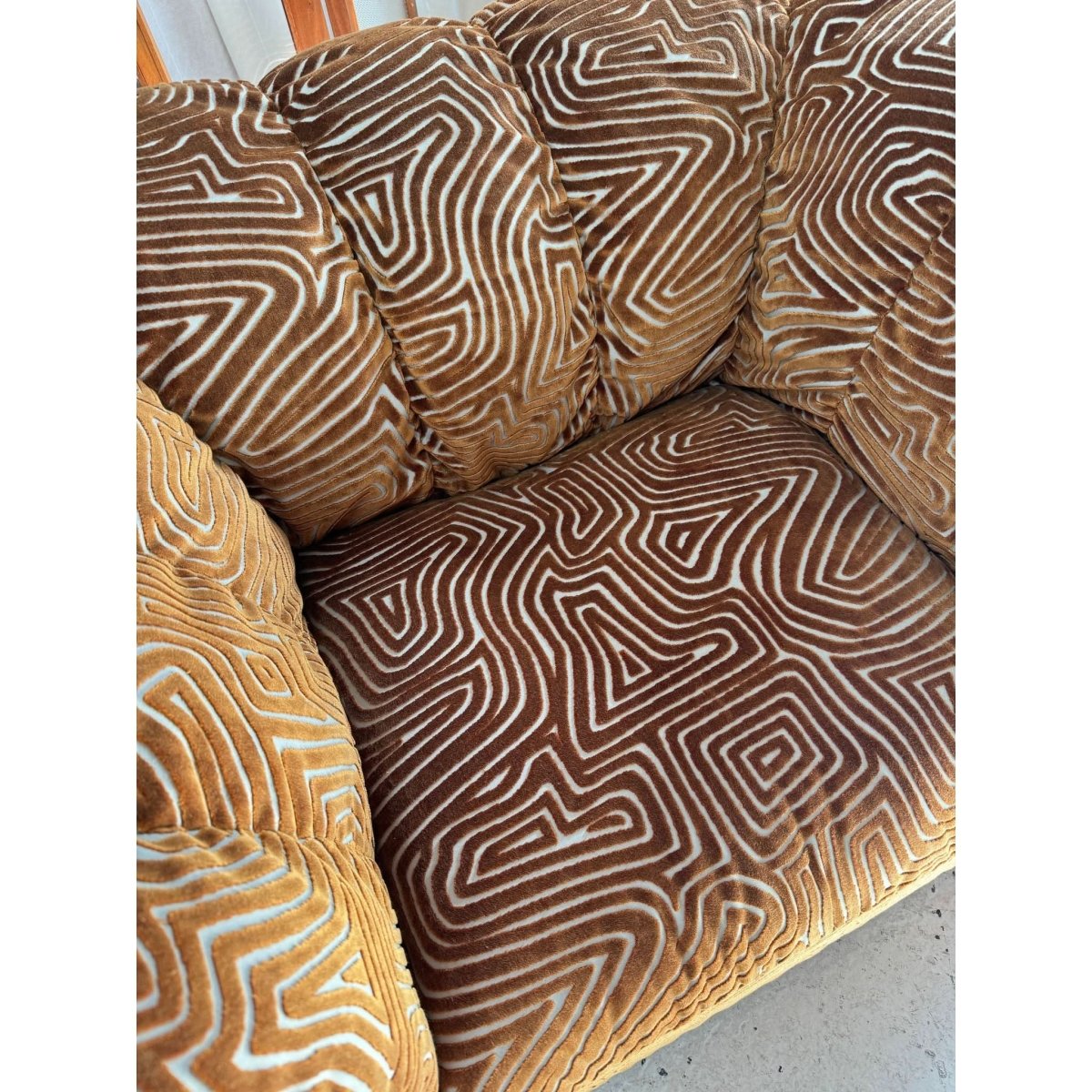 Stunning vintage patterned armchair, freshly restored and reupholstered.