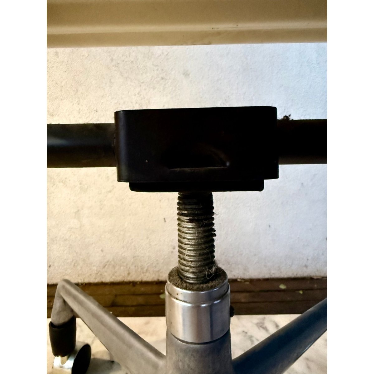 It is structurally sound and functions without issue, with all components present including manual lift mechanism, five point swivel base, and after-market removable casters.