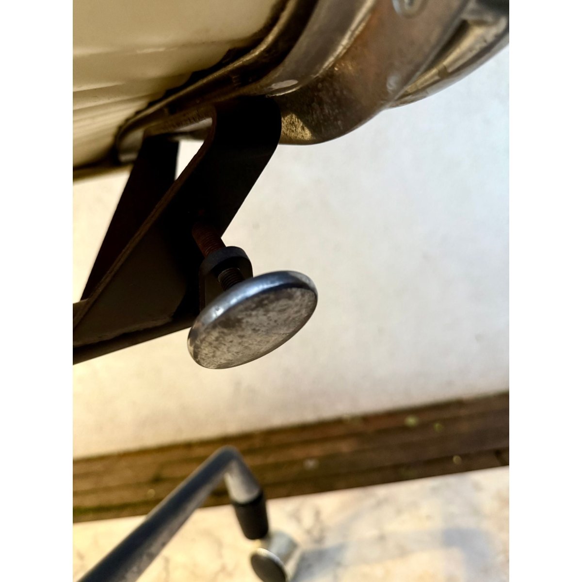 This piece presents in fair physical condition, with ample patina and signs of age. Thankfully, the austere design lends itself to a more rugged industrial feel.
