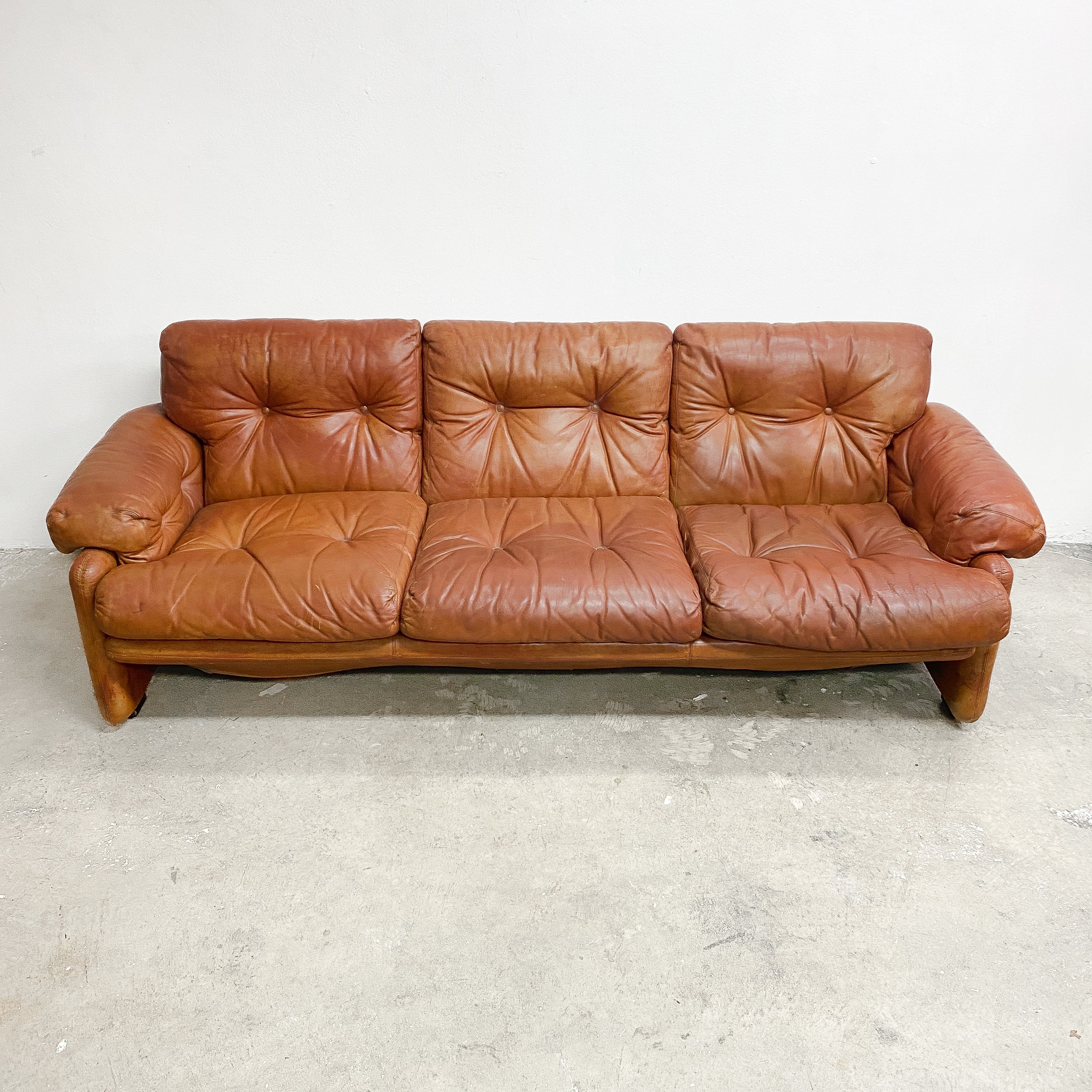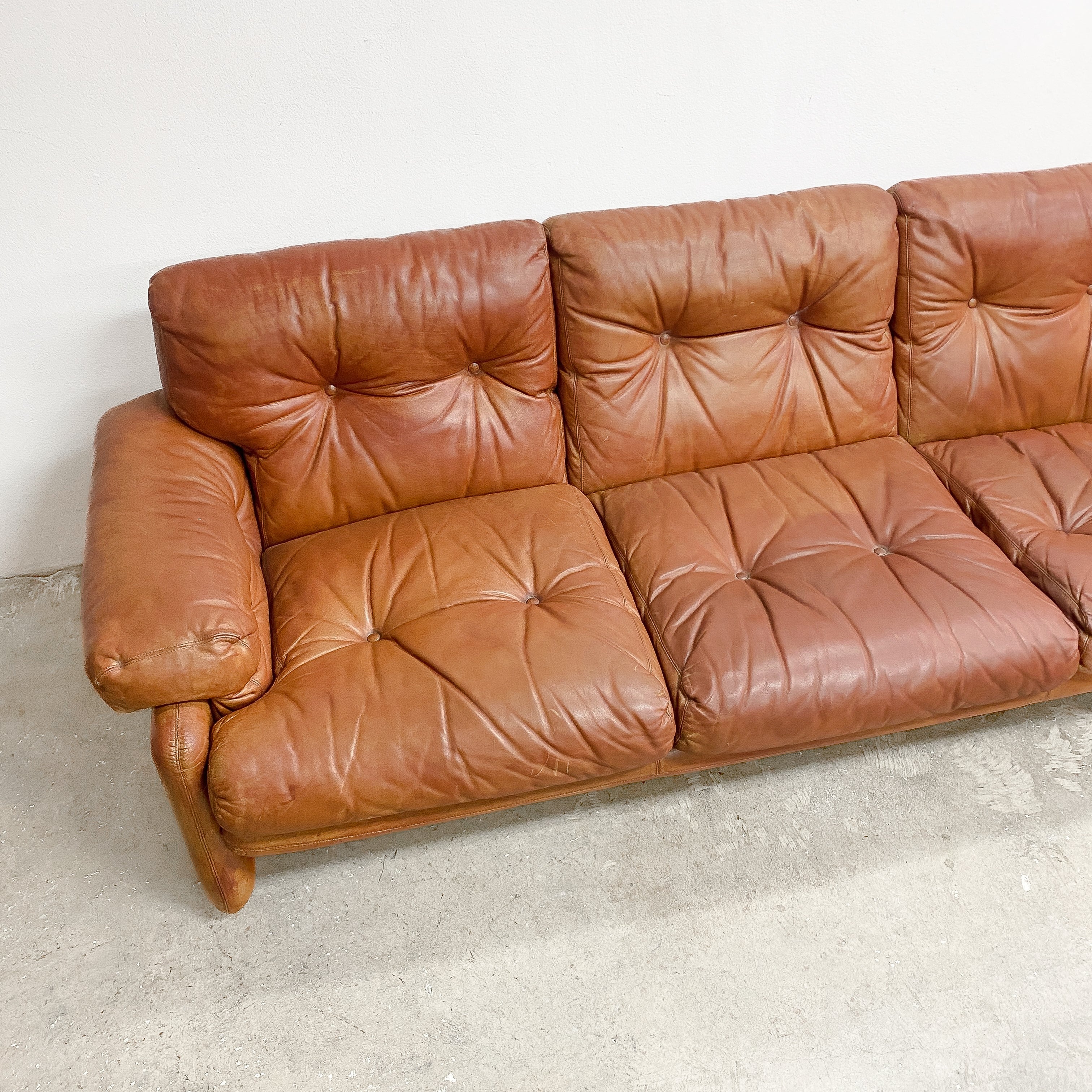 Stunning 1960s mid century Coronado 3 seater sofa designed by Afra and Tobia Scarpa and produced by C&B Italia. C&B Italia was an Italian furniture company founded in 1966 by Piero Busnelli and Cesare Cassina, a predecessor to the well-known modern furniture brand B&B Italia modern furniture brand. Busnelli took over the company's leadership after the 1973 split, rebranding it as B&B Italia, which continues to be a major player in contemporary Italian design.With its generous proportions and soft tan leather upholstery it is extremely comfortable and a wonderful example of Italian mid century design.