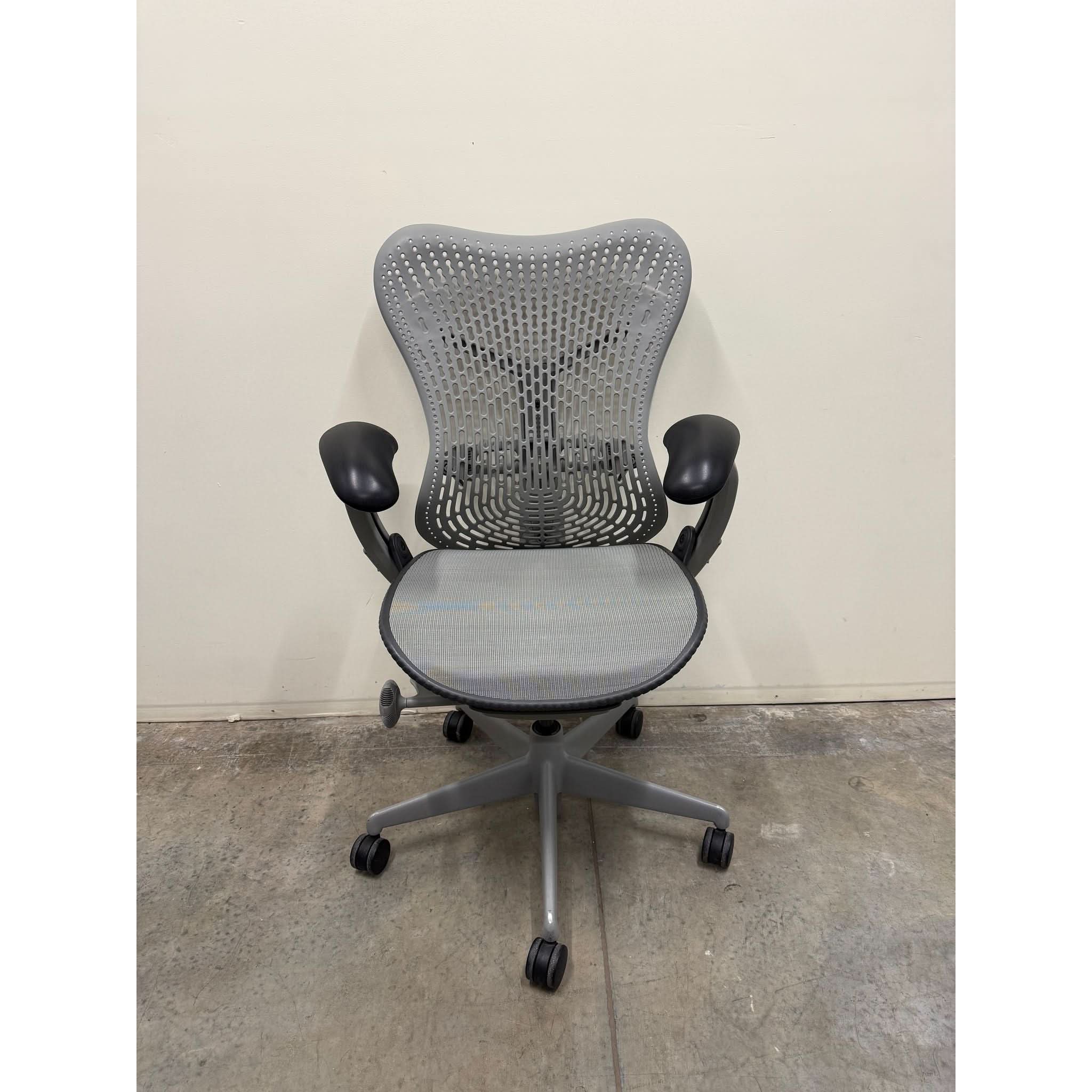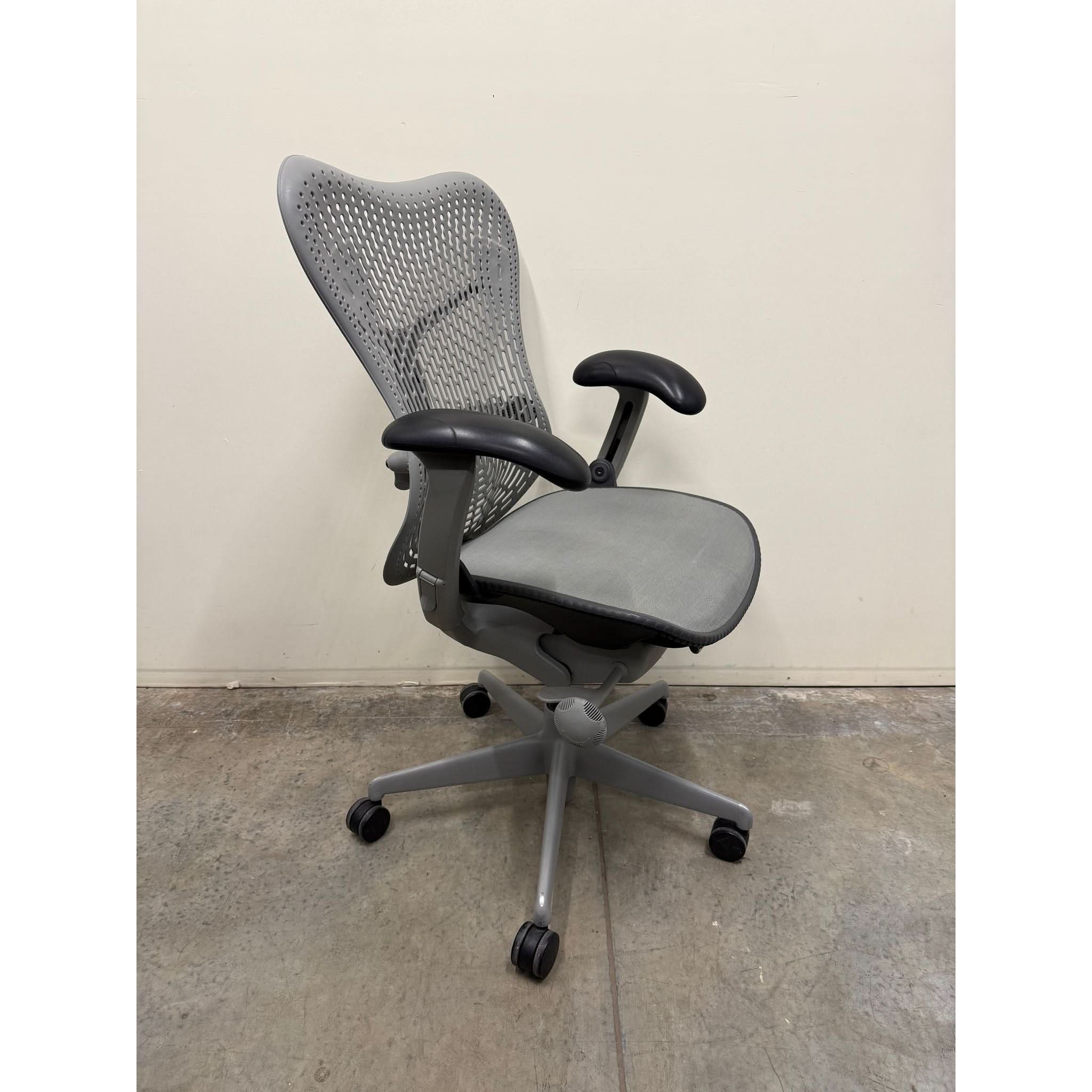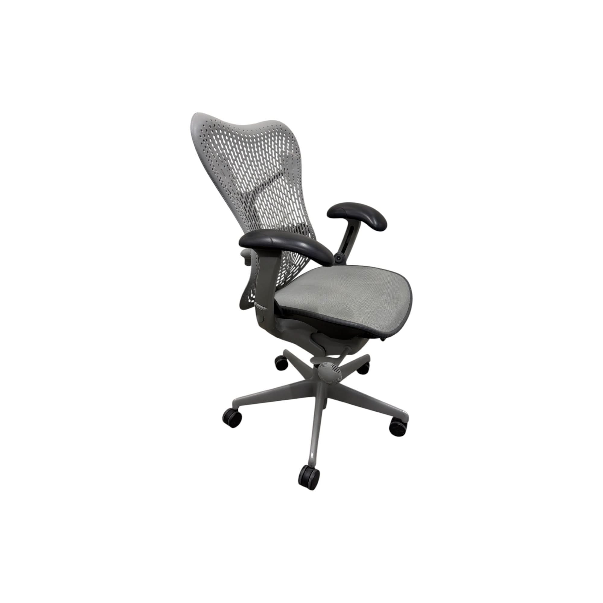 The Herman Miller Mirra 1 is a benchmark in ergonomic task seating, designed to support long hours of focused work. This model features a grey TriFlex polymer back, grey mesh seat, and fully adjustable armrests delivering responsive comfort, breathable support, and a timeless, modern aesthetic.