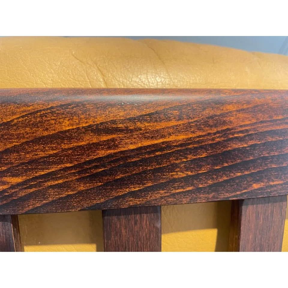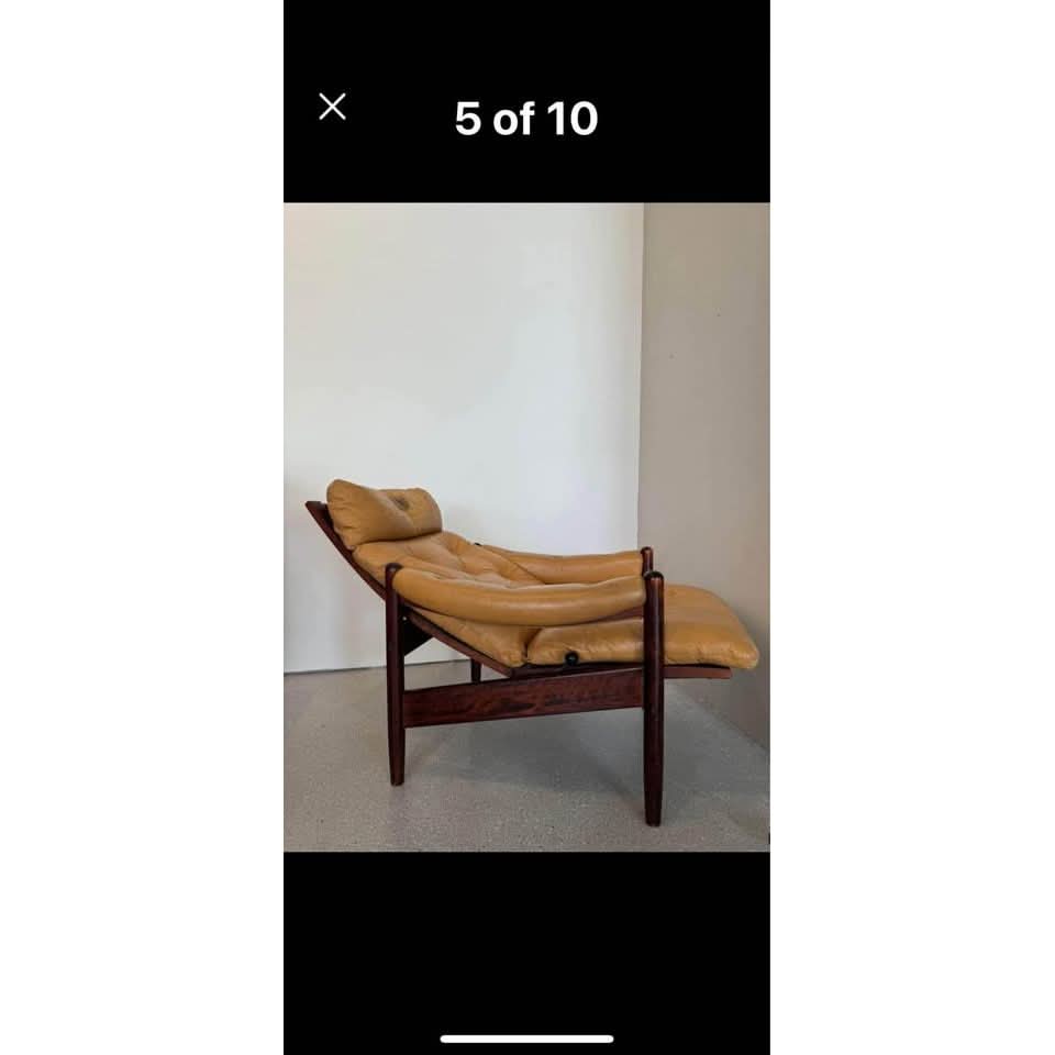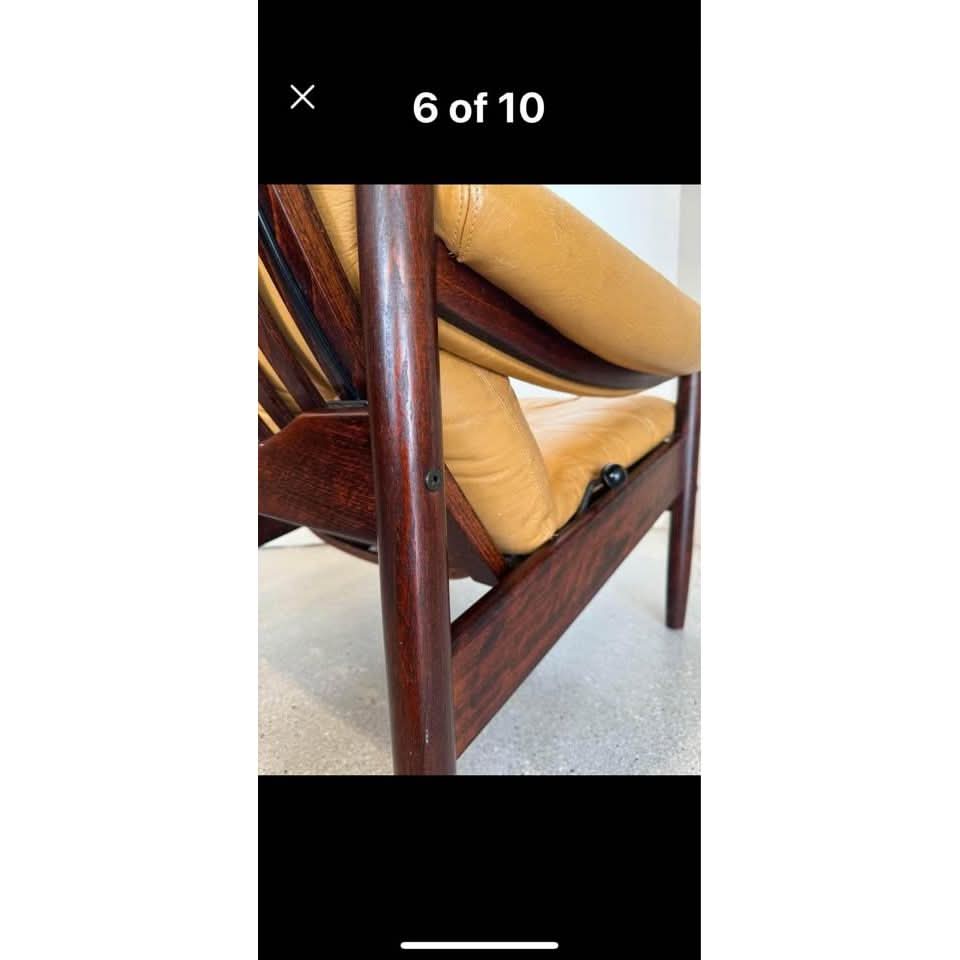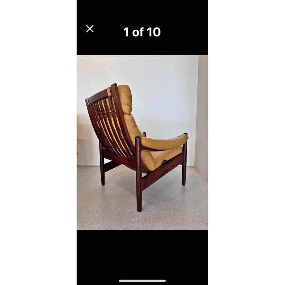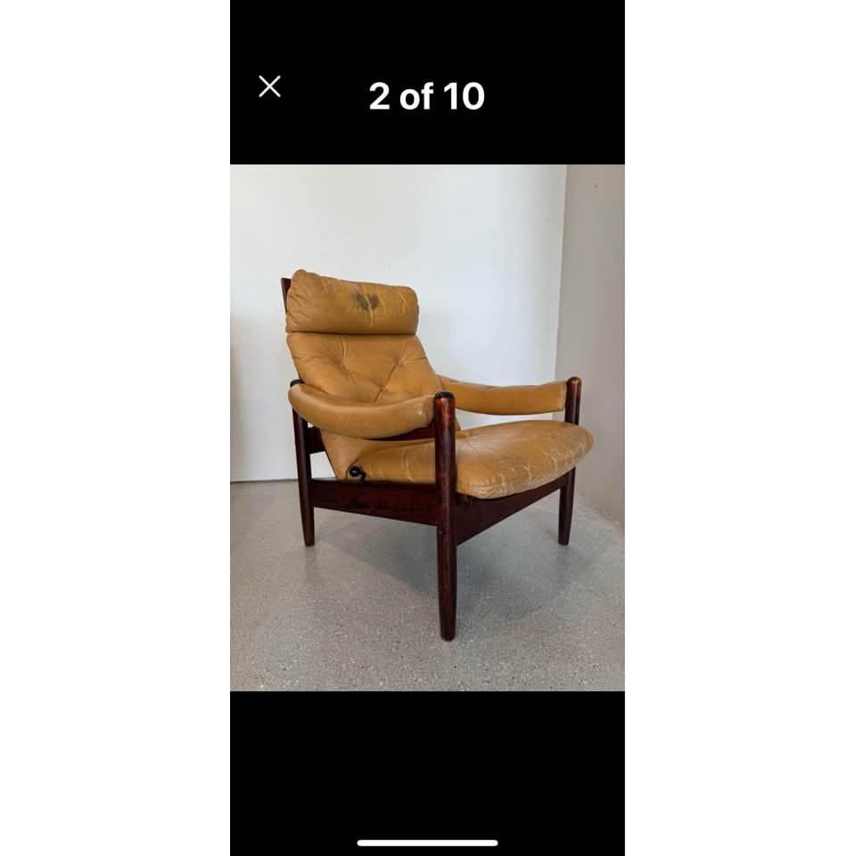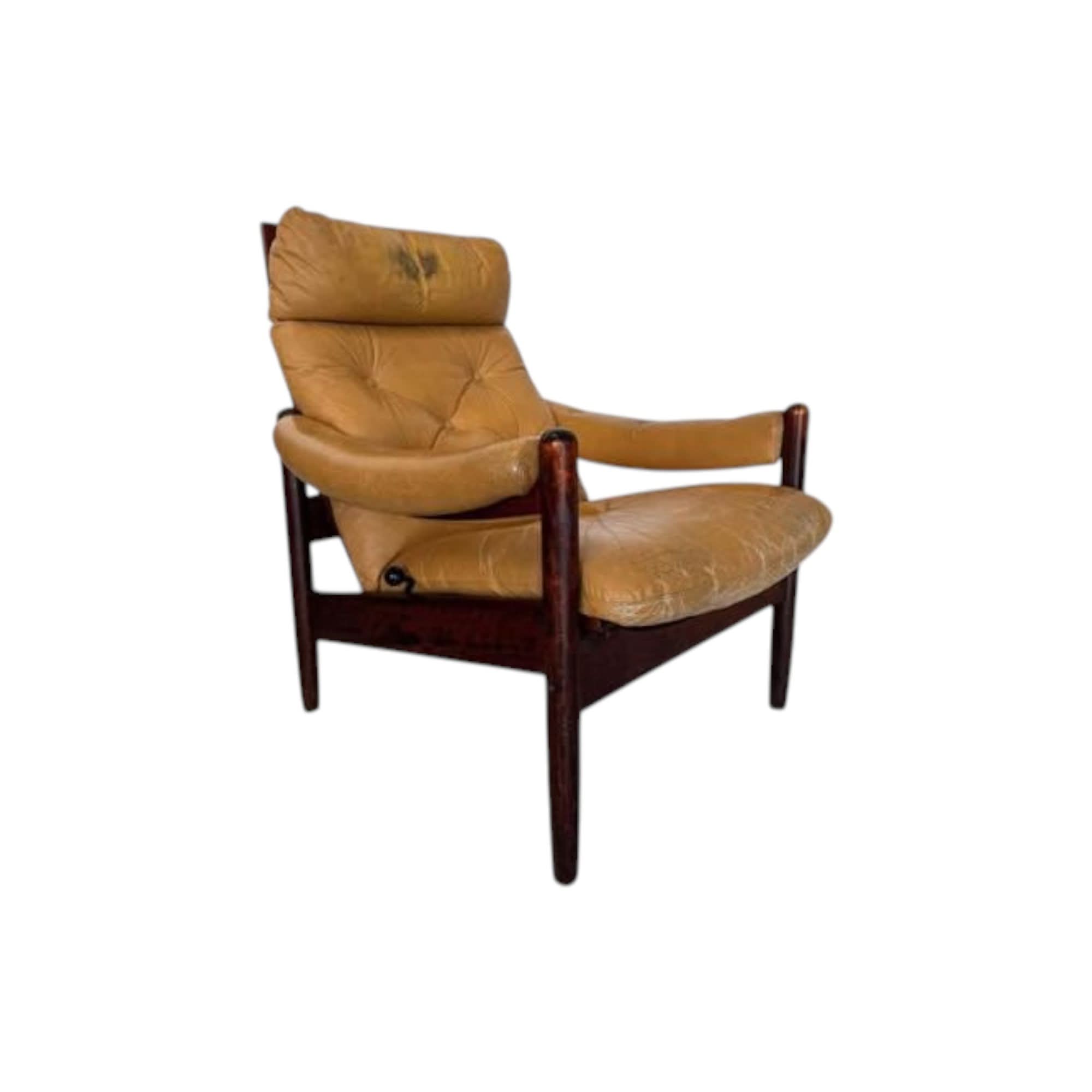 A classic 1960s–70s Norwegian lounge chair featuring a solid hardwood frame with rounded posts and tapered legs. The original caramel leather cushions are generously padded for comfort, with curved armrests that highlight the sculptural Scandinavian design. A timeless piece that blends warmth and elegance in any interior.