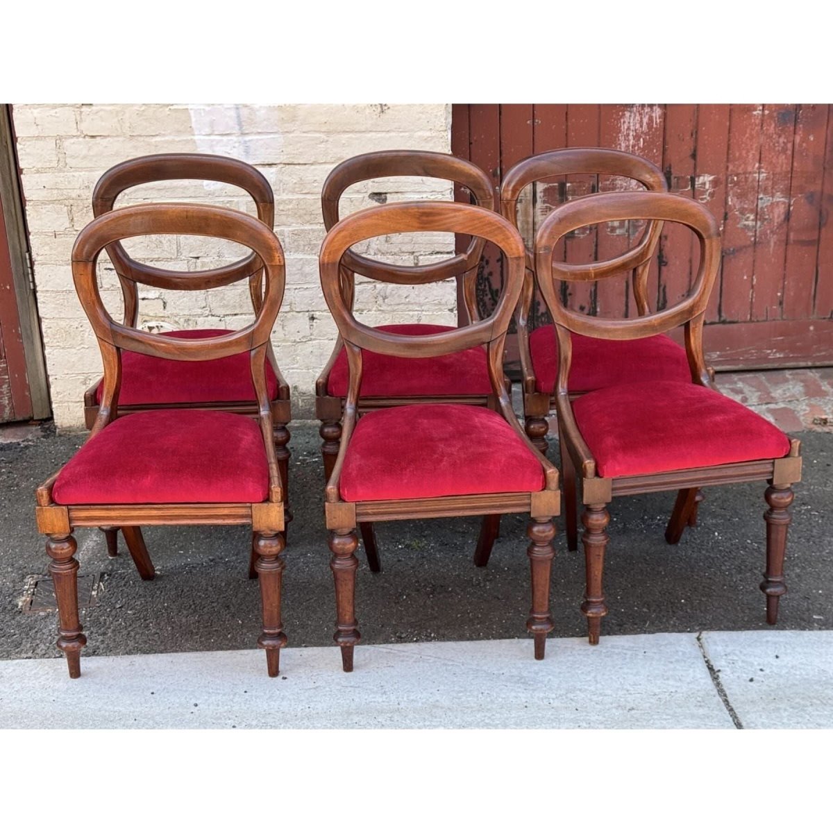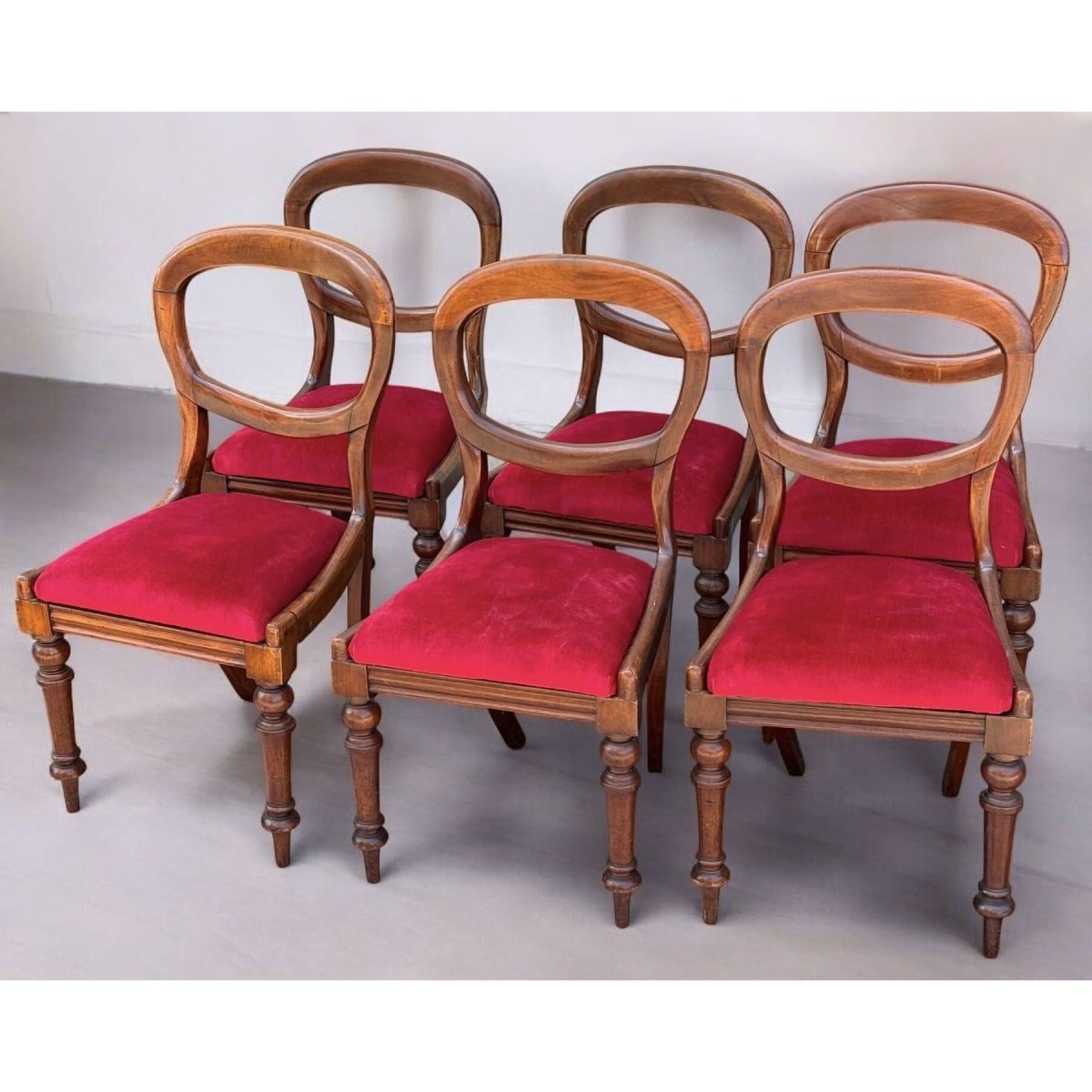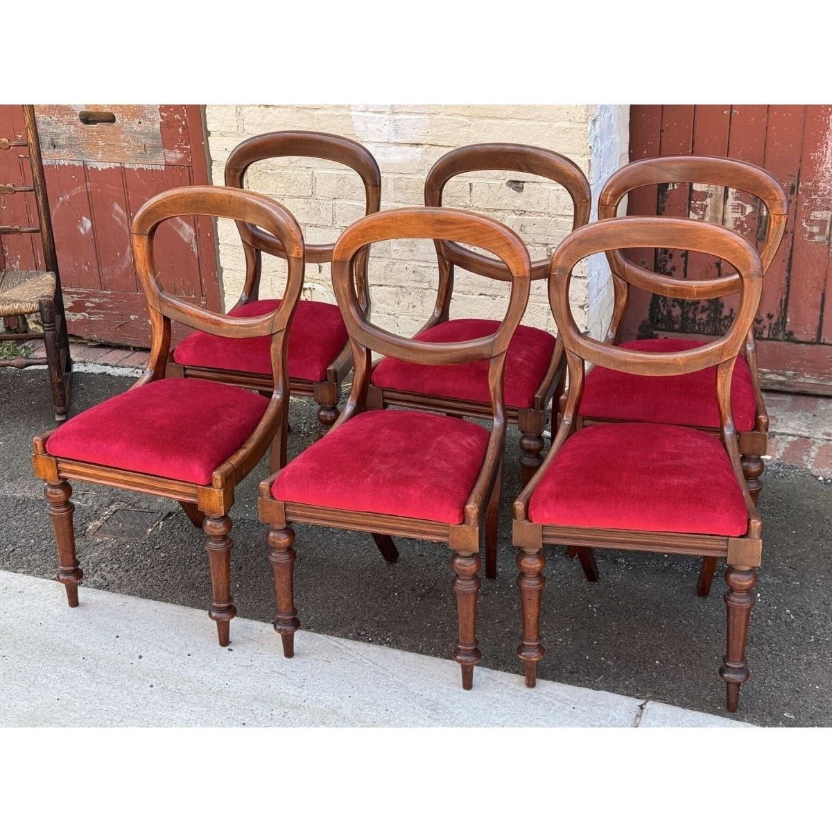 Set of six Australian cedar balloon-back chairs, with turned front legs, presently upholstered in red velvet – easily changed.