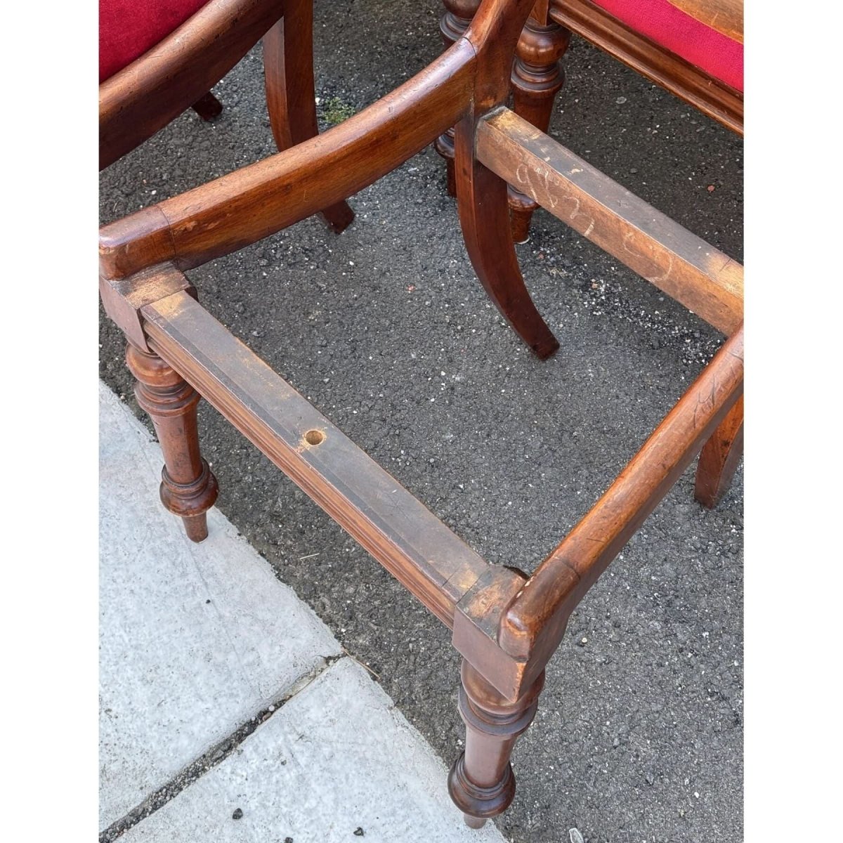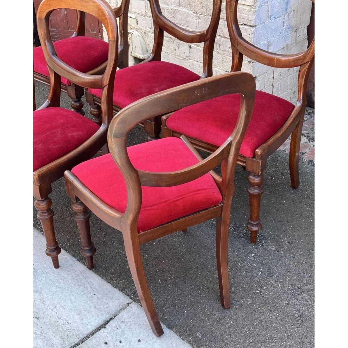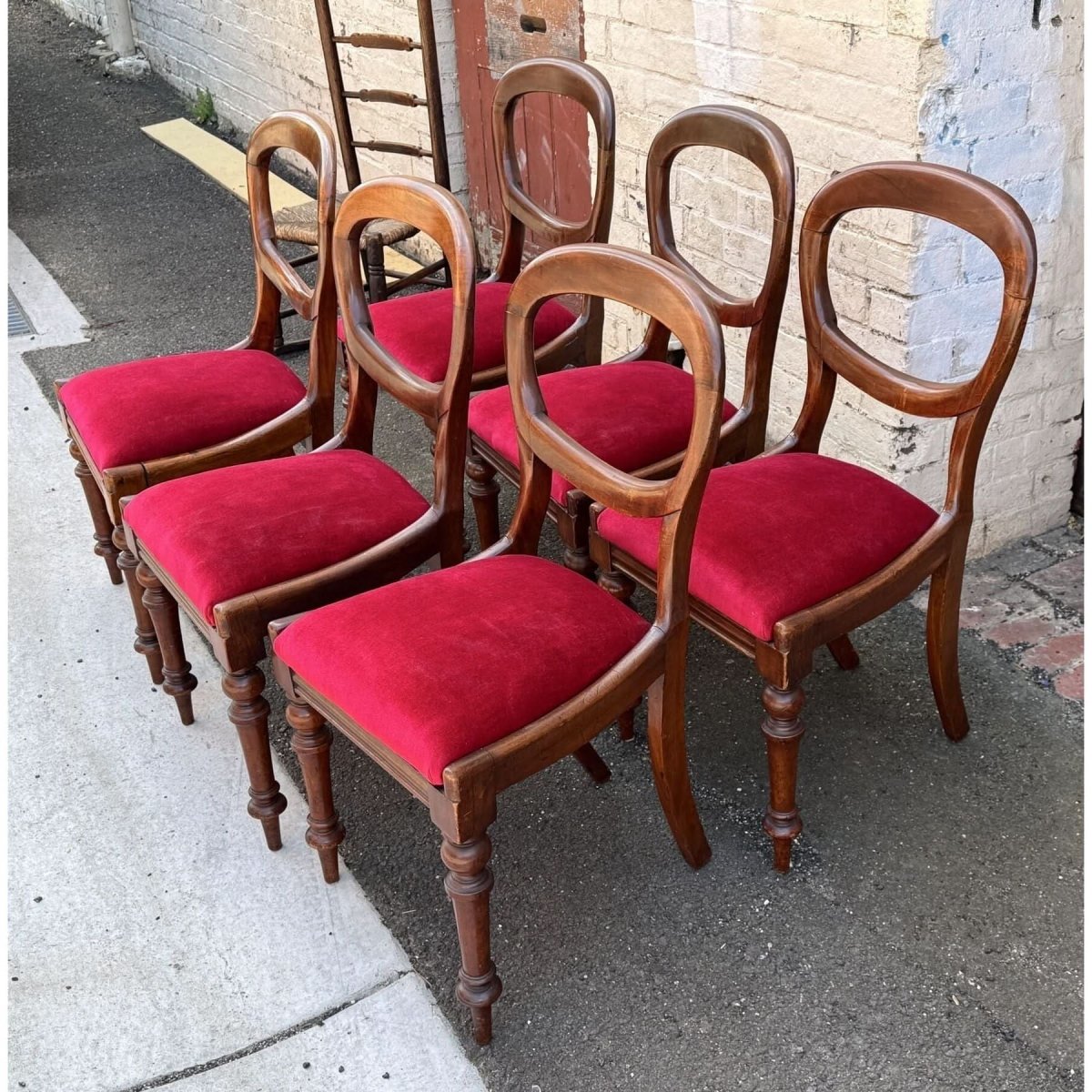 Set of six Australian cedar balloon-back chairs, with turned front legs, presently upholstered in red velvet – easily changed.