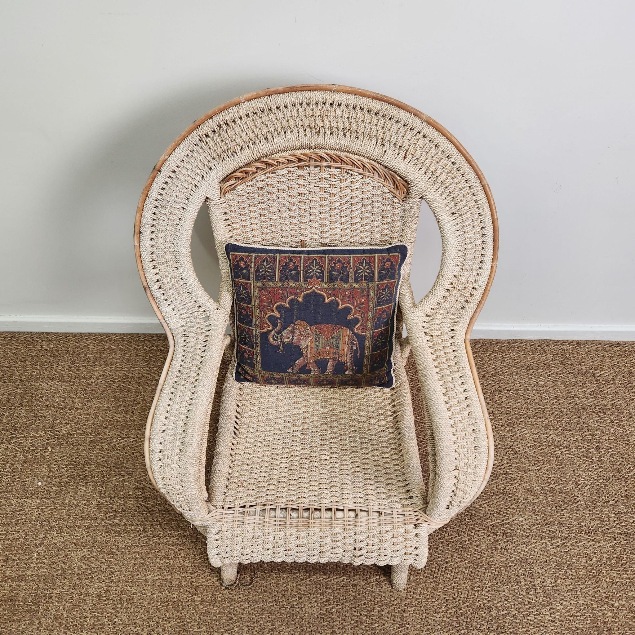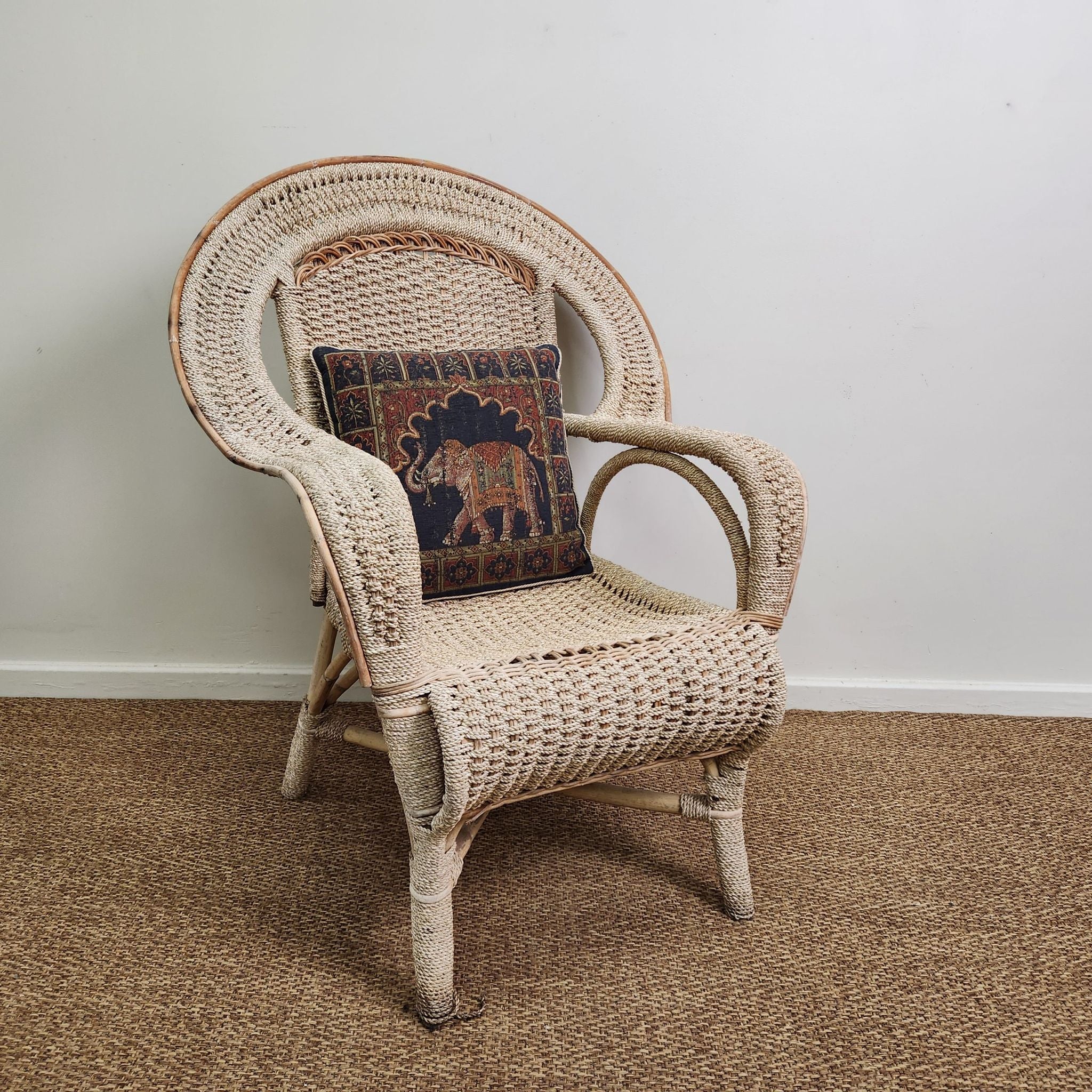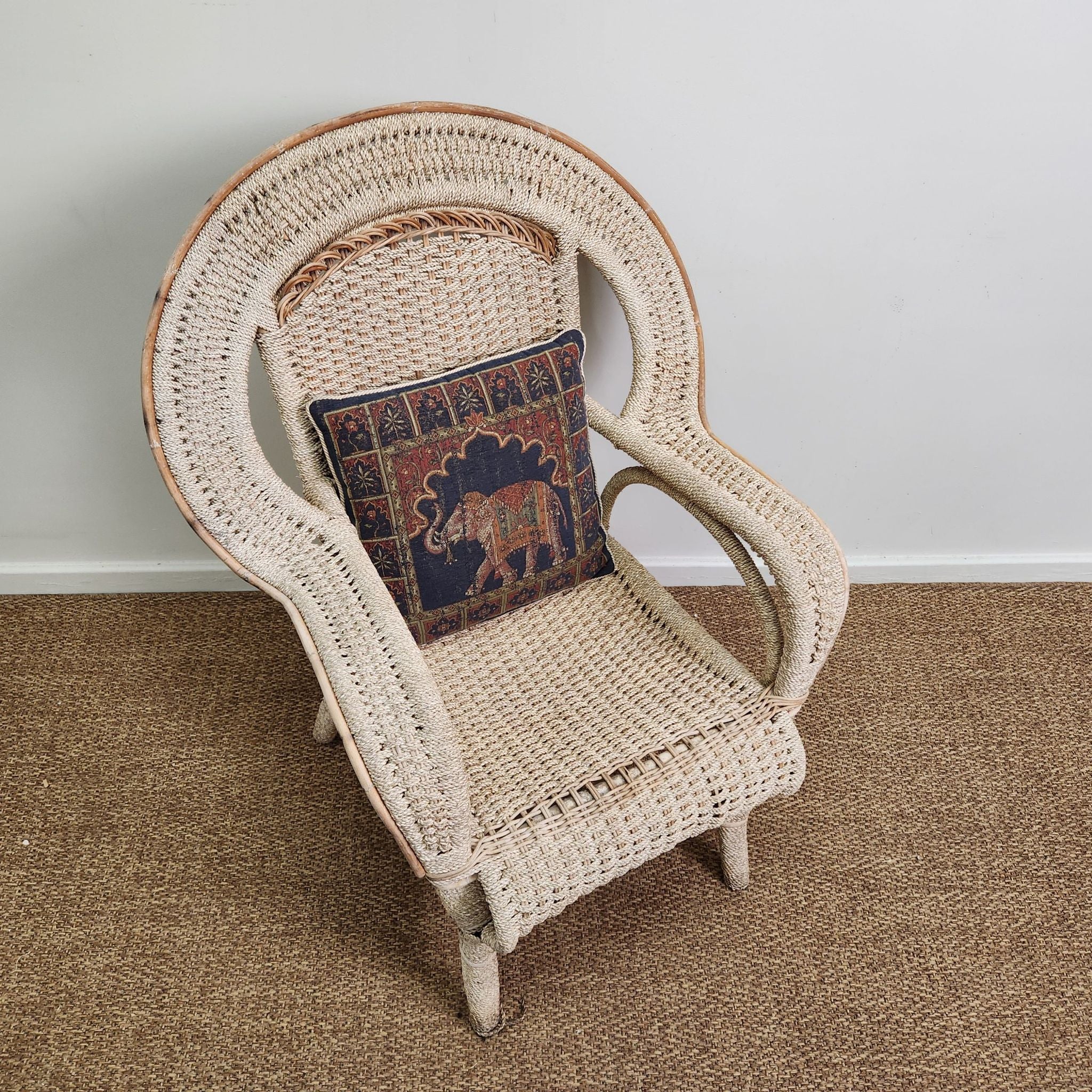 This swan style vintage woven cane armchair features a high, rounded back with integrated curved armrests. Its light cane finish adds an airy, textured element, making it a natural fit for coastal, Hamptons-inspired, or relaxed veranda and alfresco settings.