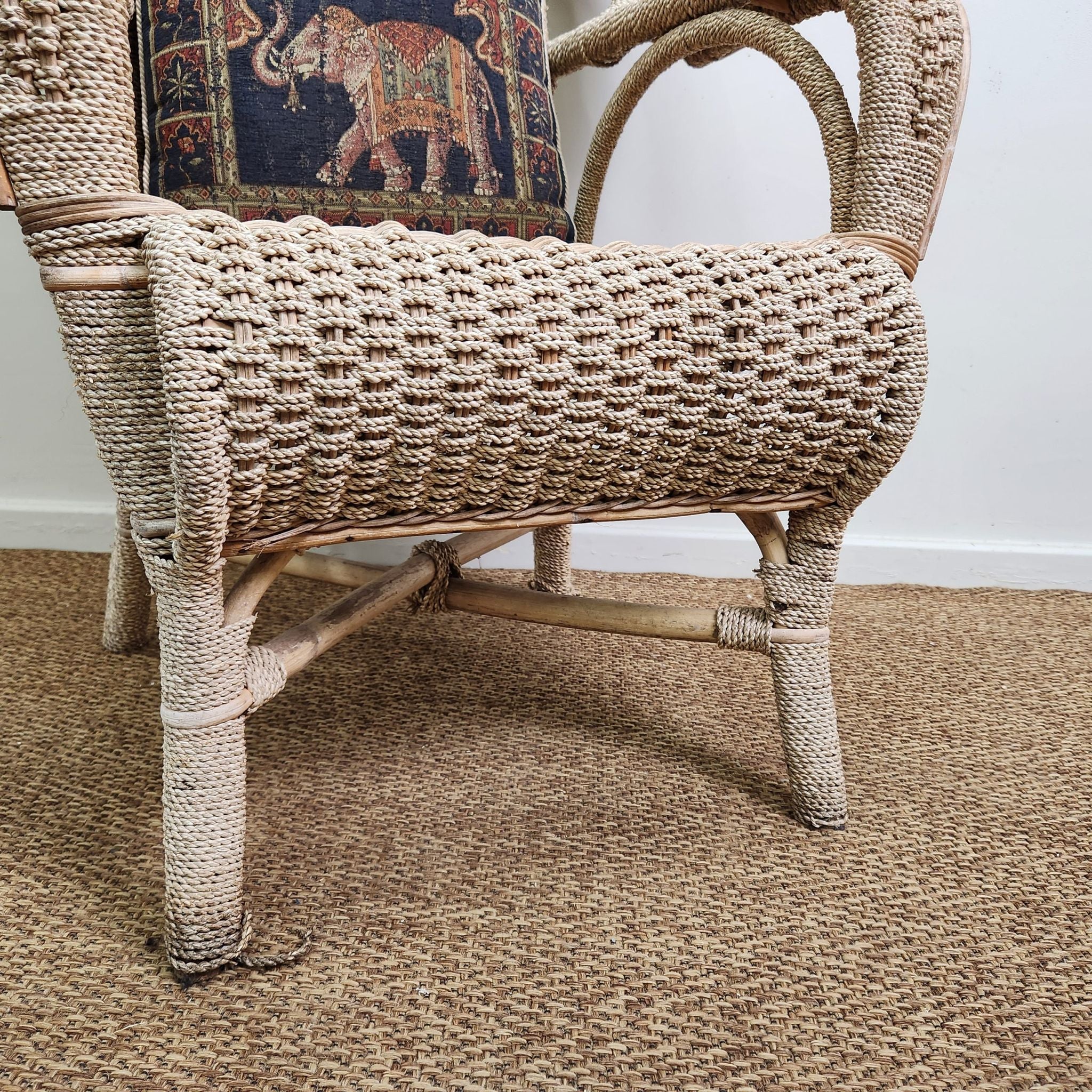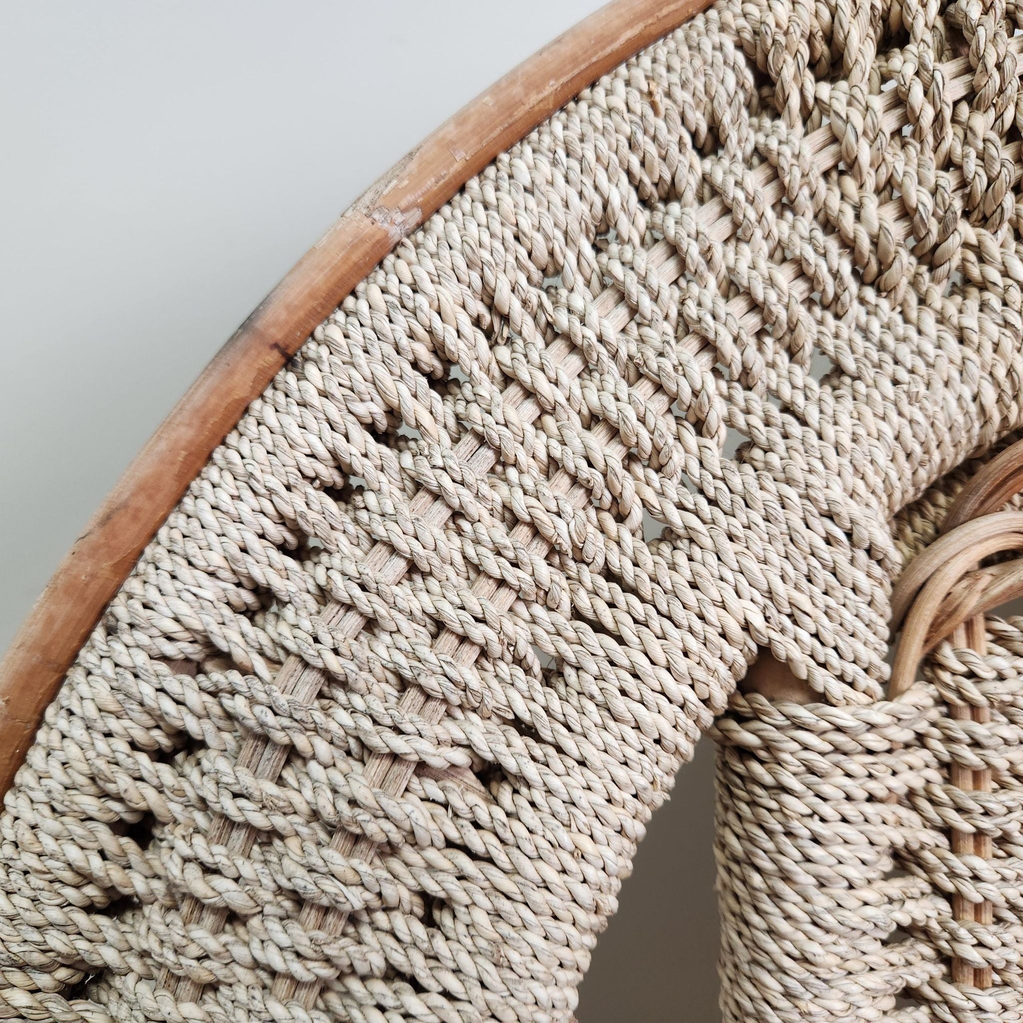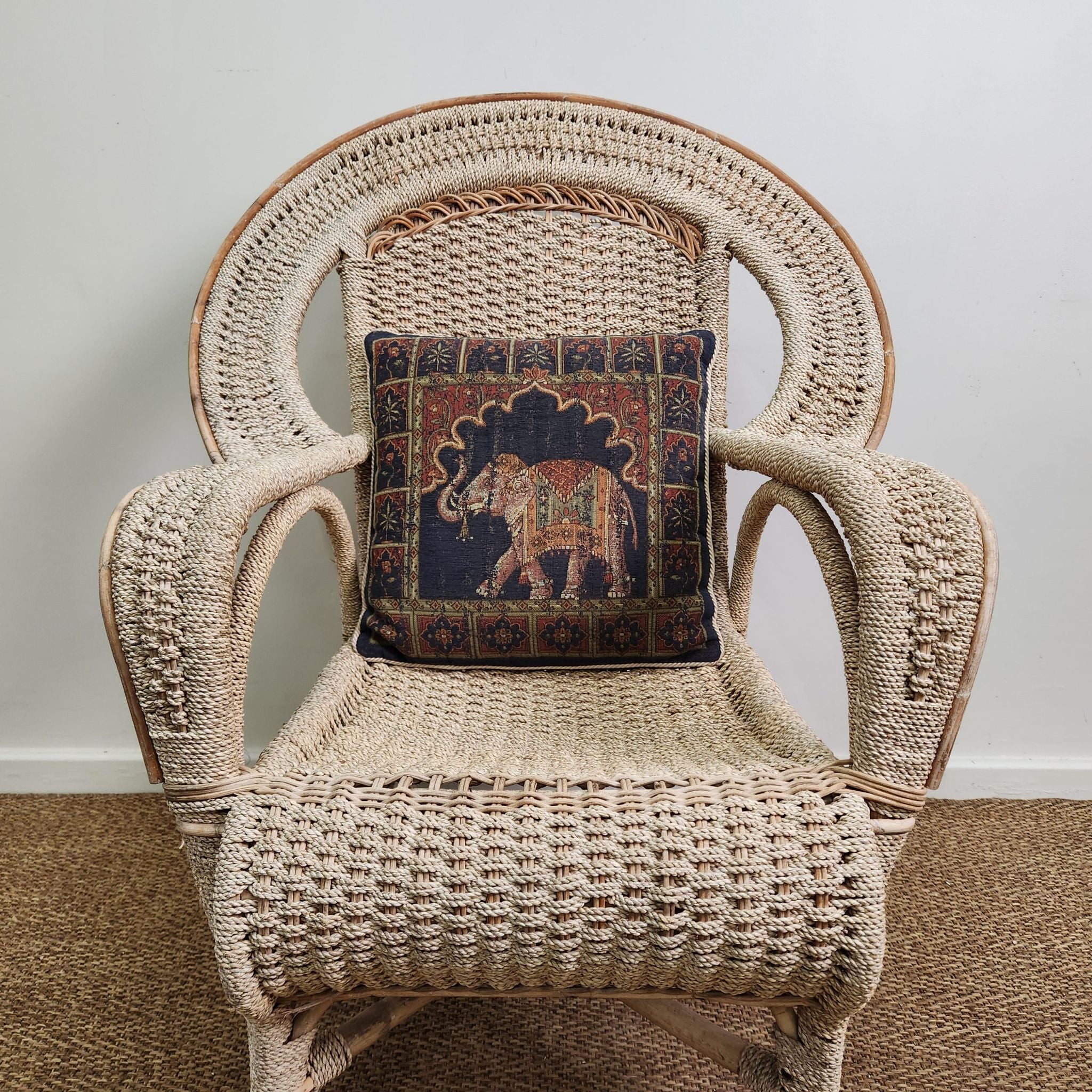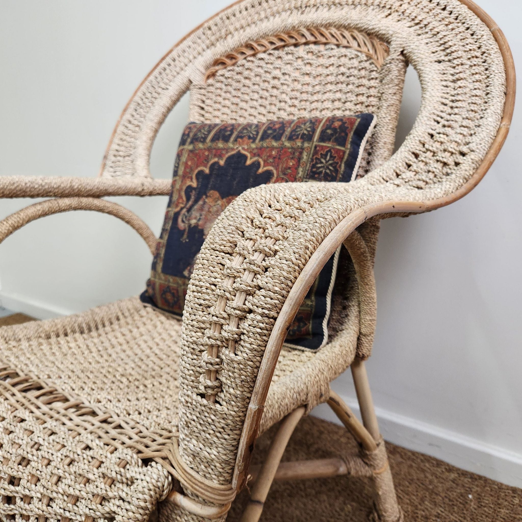 This swan style vintage woven cane armchair features a high, rounded back with integrated curved armrests. Its light cane finish adds an airy, textured element, making it a natural fit for coastal, Hamptons-inspired, or relaxed veranda and alfresco settings.